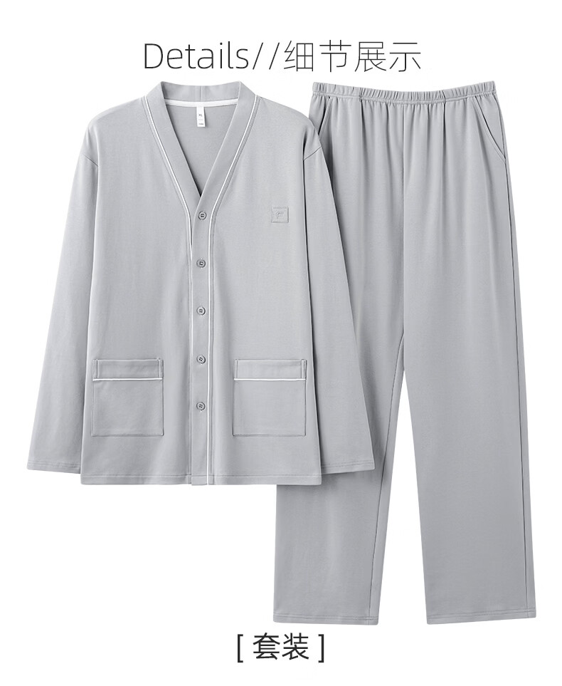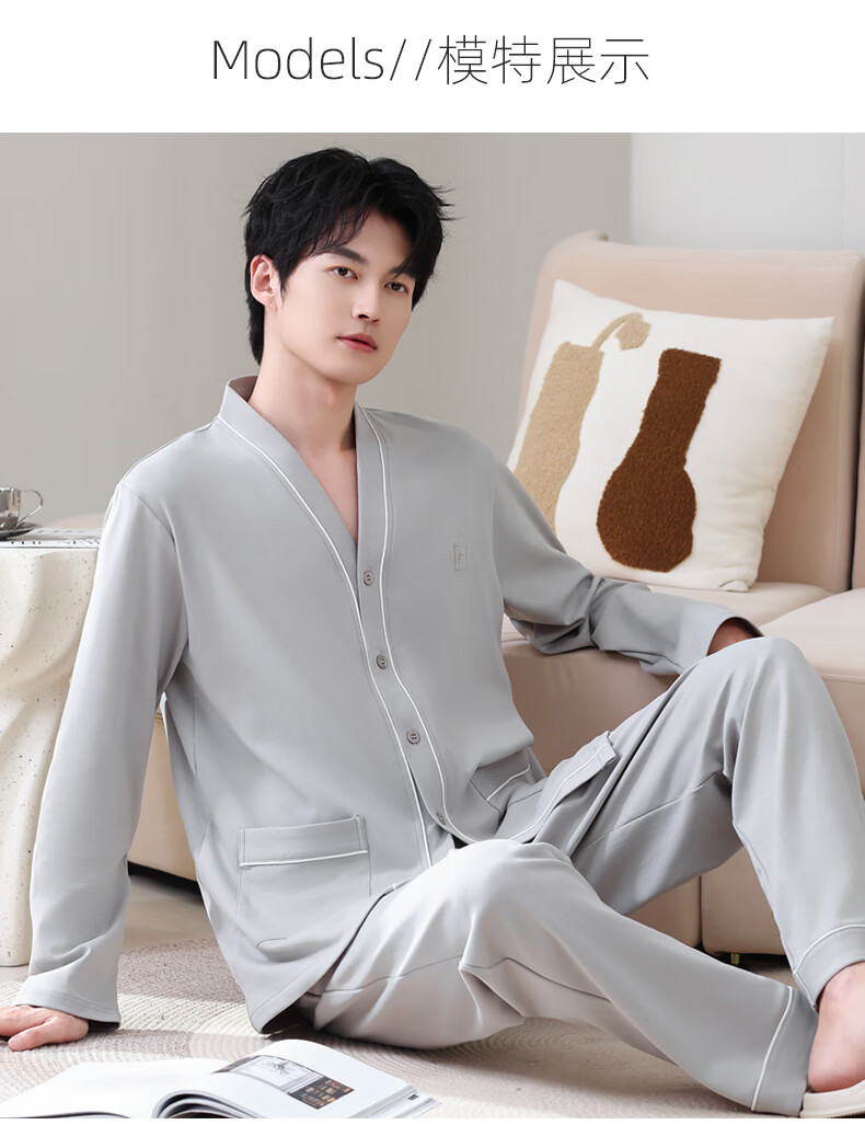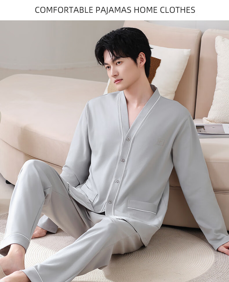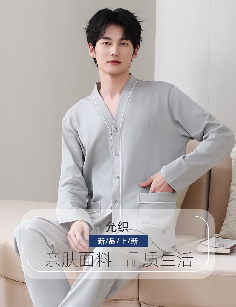 允织华夫格纯棉睡衣男春秋季新款长袖男士睡裤可外穿家居服秋冬天套装 8506-浅灰 L (170) :建议100-135斤穿着