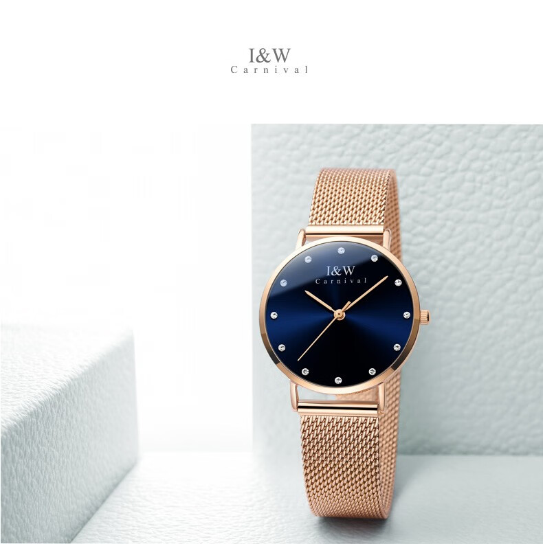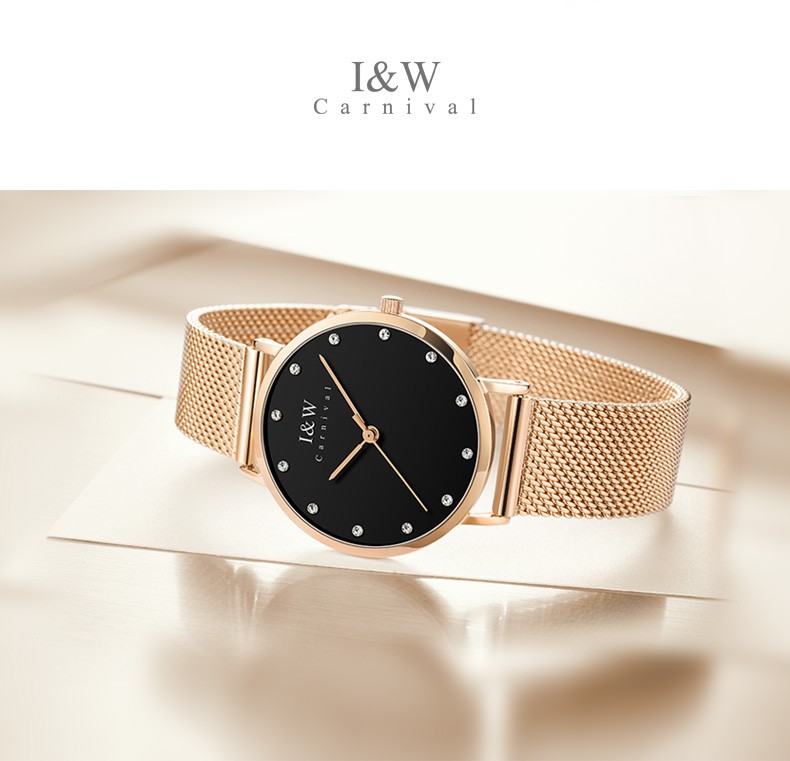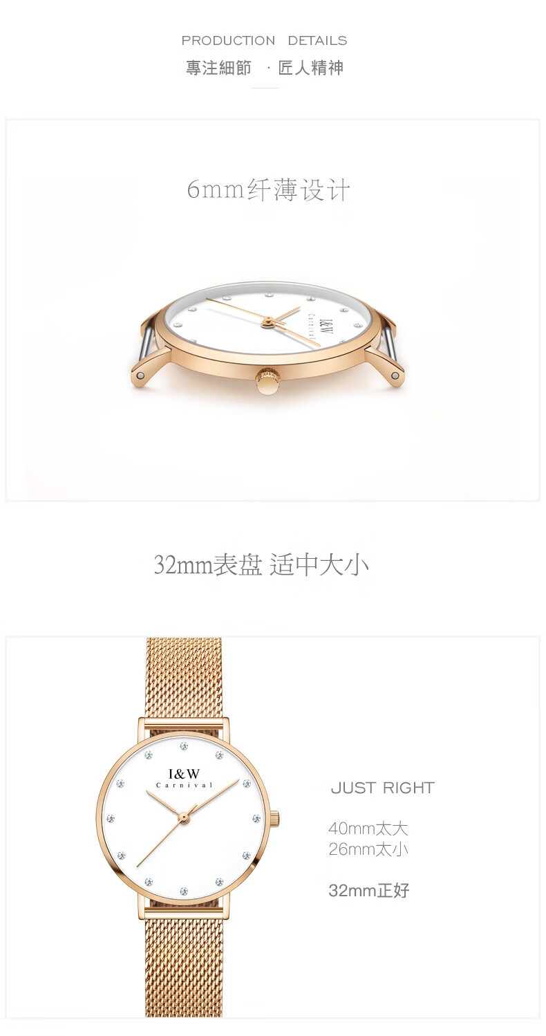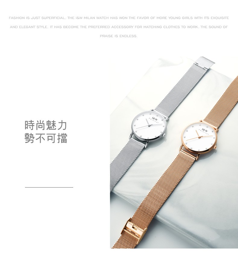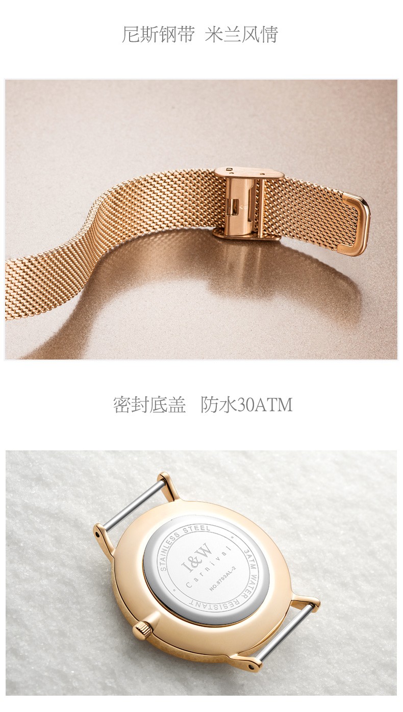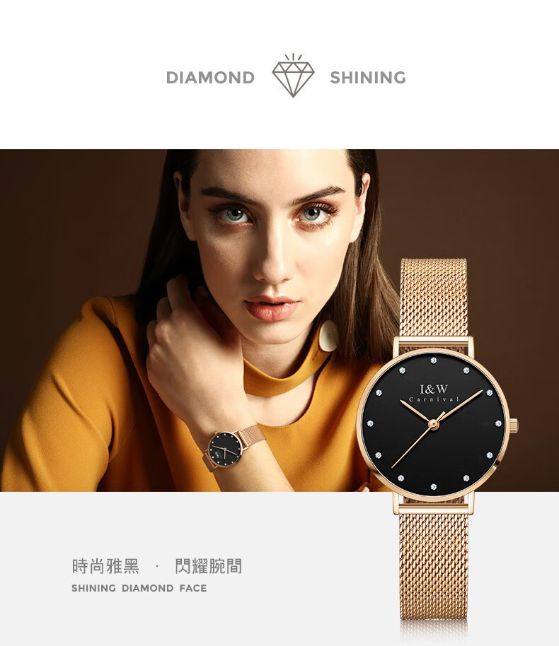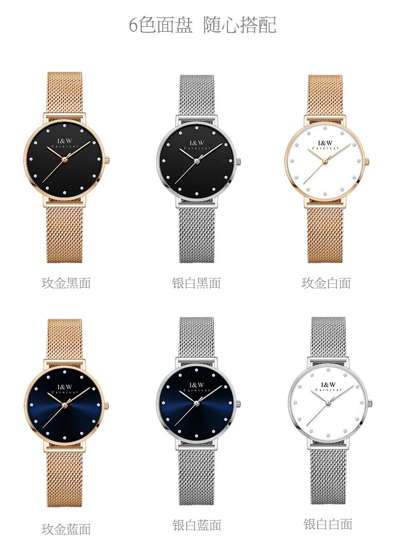 爱沃驰瑞士钻钉刻度纤薄时尚防水石英手表女士表七夕生日礼物送女友 银壳黑面|银网带