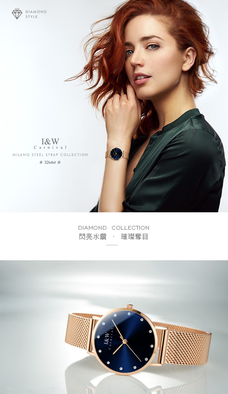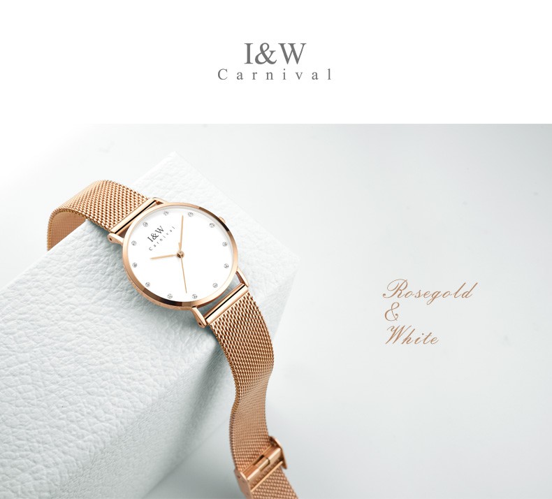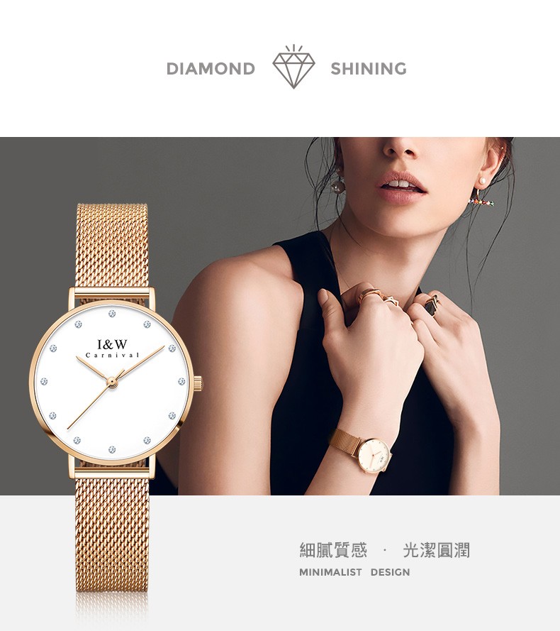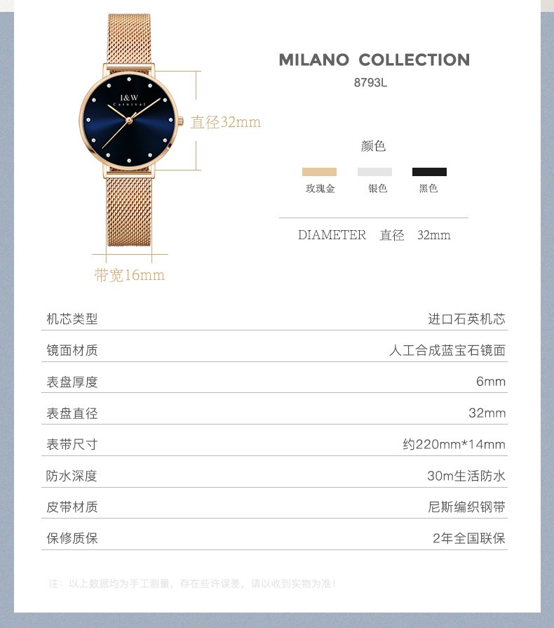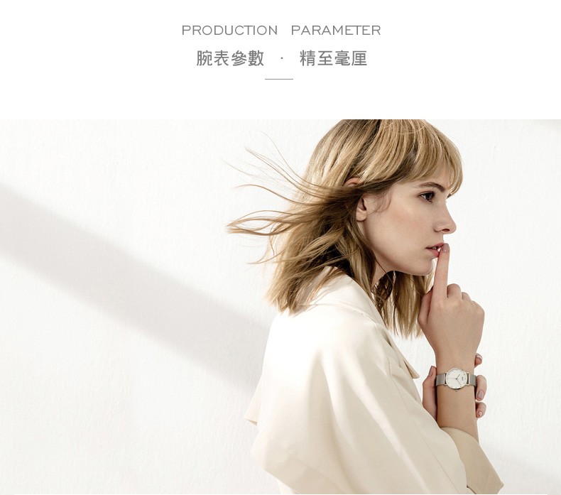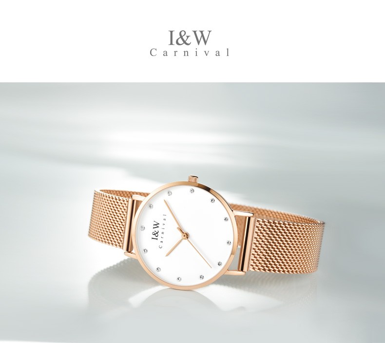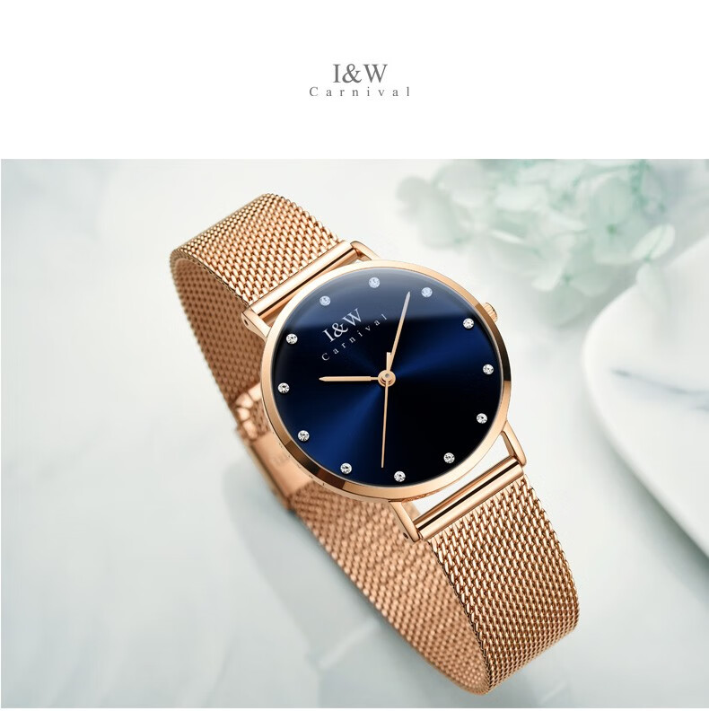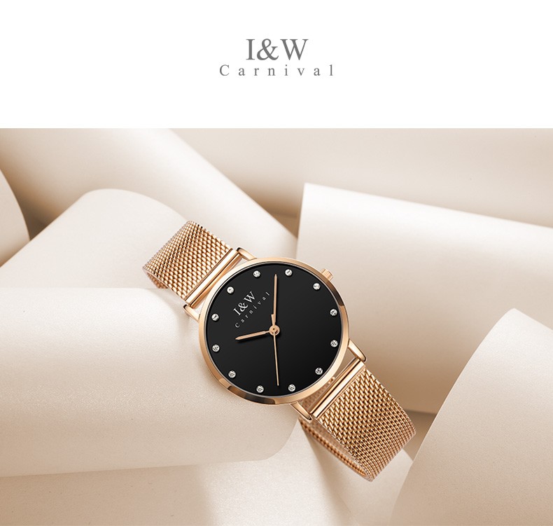 爱沃驰瑞士钻钉刻度纤薄时尚防水石英手表女士表七夕生日礼物送女友 银壳黑面|银网带