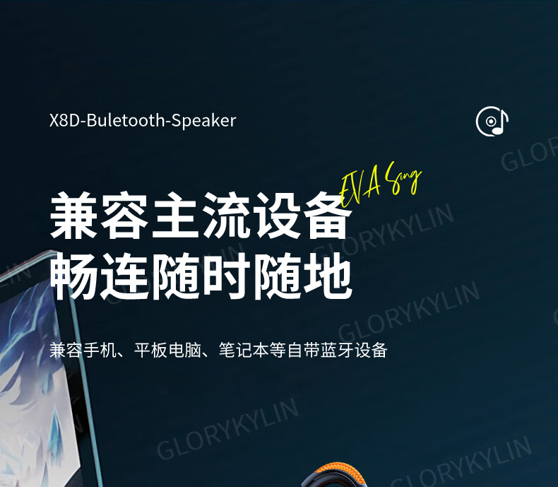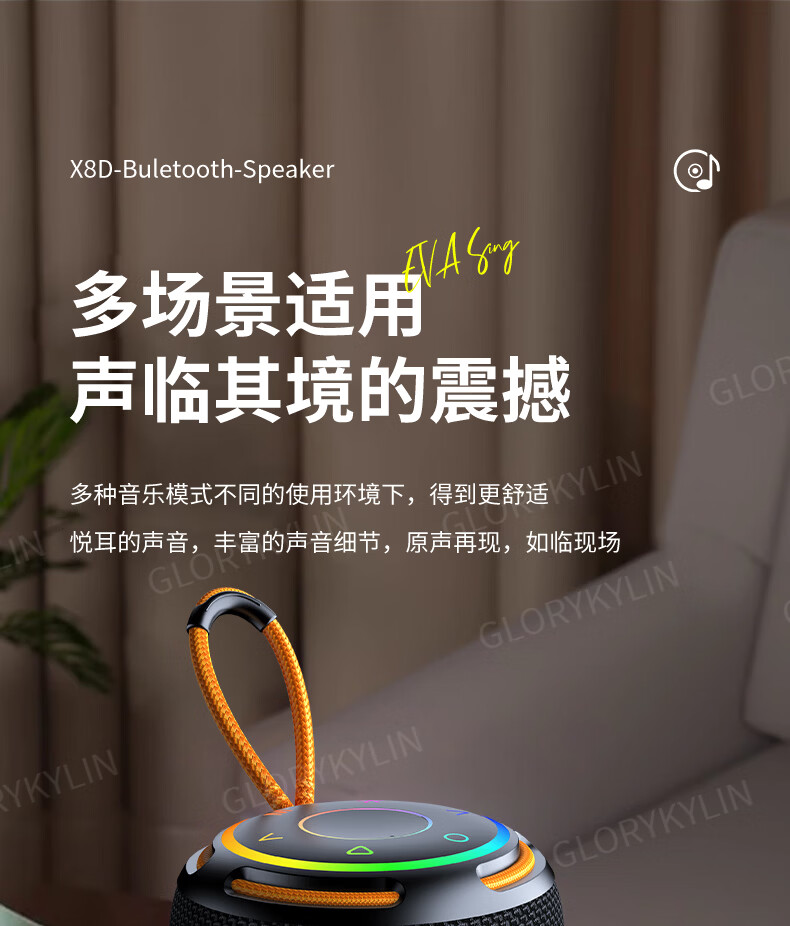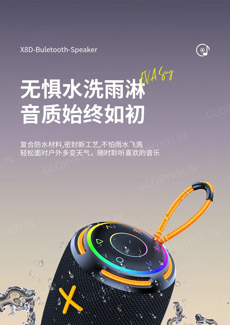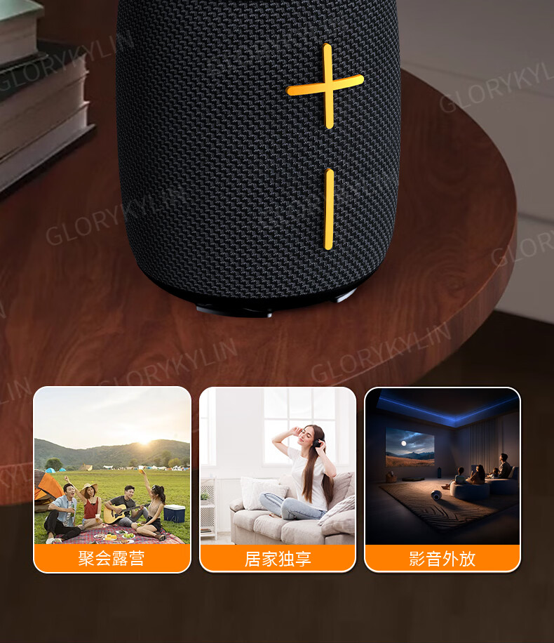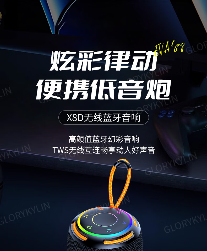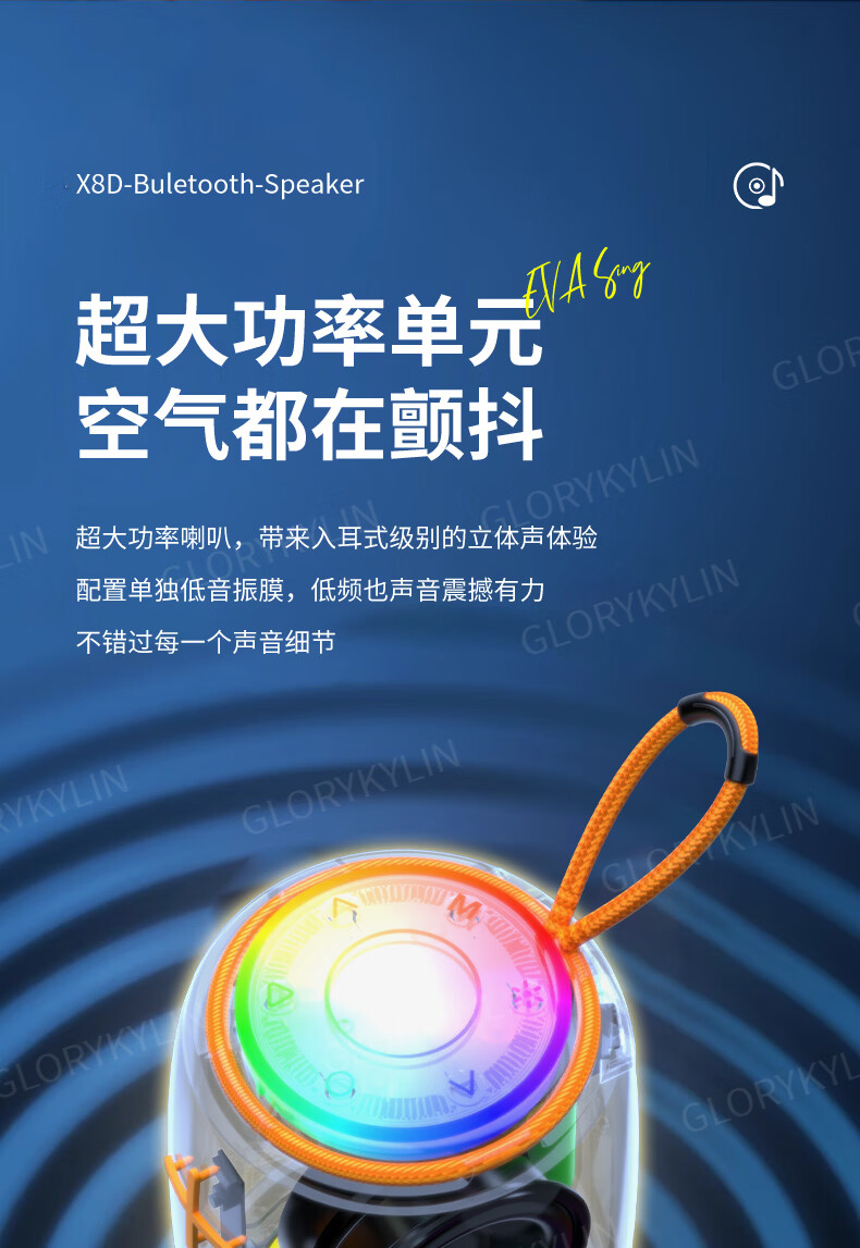 GloryKylin立体环绕音无线蓝牙音响便携重低音炮大音量TWS音箱桌面家用户外骑行车载通用超长待机支持插卡U盘 X8D炫酷黑橙【防水/防摔+360°环绕音感】 官方标配