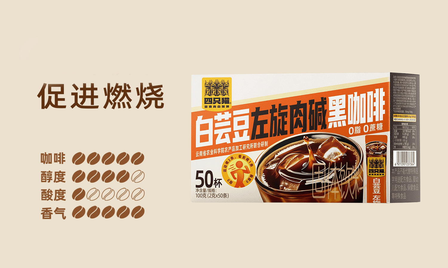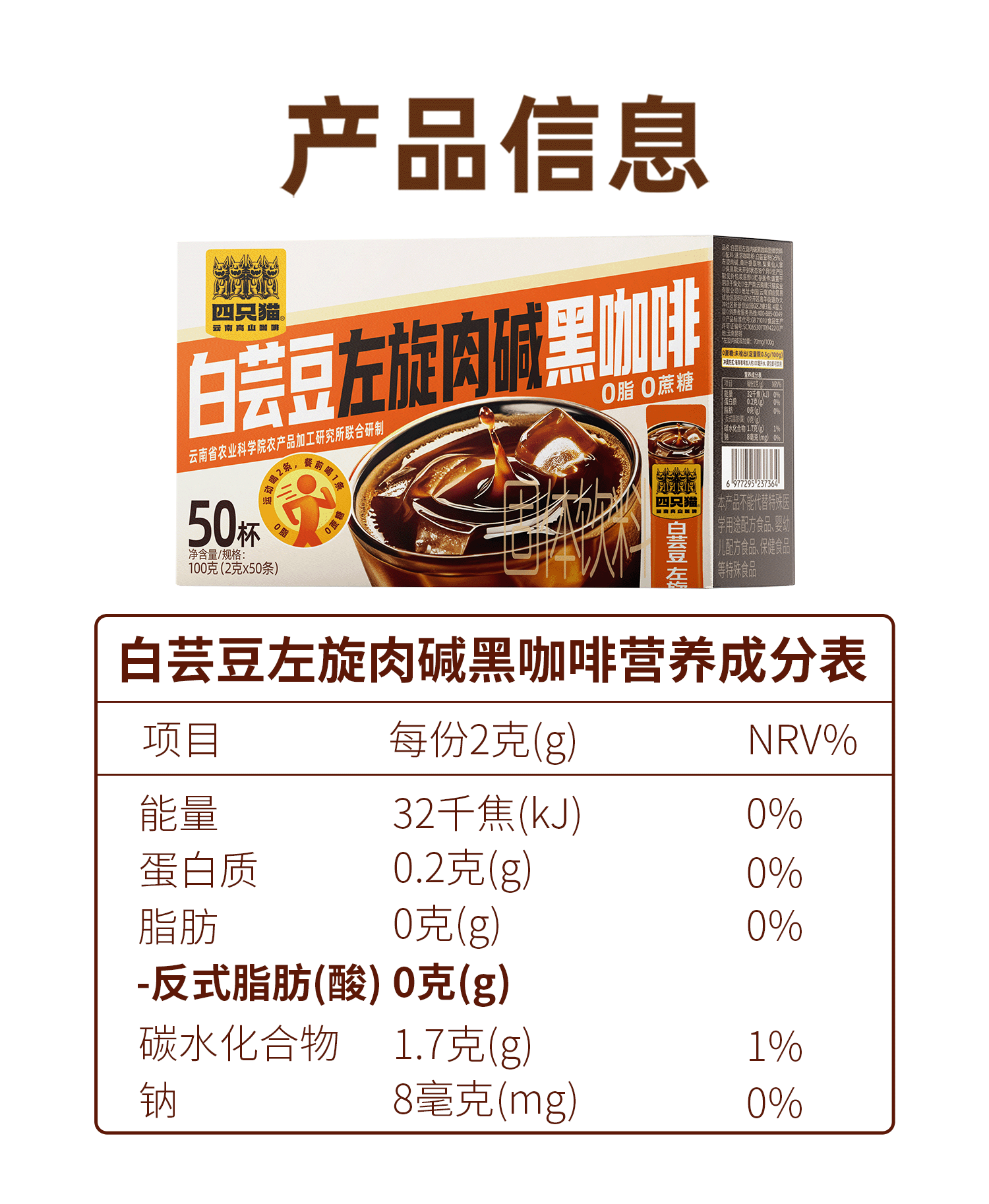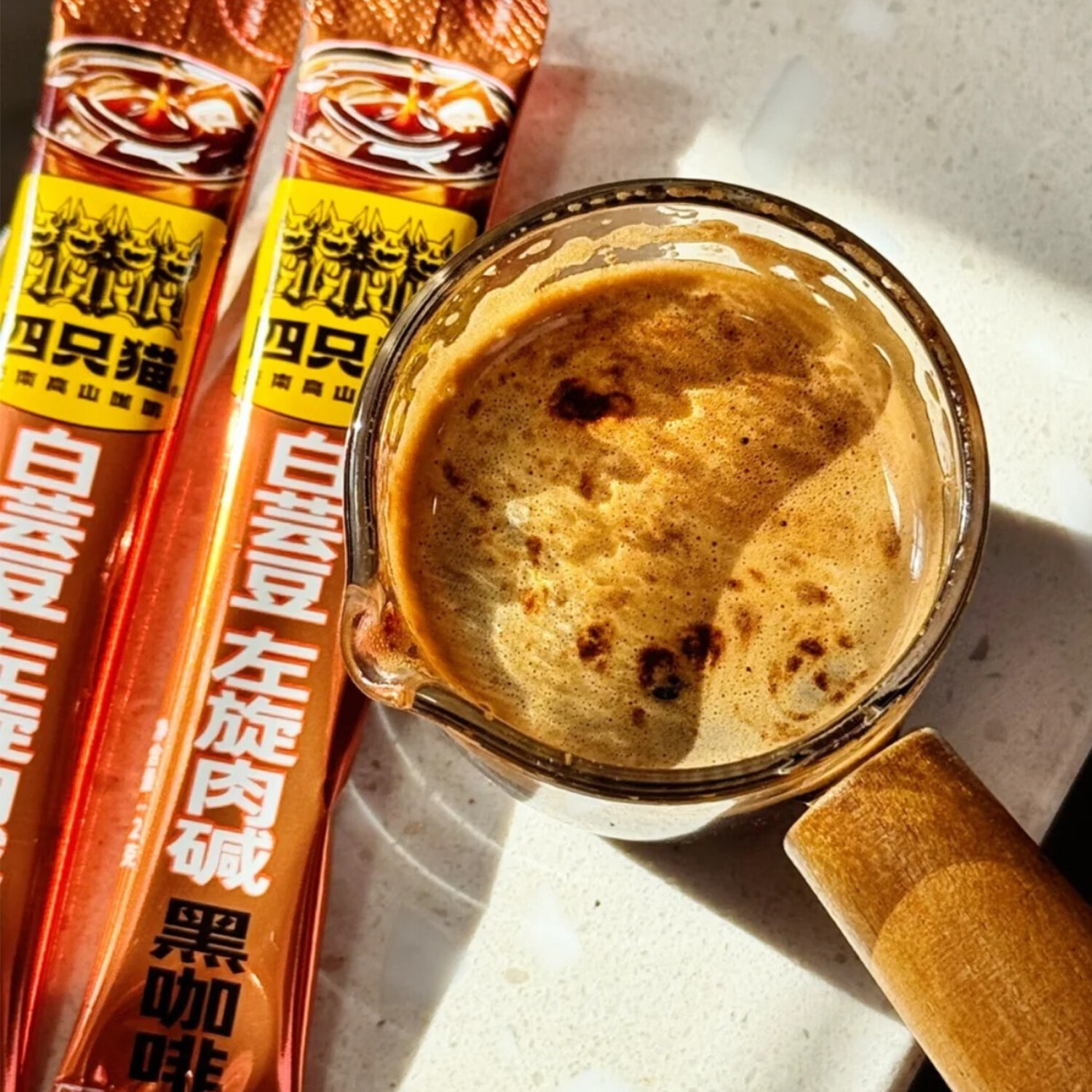 四只猫咖啡白芸豆左旋肉碱黑咖啡 速溶咖啡粉 办公健身搭档2g*50条/袋 白芸豆左旋肉碱 黑咖啡 50条