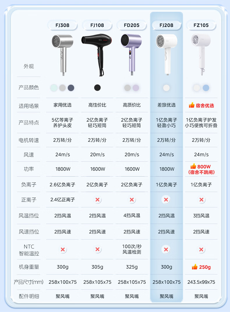 美的(Midea)1亿负离子电吹风 护发不伤发吹风机 大功率快干家用吹风筒 FJ208-极地白1800W 新年礼物 生日礼物