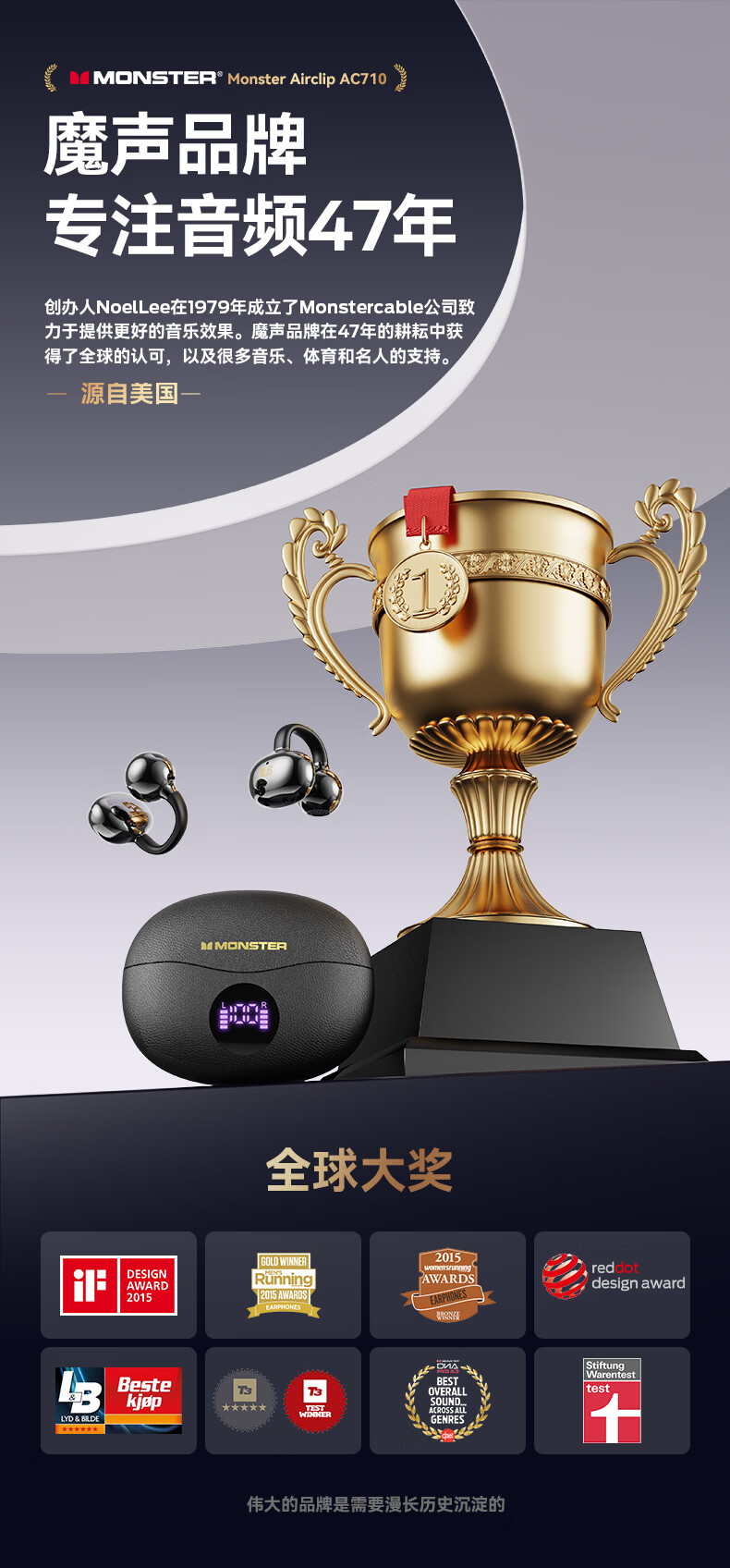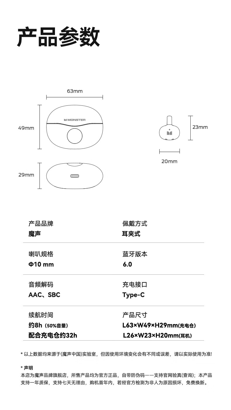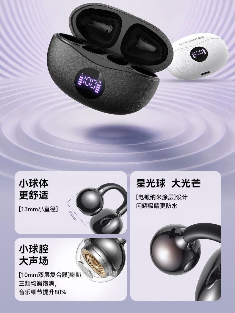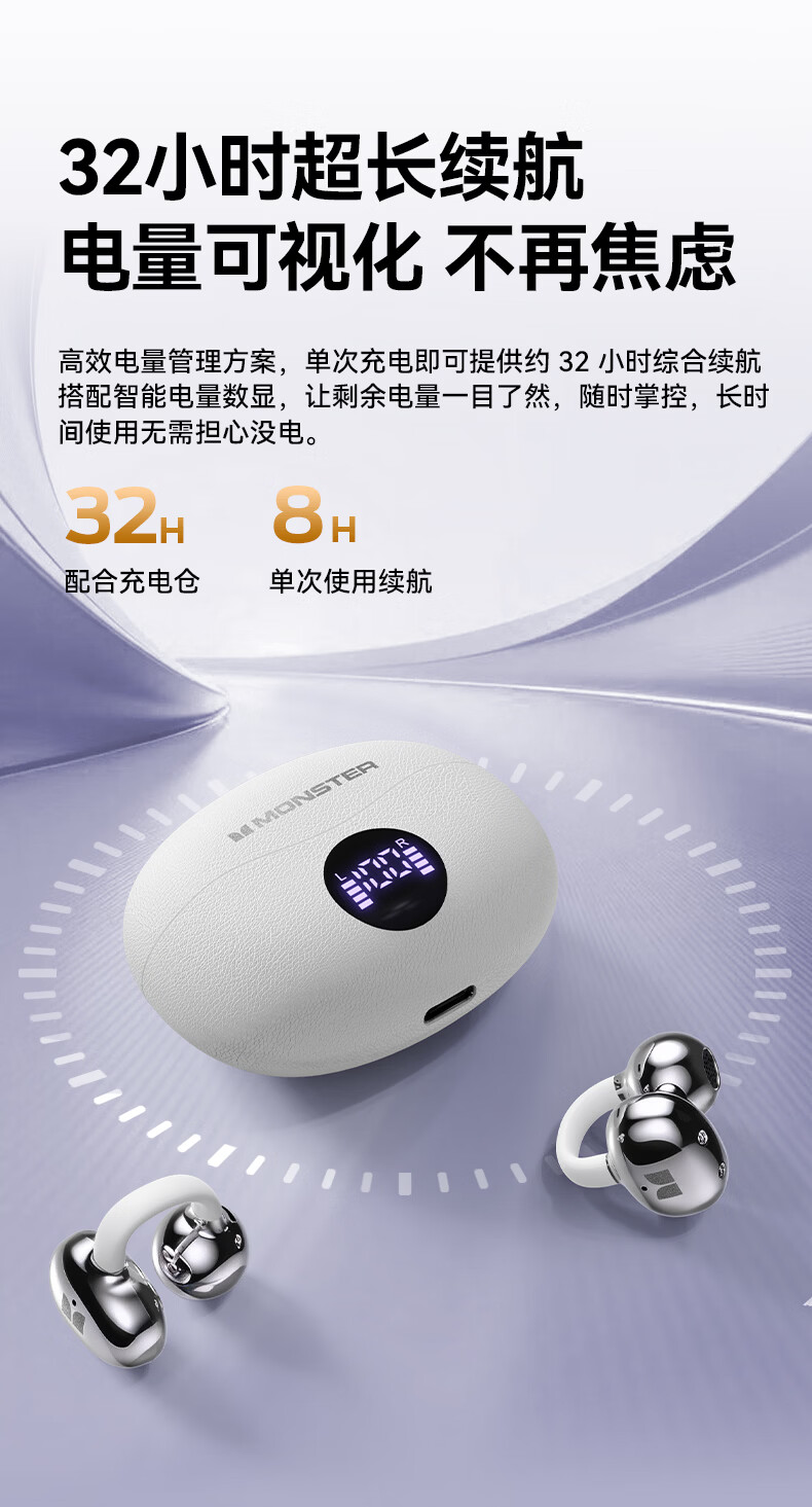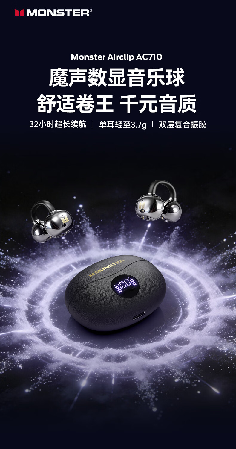 魔声(Monster)Airclip AC710 蓝牙耳机无线降噪运动耳夹式骨传导概念开放不入耳舒适佩戴大电量超长续航数显屏 黑色【磨砂数显版+32h续航+单耳3.7g】