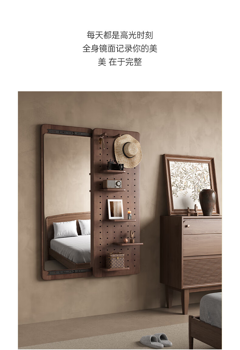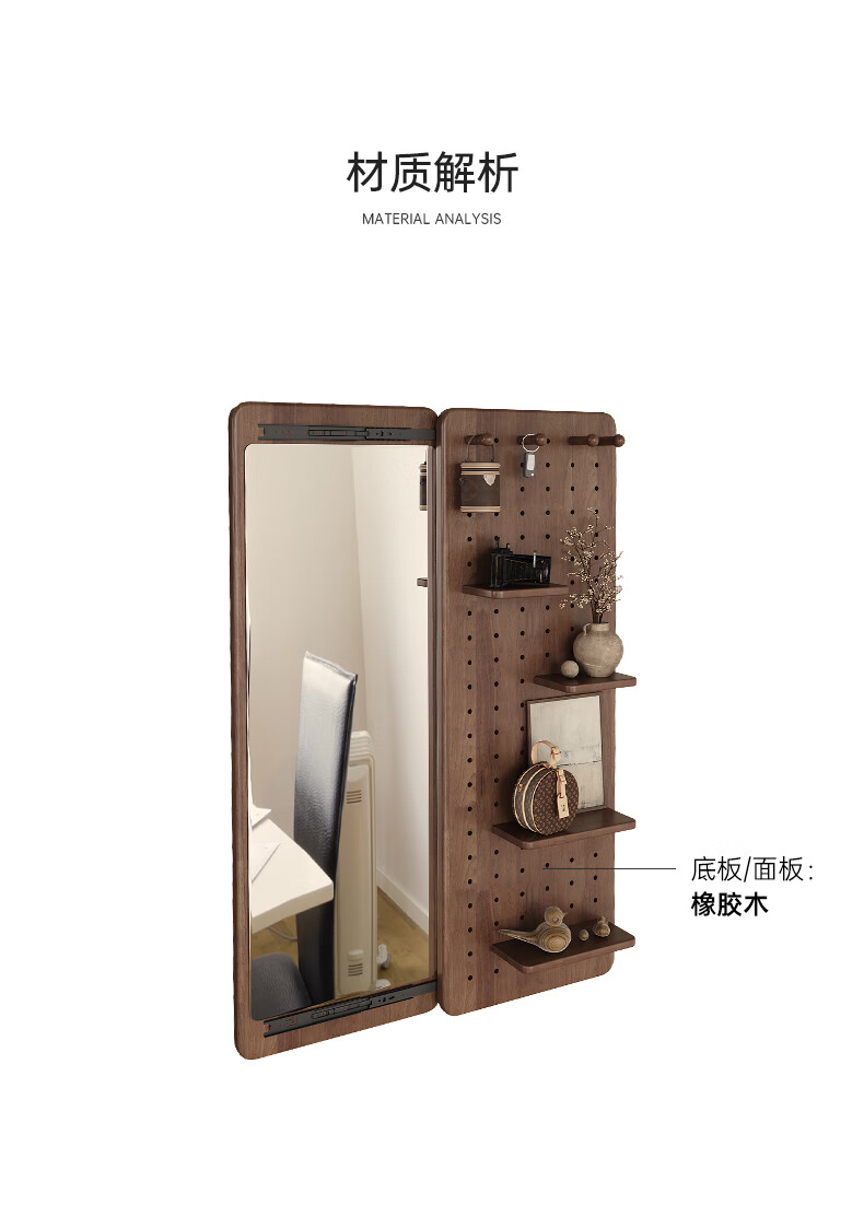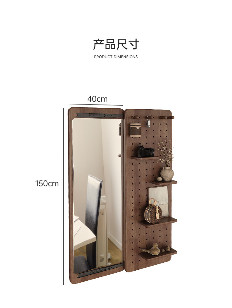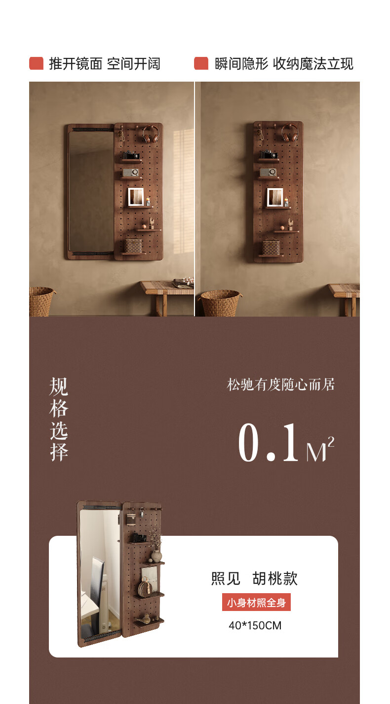 索菲亚实木洞洞板穿衣镜玄关隐藏式推拉全身镜子家用书房壁挂试衣镜贴墙 【进口FAS级橡胶木】胡桃木色40*150CM 【送货上门包安装】