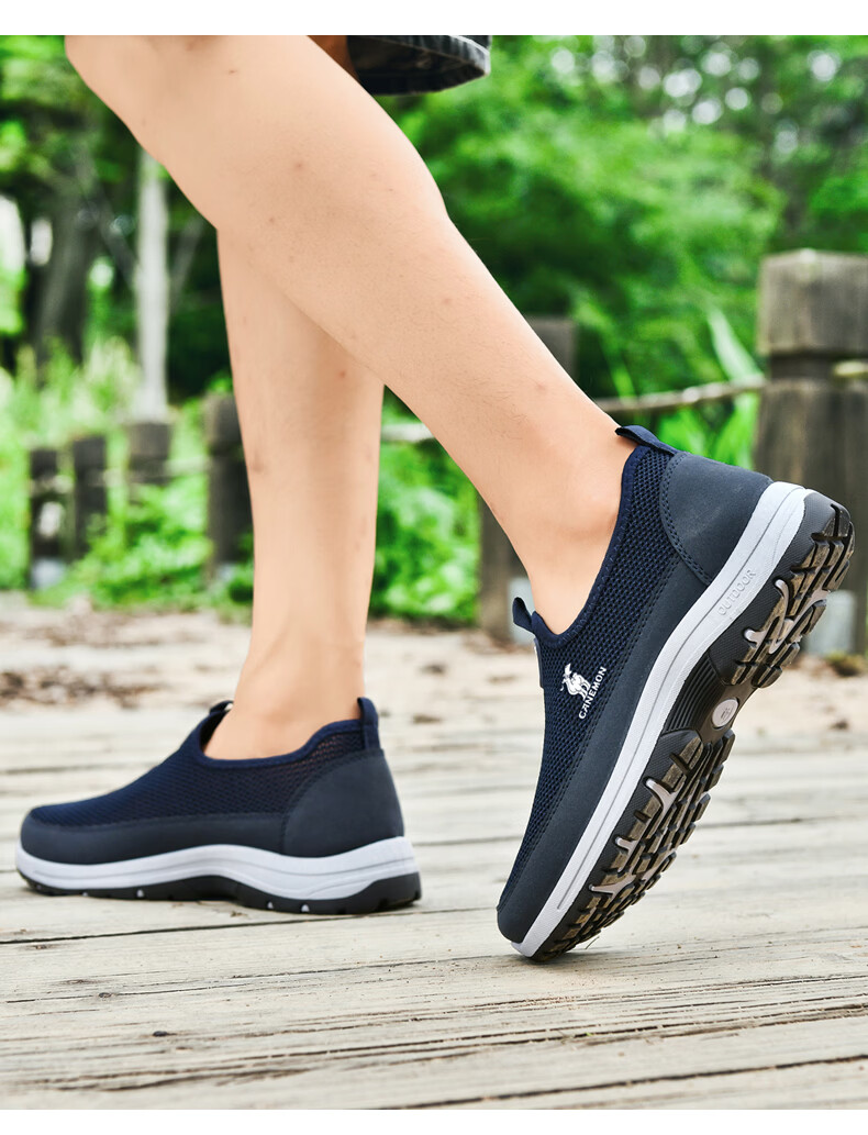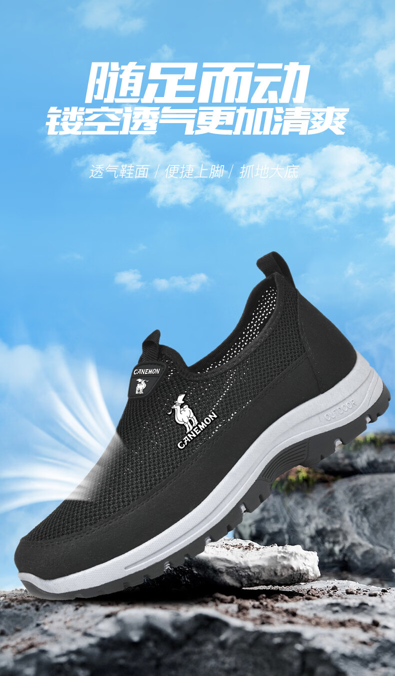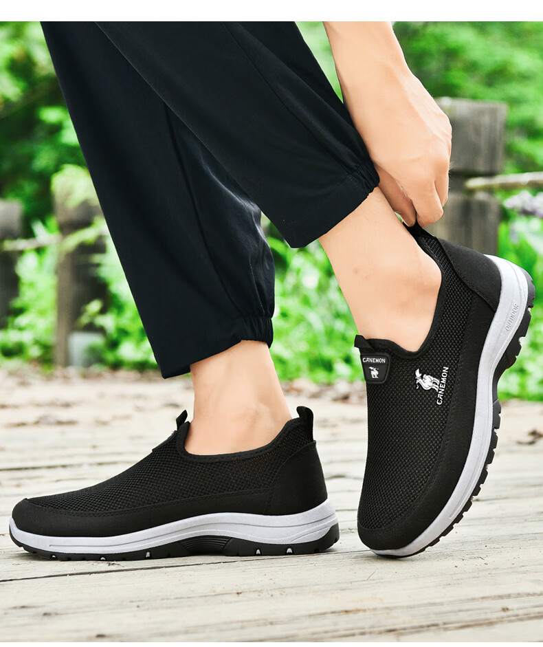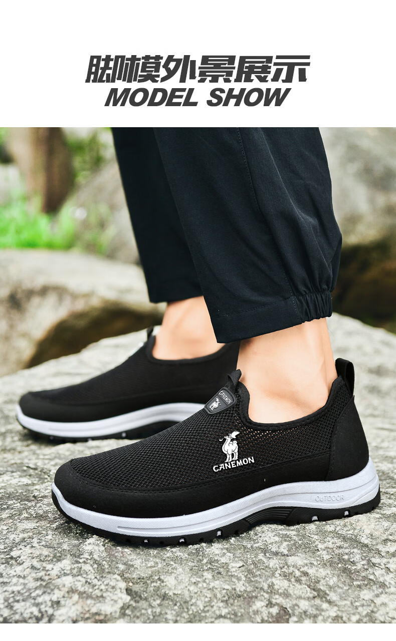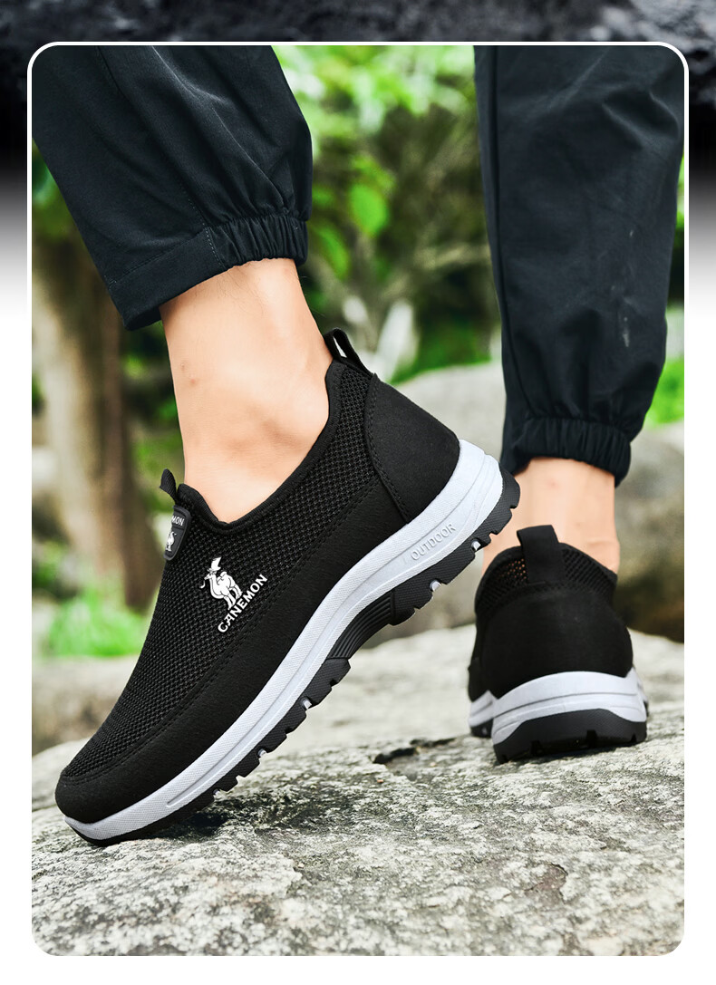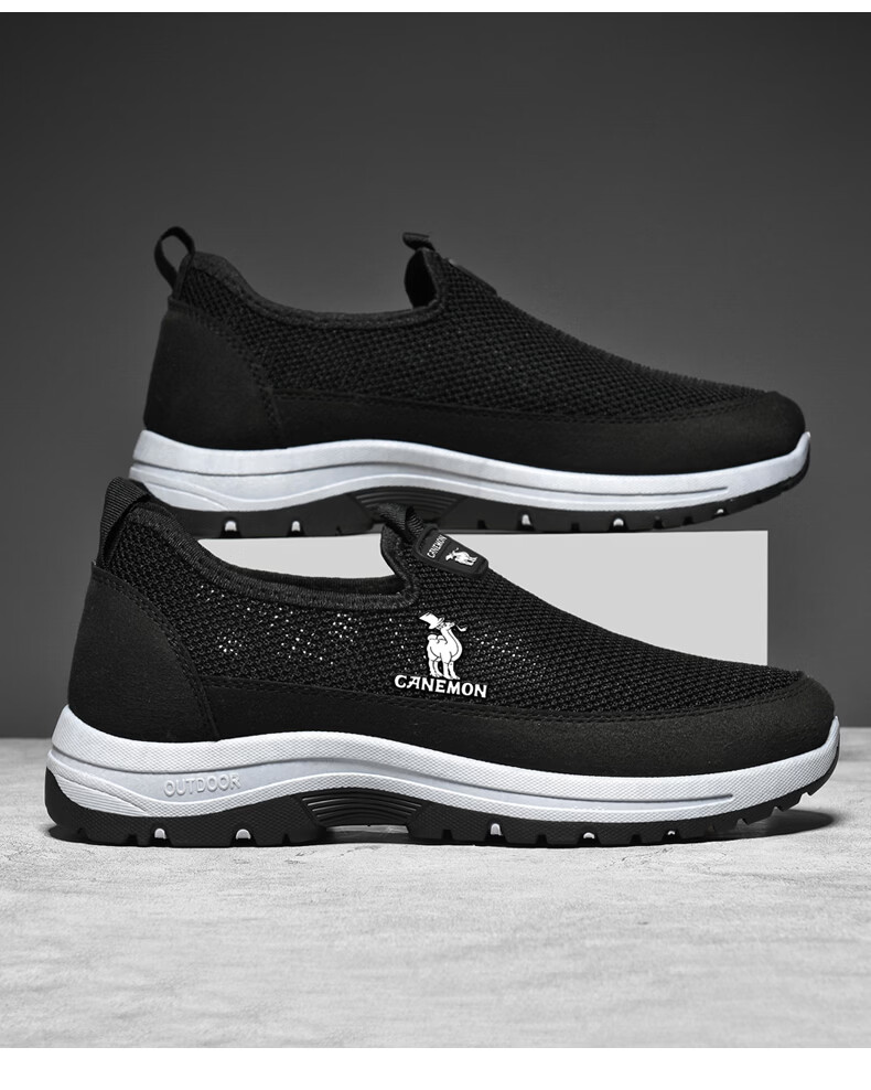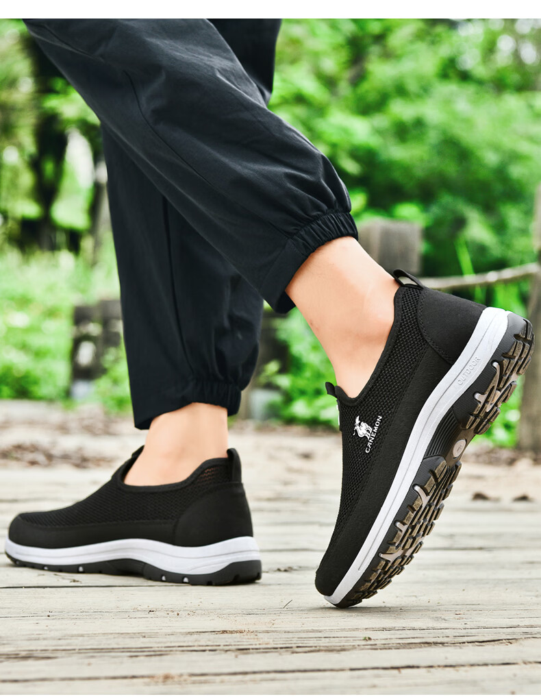 保罗骆驼男鞋夏季新款透气网面休闲鞋男士一脚蹬健步飞织鞋男 黑色 39