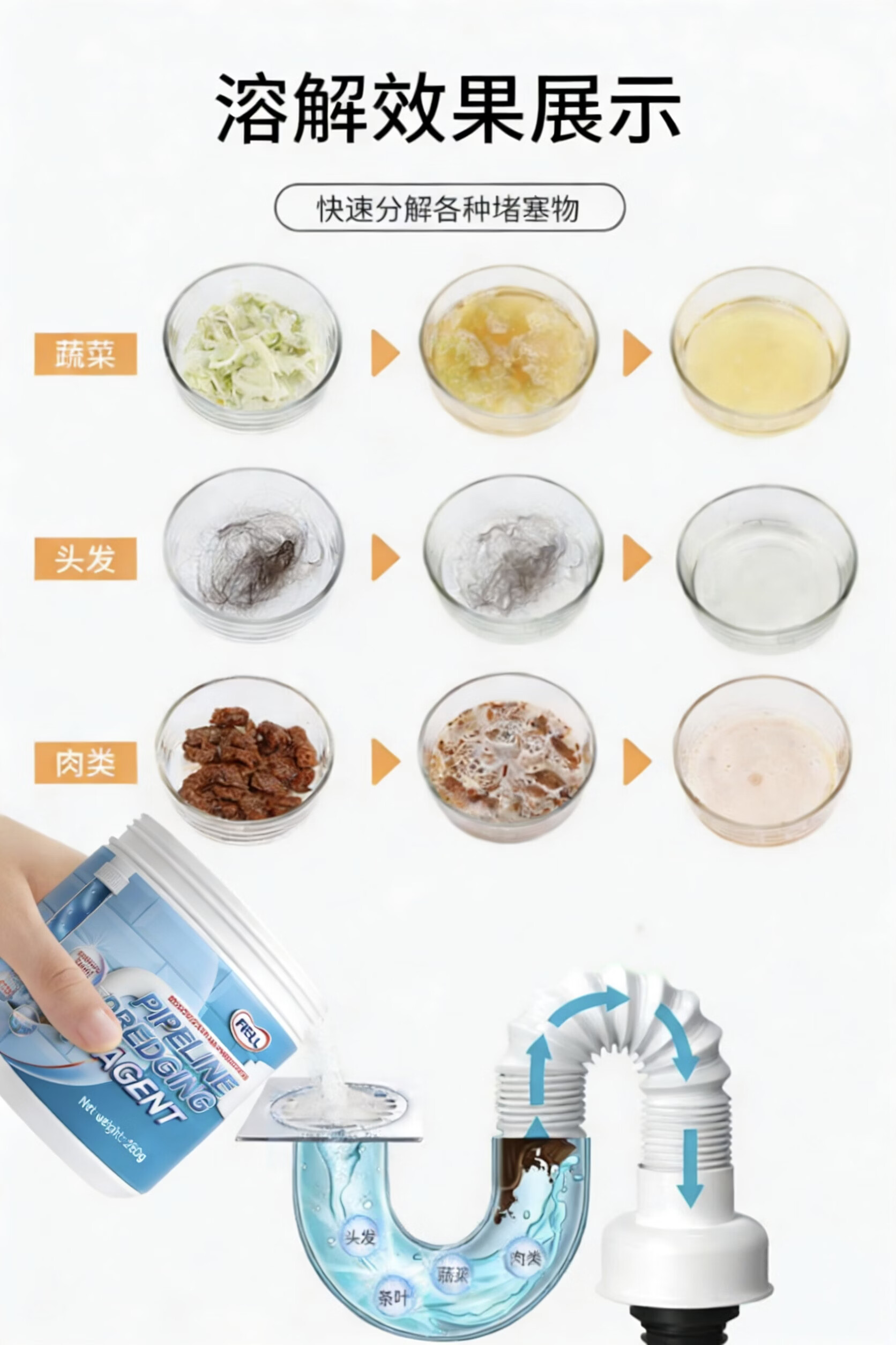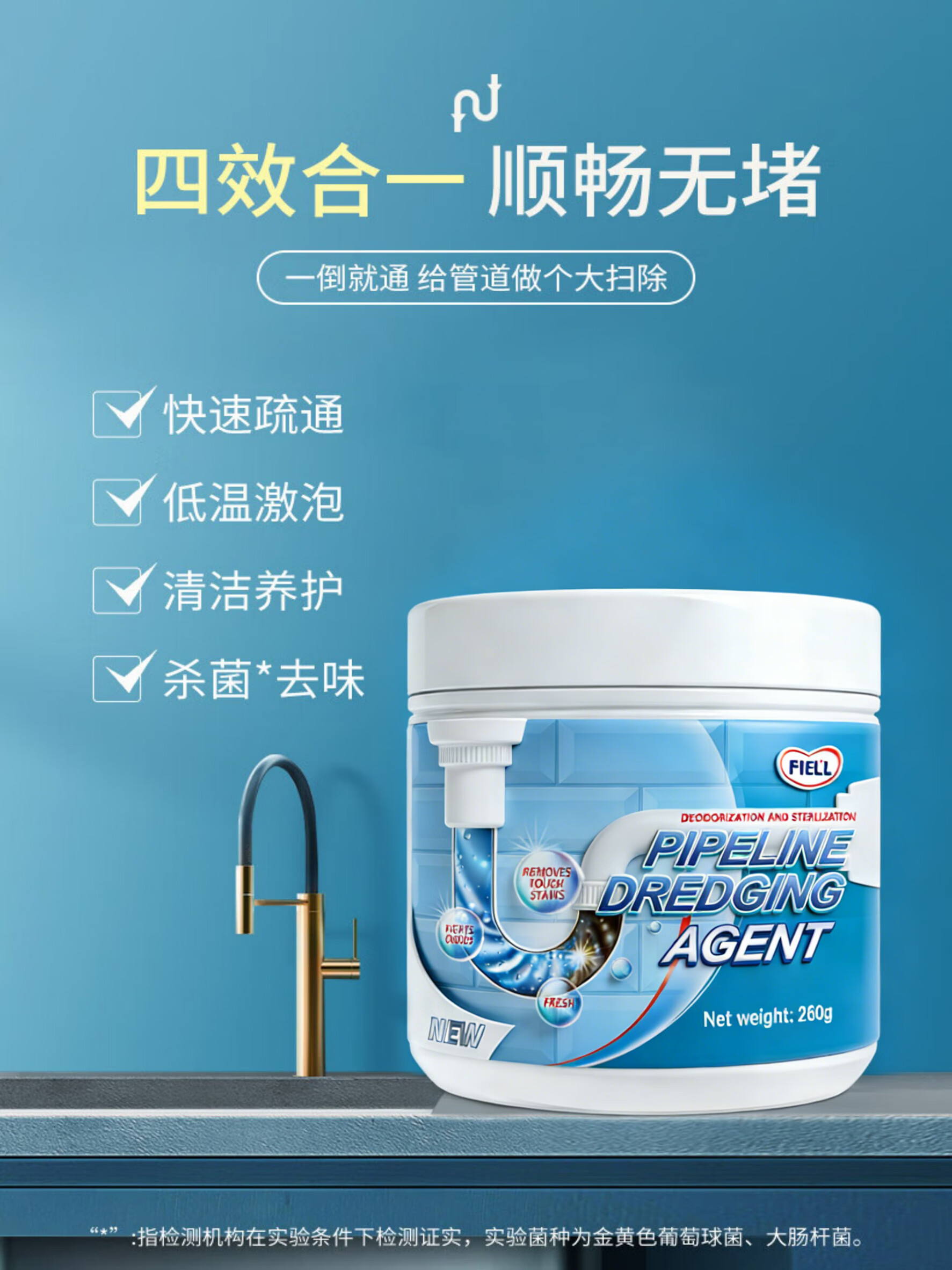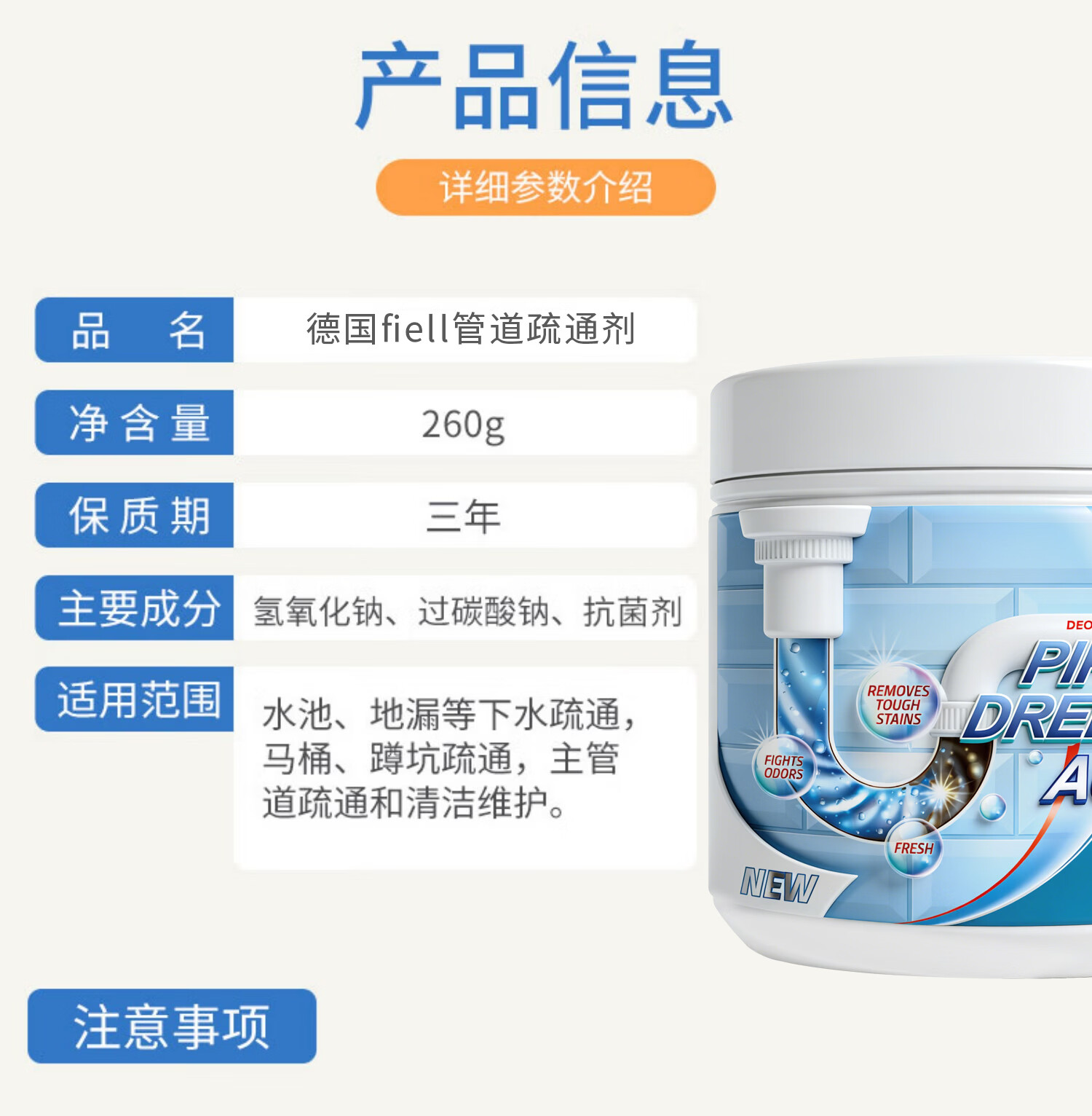 FIELL【德国】管道疏通剂厨房下水道重油污堵塞强力溶解厕所马桶除臭 【家庭囤货装】 260g 5瓶【强效分解神器】 家庭环境好帮手