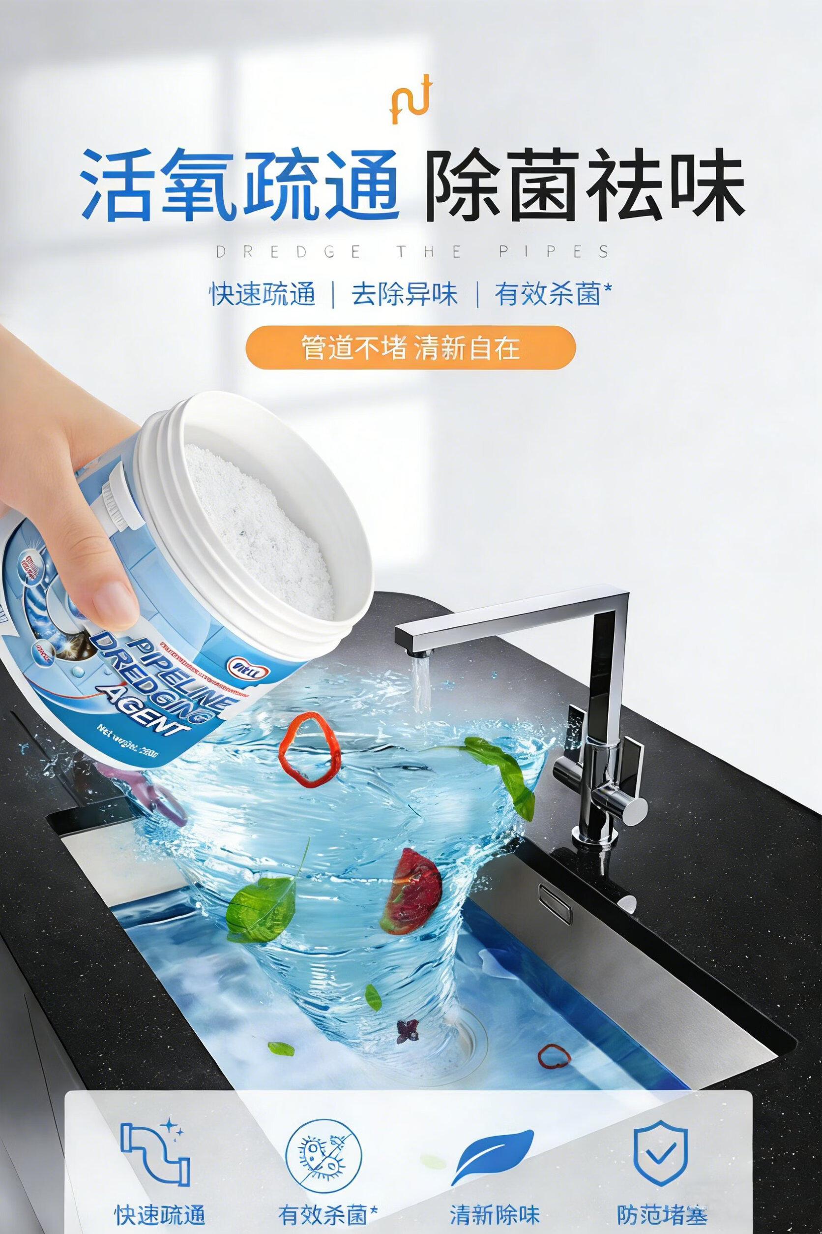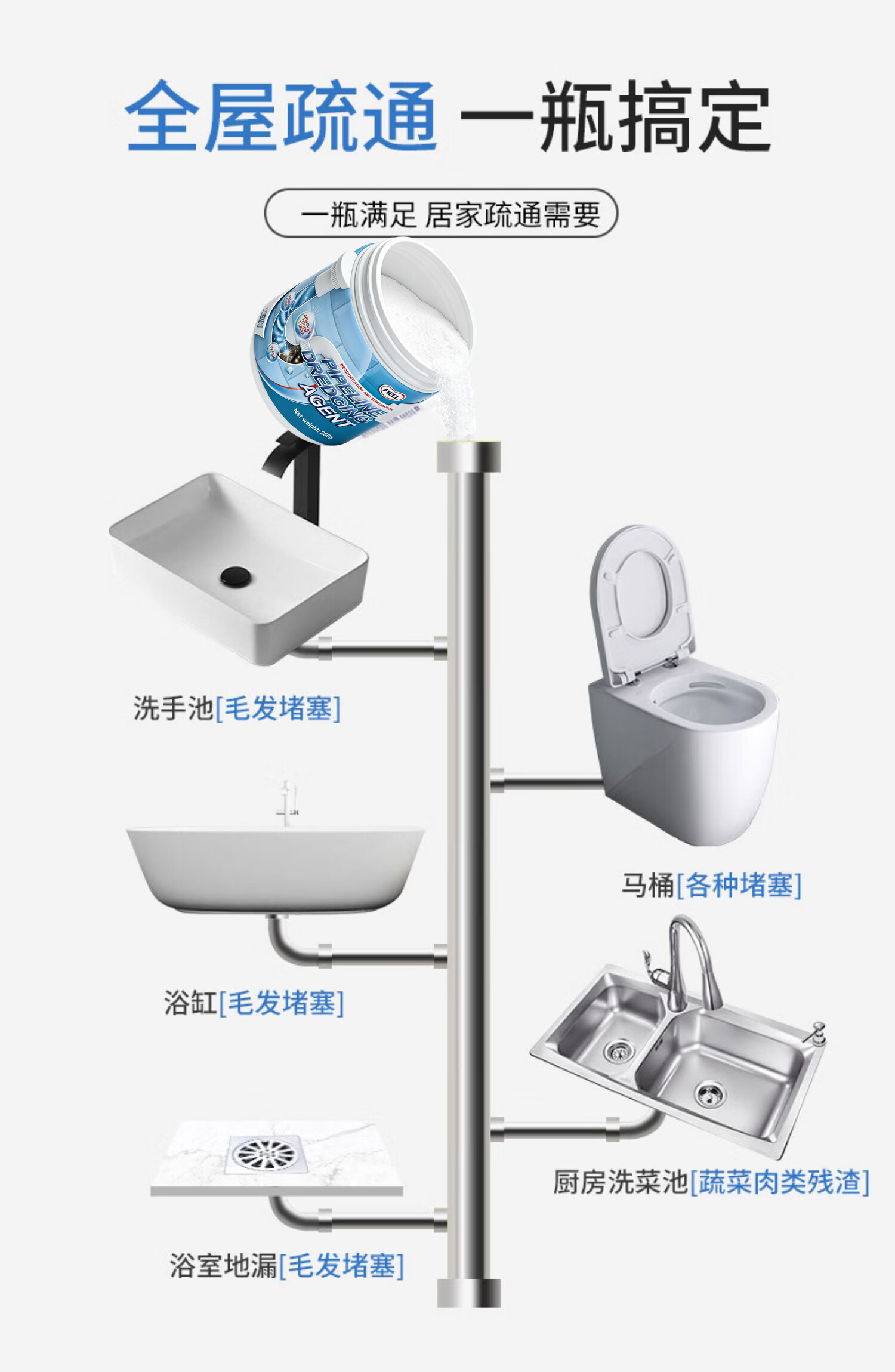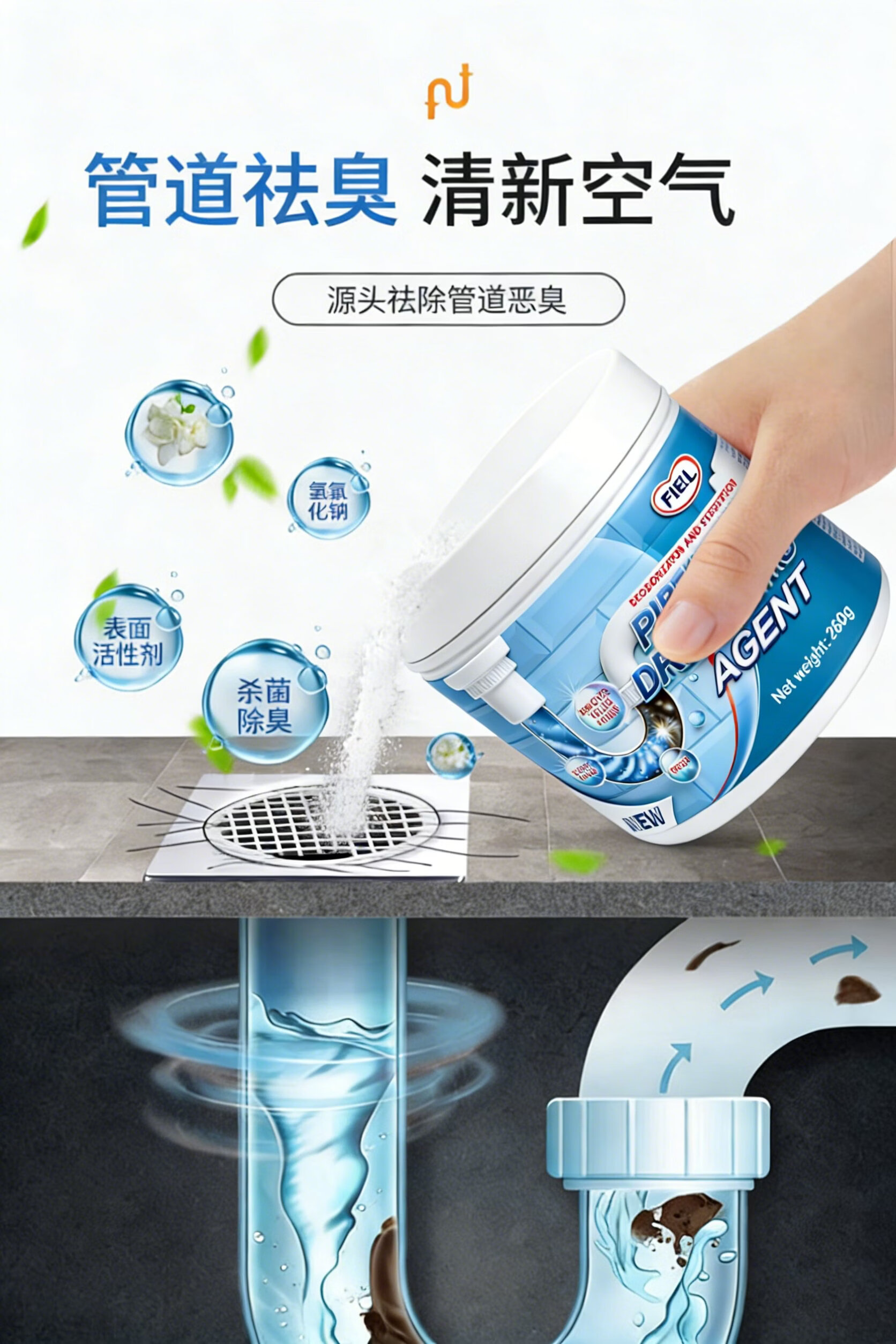 FIELL【德国】管道疏通剂厨房下水道重油污堵塞强力溶解厕所马桶除臭 【家庭囤货装】 260g 5瓶【强效分解神器】 家庭环境好帮手