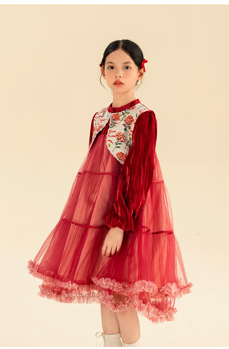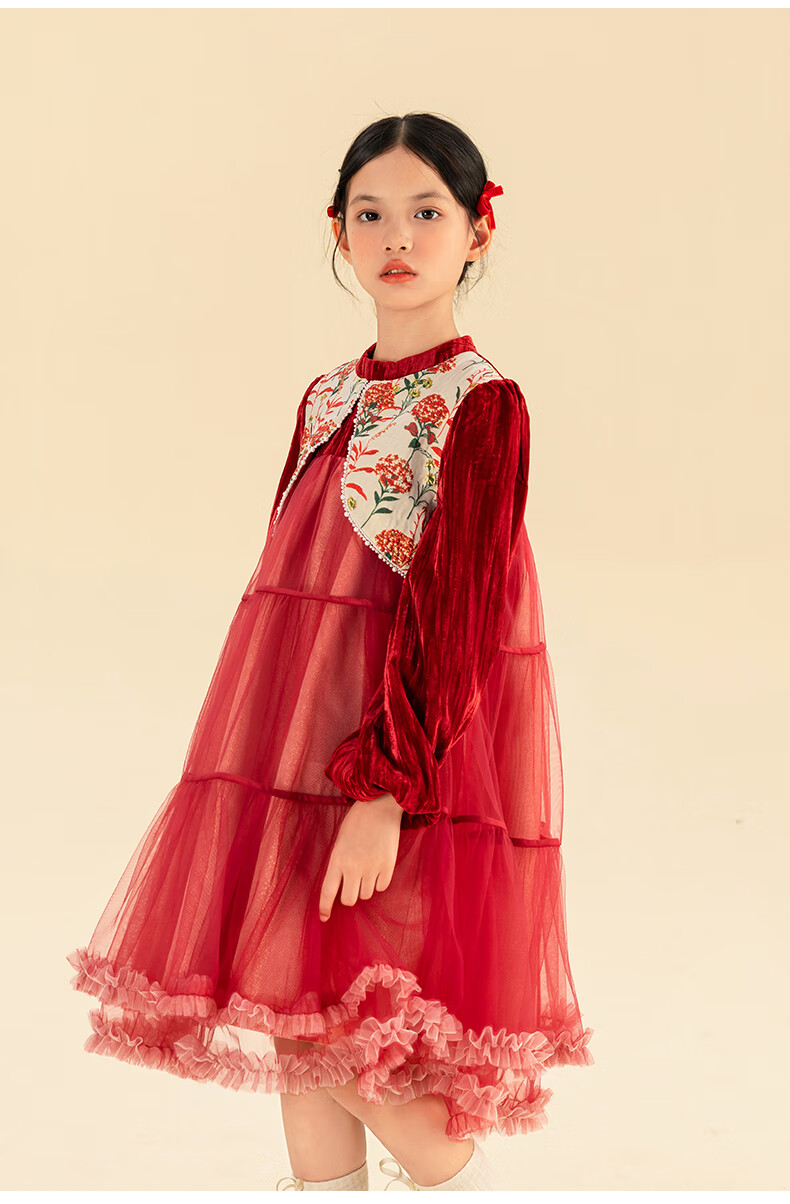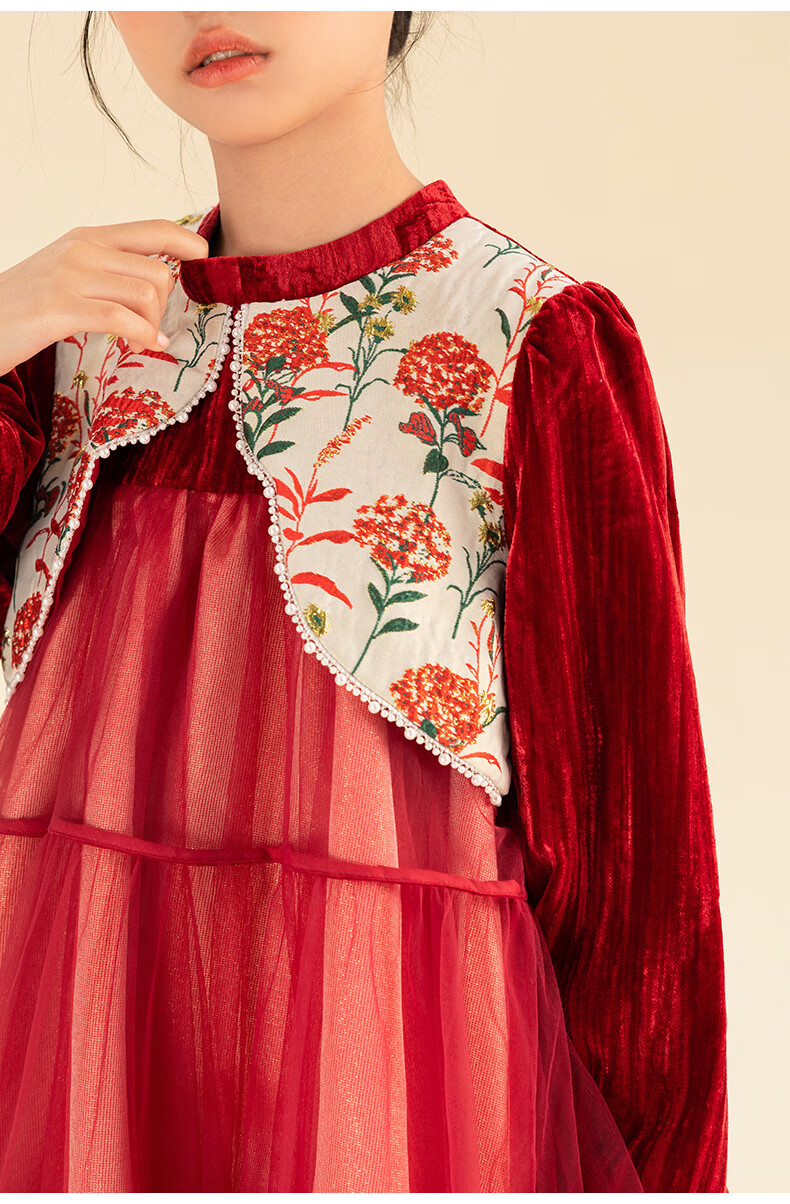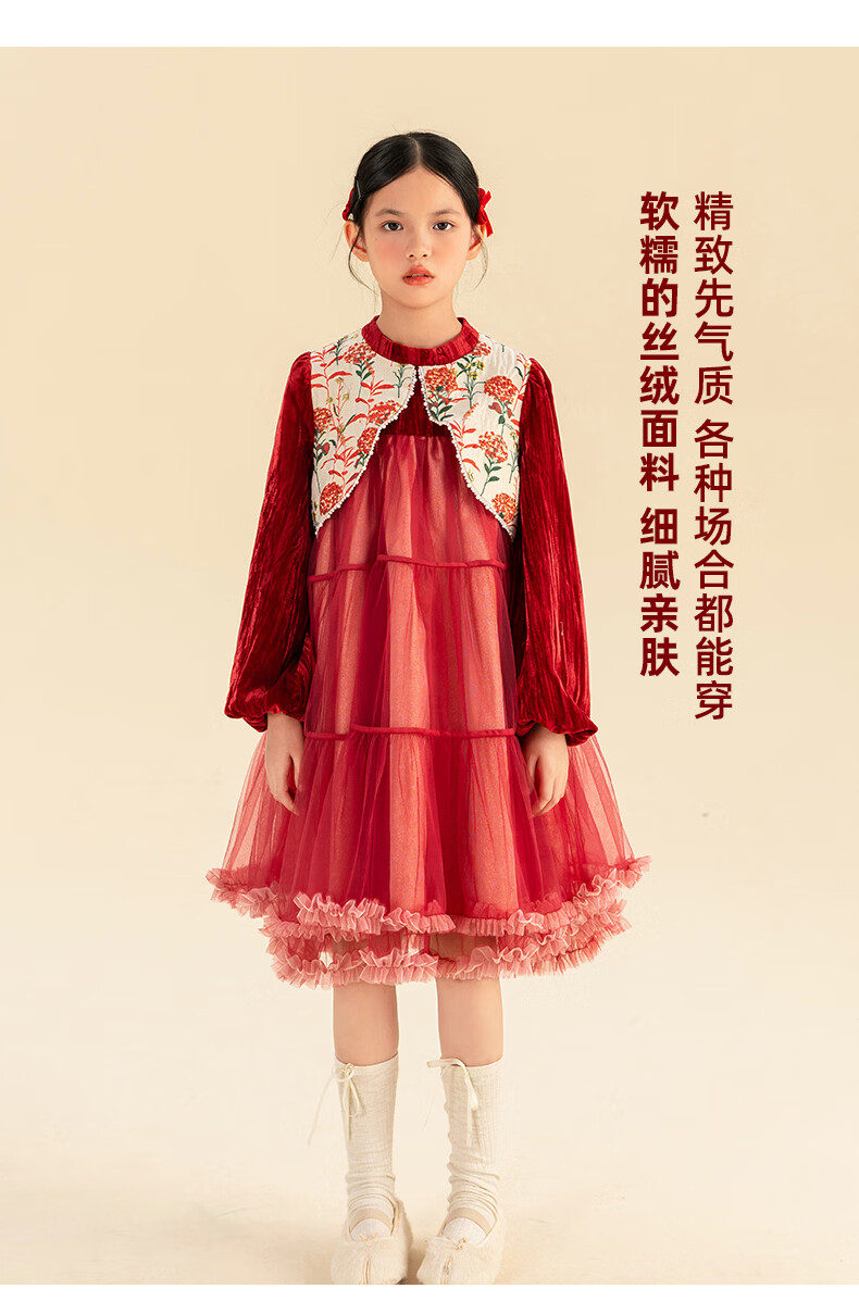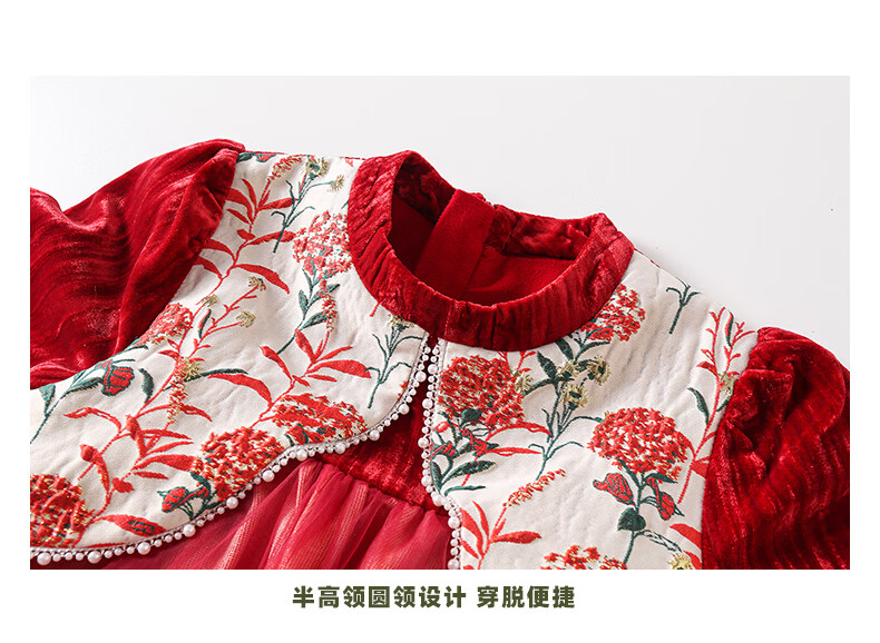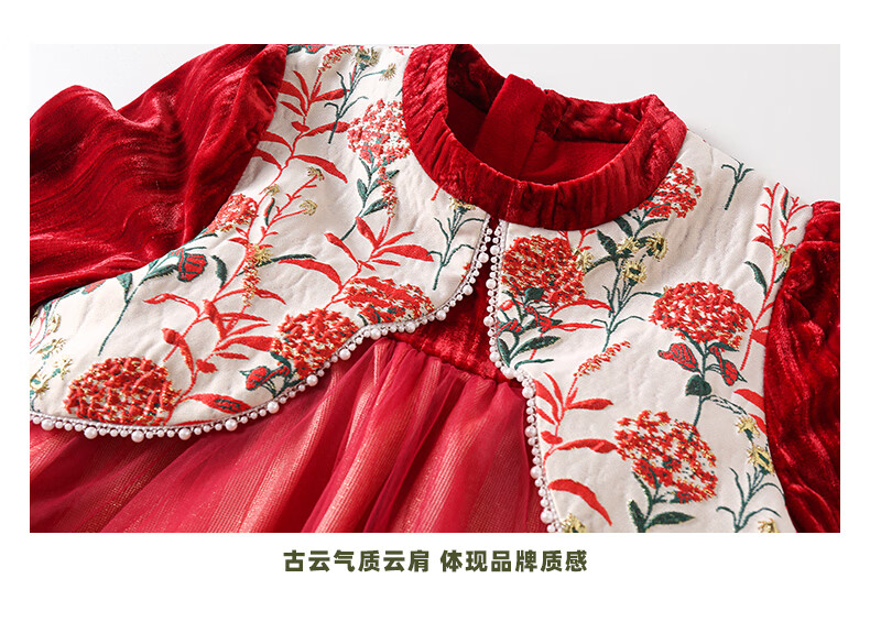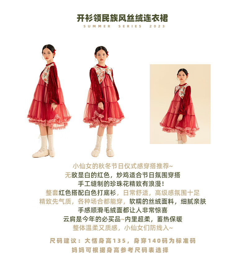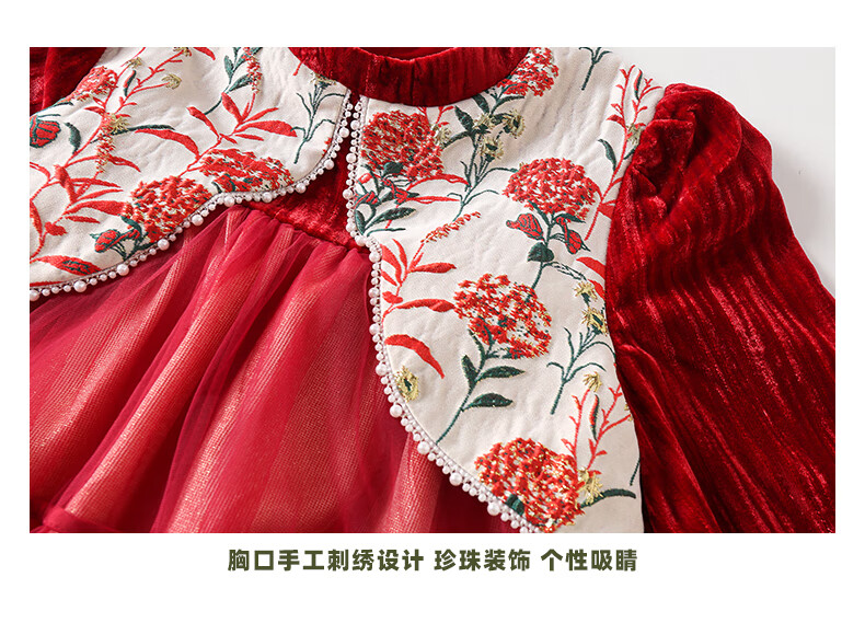 淘町女童加绒连衣裙秋冬新中大童手工披肩领民族丝绒纱裙年服 红色 100