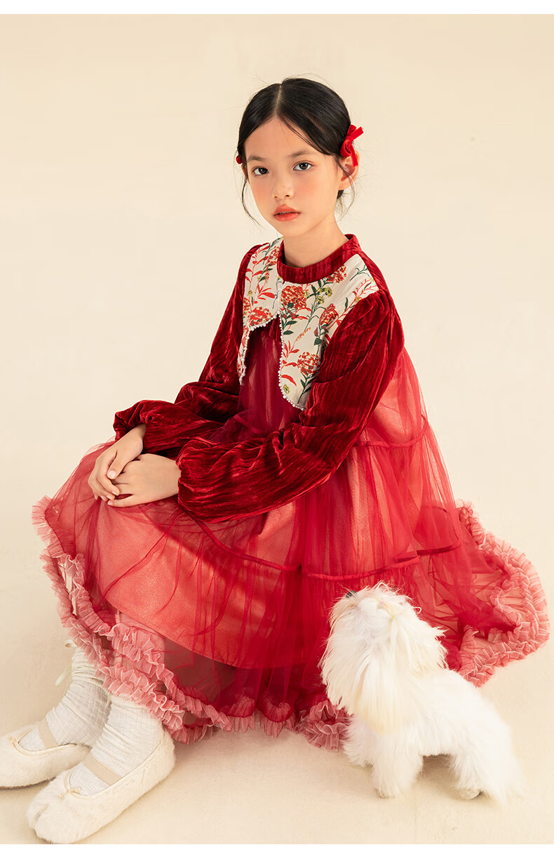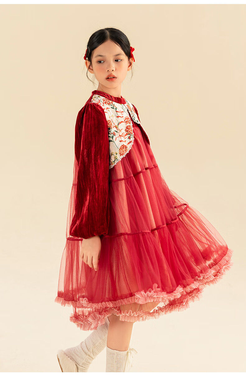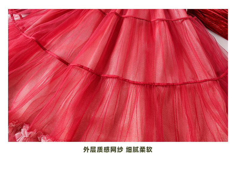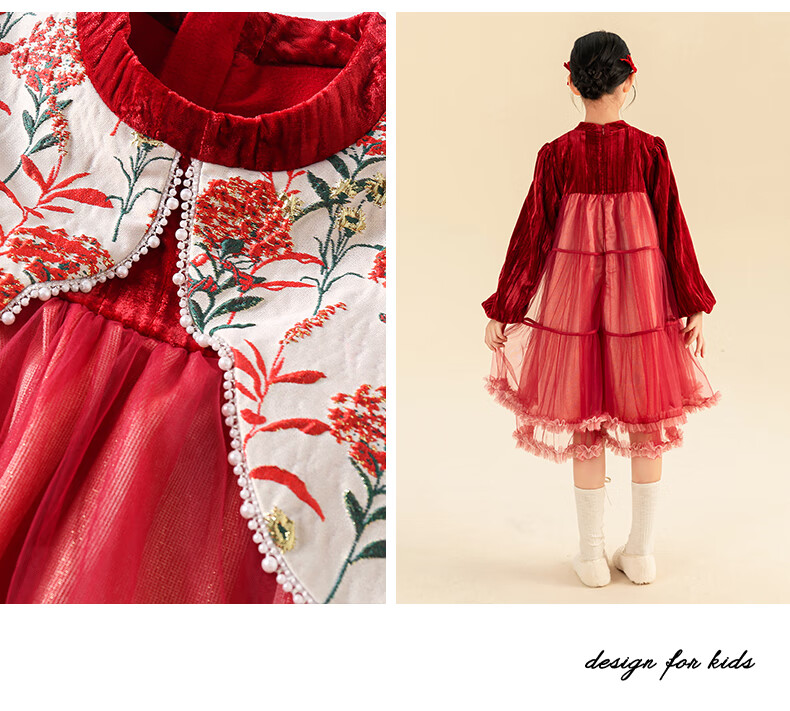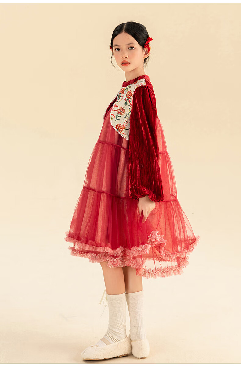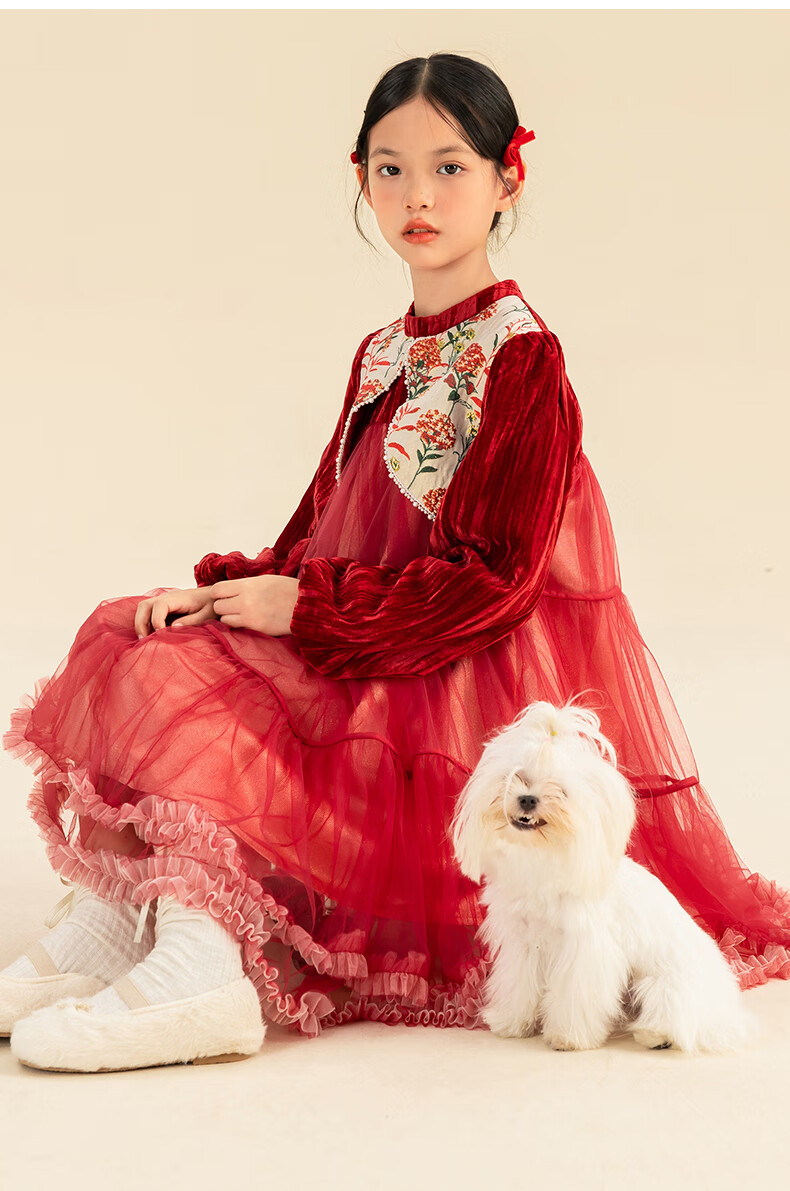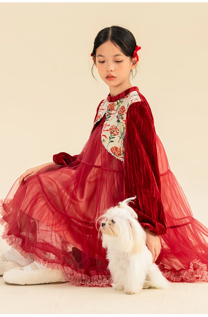 淘町女童加绒连衣裙秋冬新中大童手工披肩领民族丝绒纱裙年服 红色 100