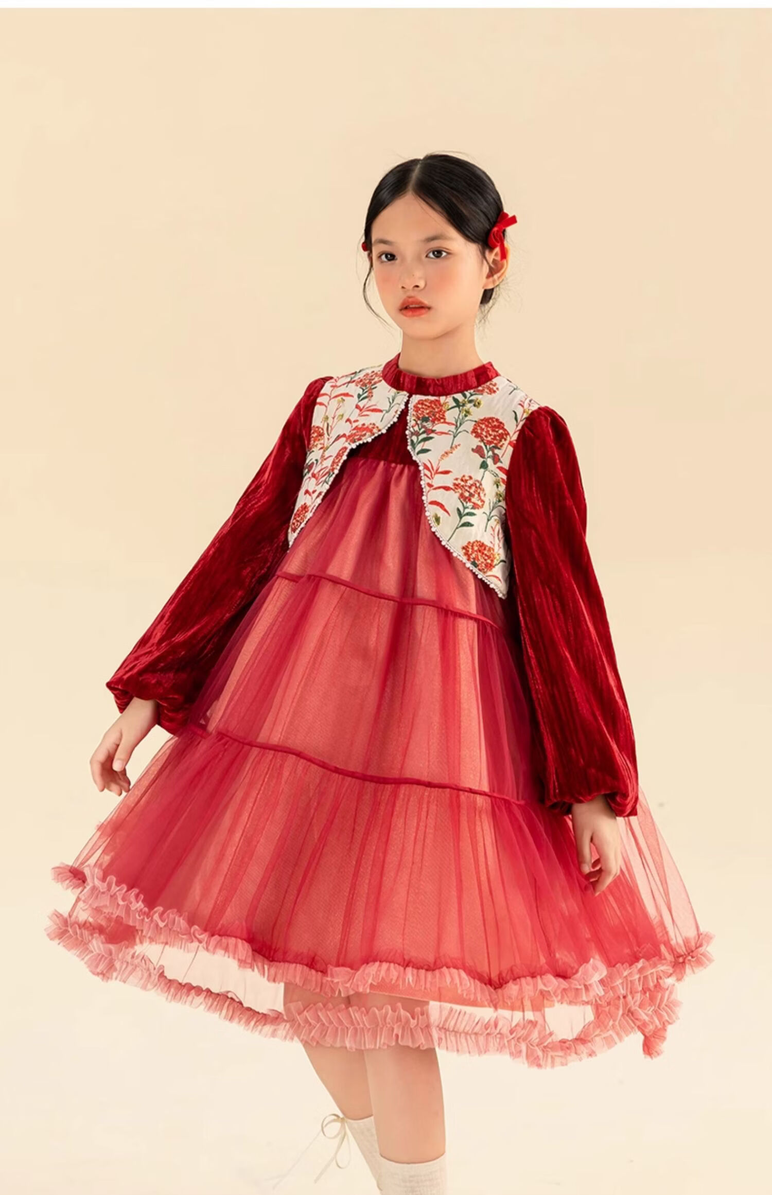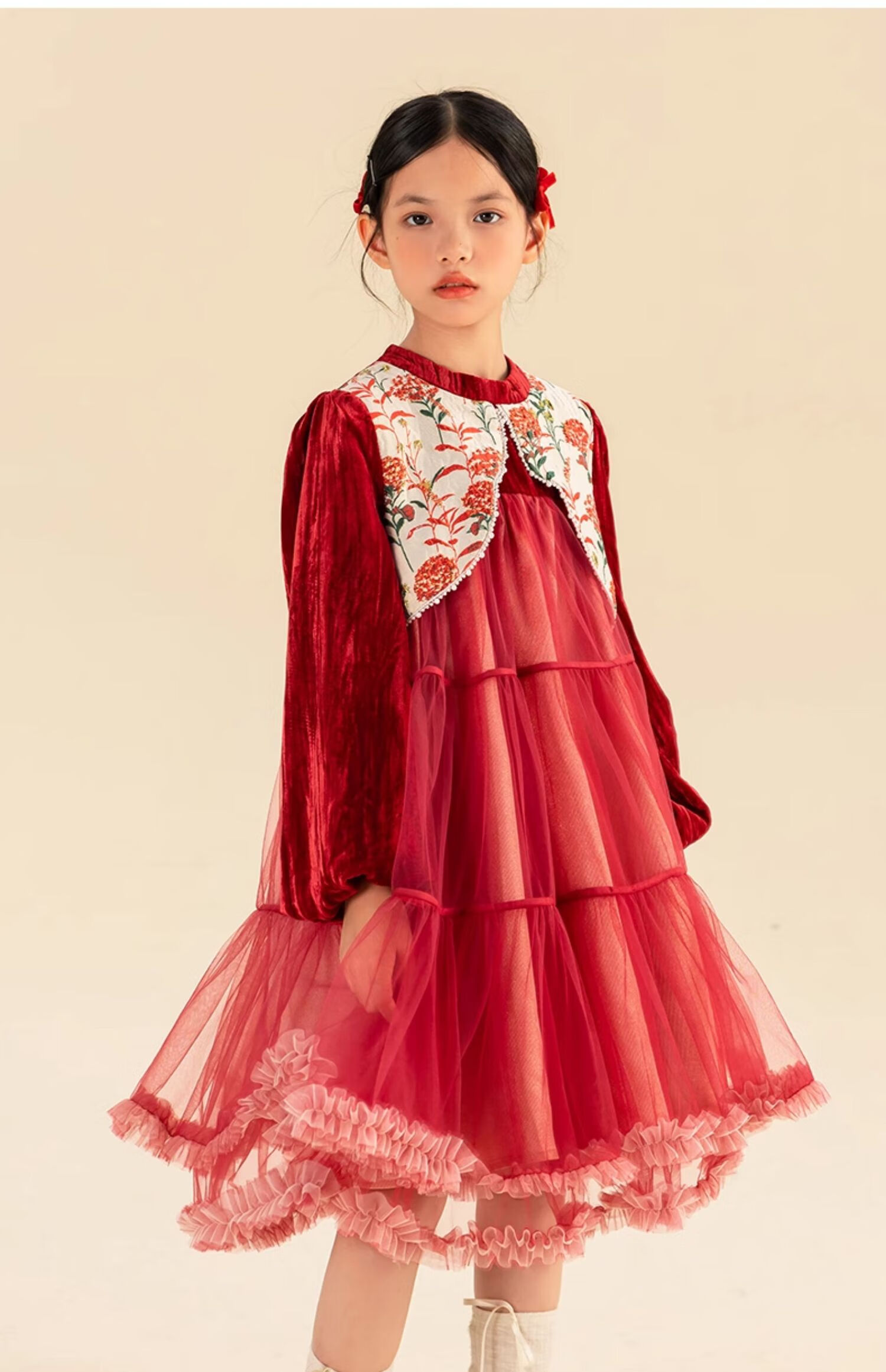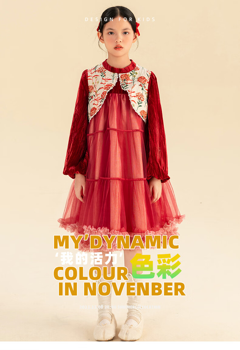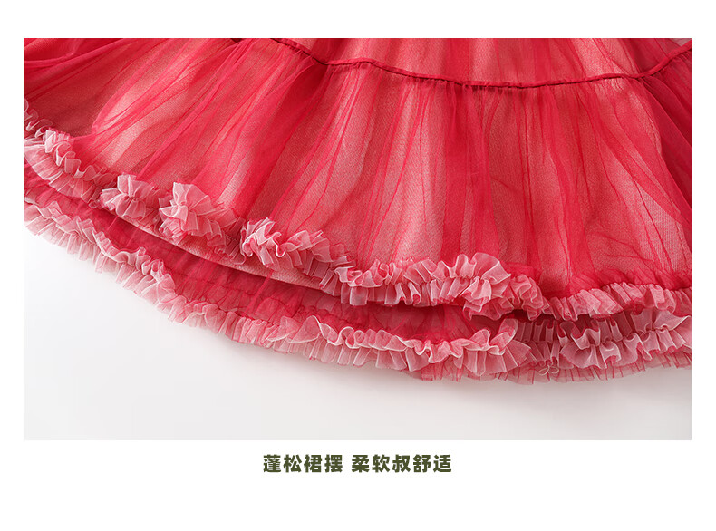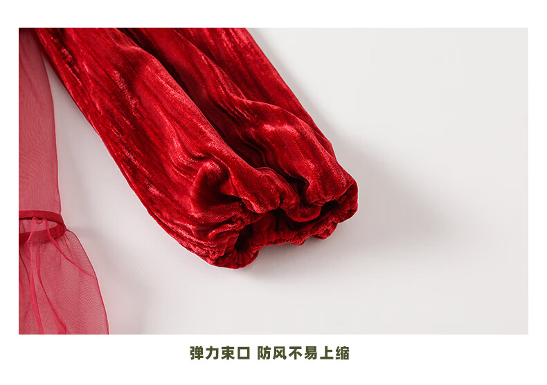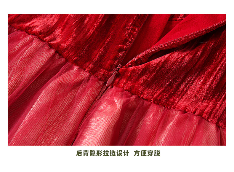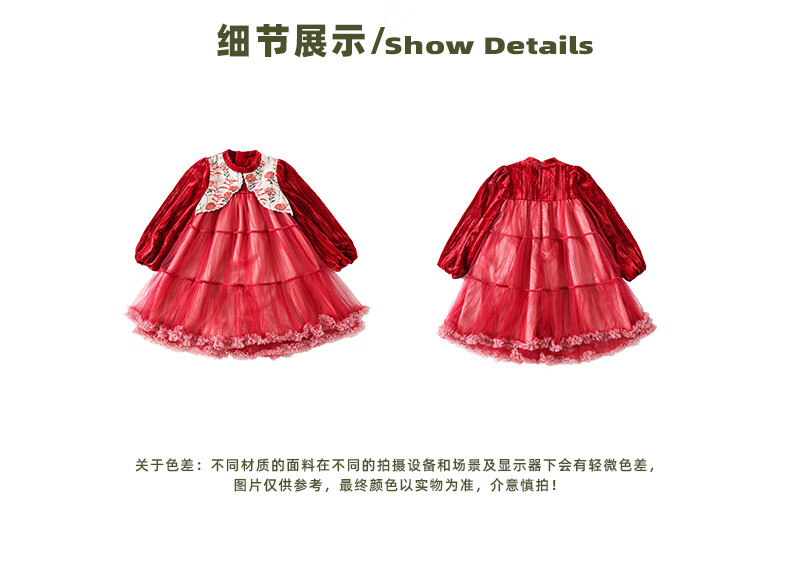 淘町女童加绒连衣裙秋冬新中大童手工披肩领民族丝绒纱裙年服 红色 100