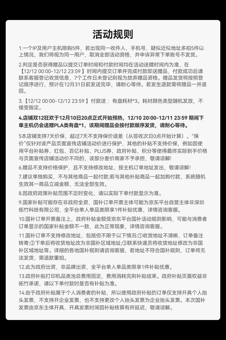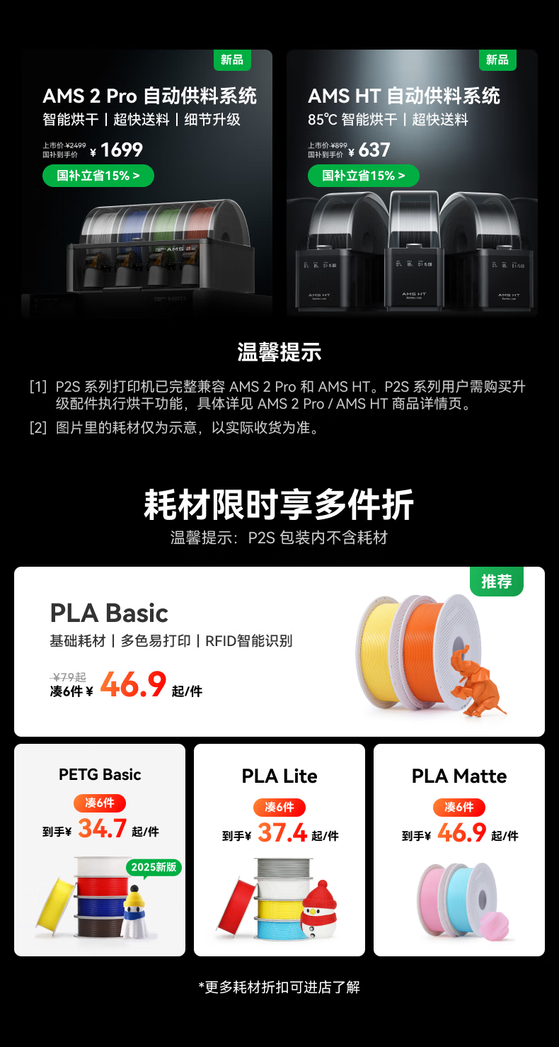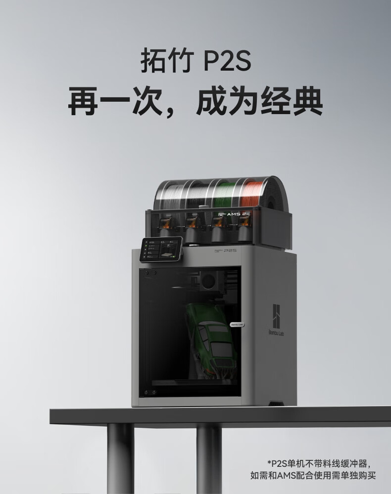 拓竹P2SC 3D打印机器大尺寸FDM家用桌面打印机高精度高速AI监测外吸气冷却烘干 P2S 多色套装