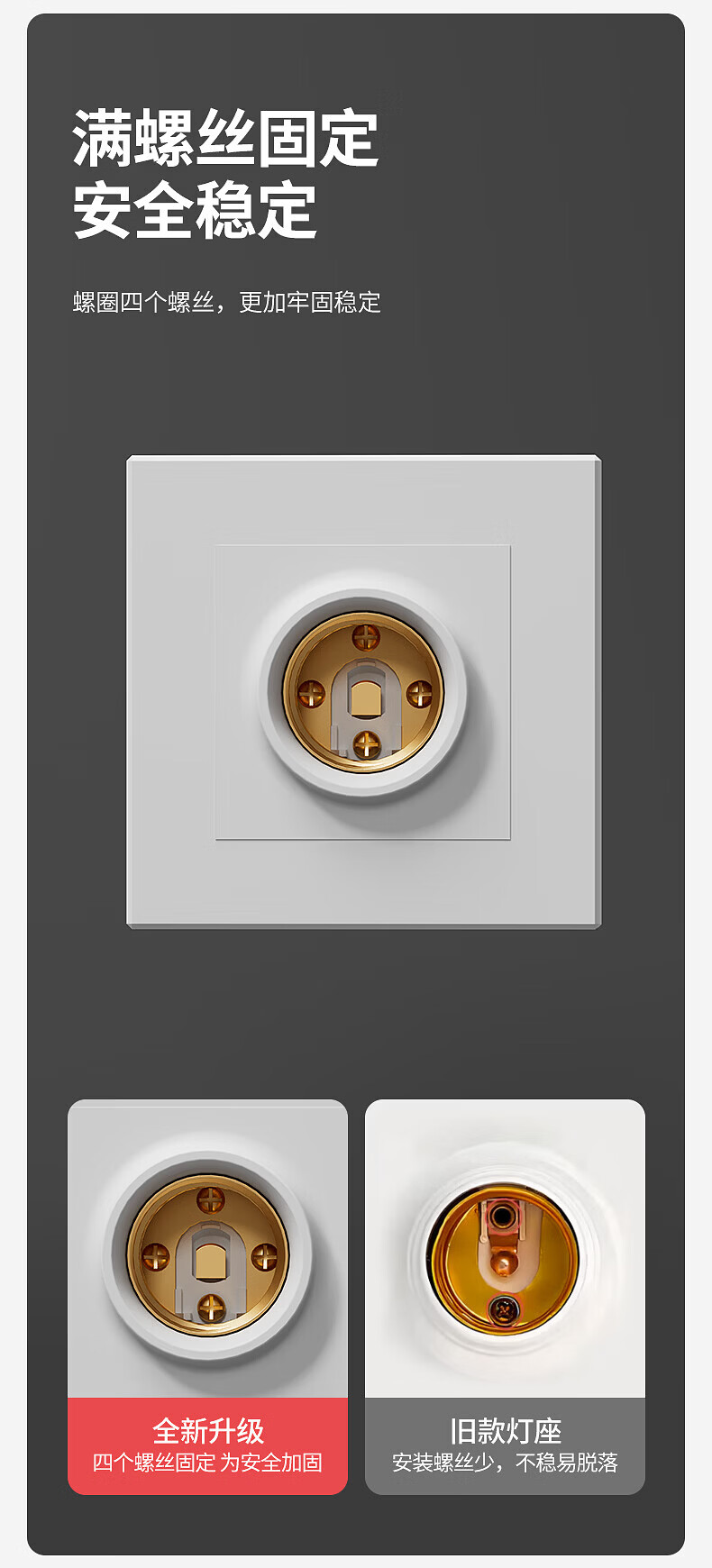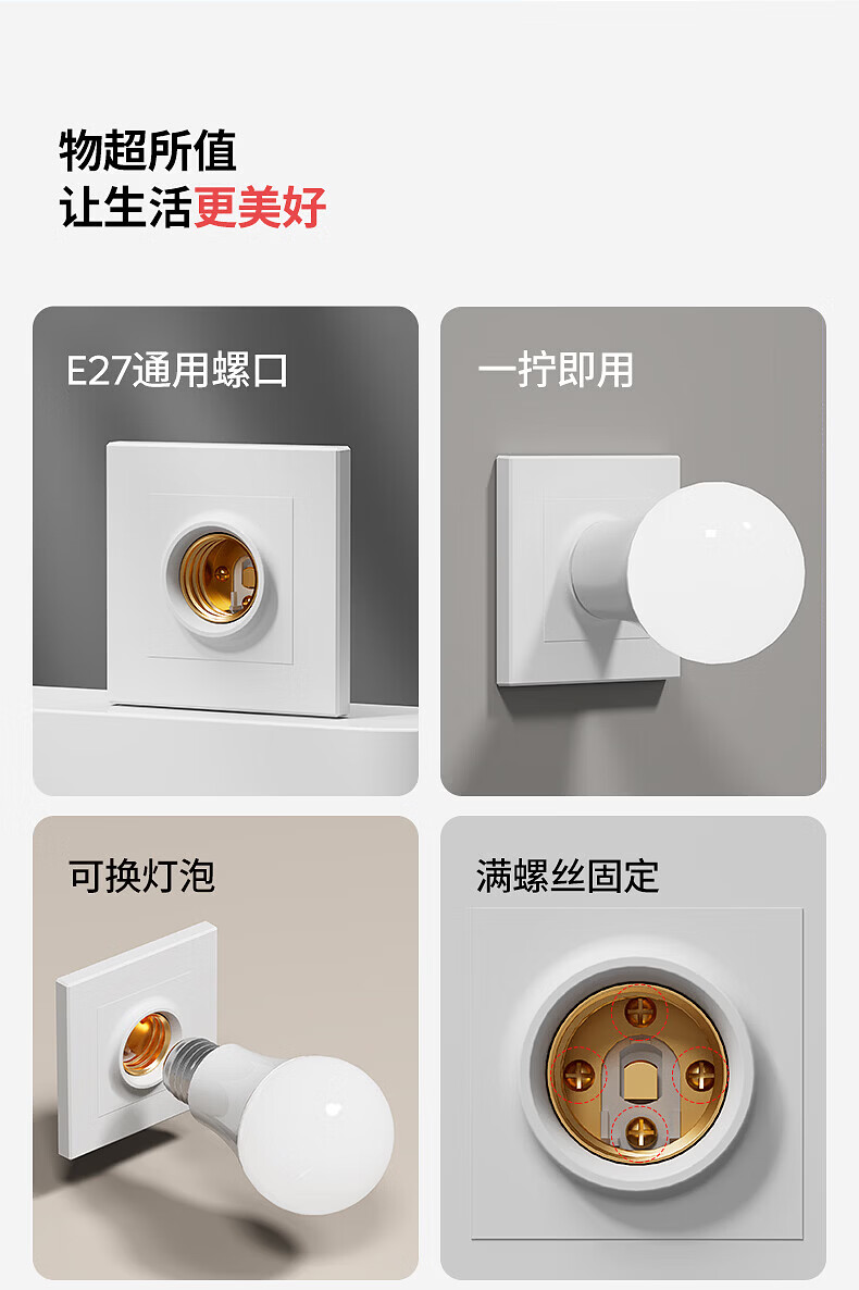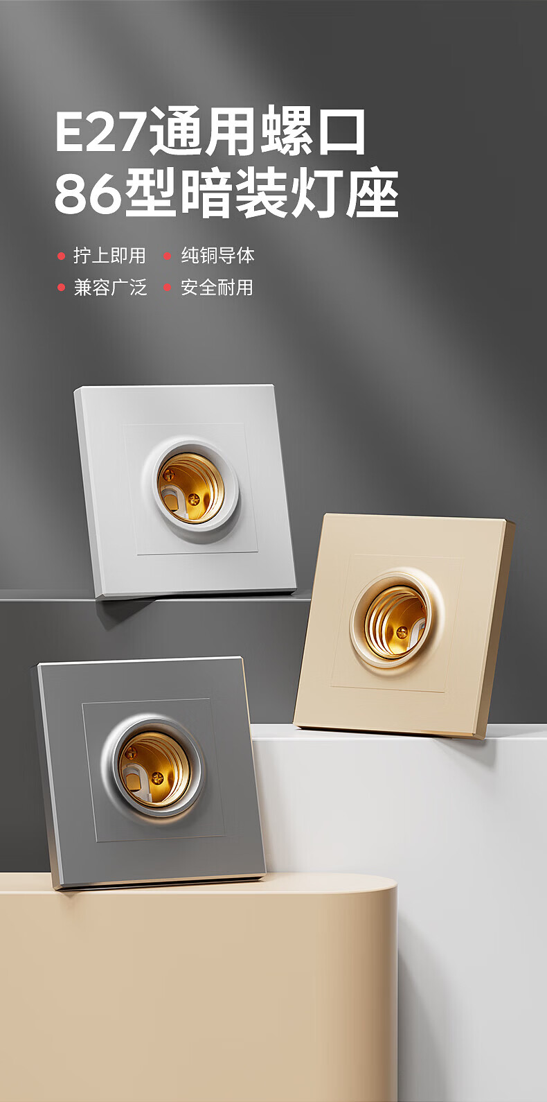 国际电工E27螺口灯头灯座家用墙壁86型暗装方形LED节能灯泡螺纹灯头 暗装灯座-白色 1只装