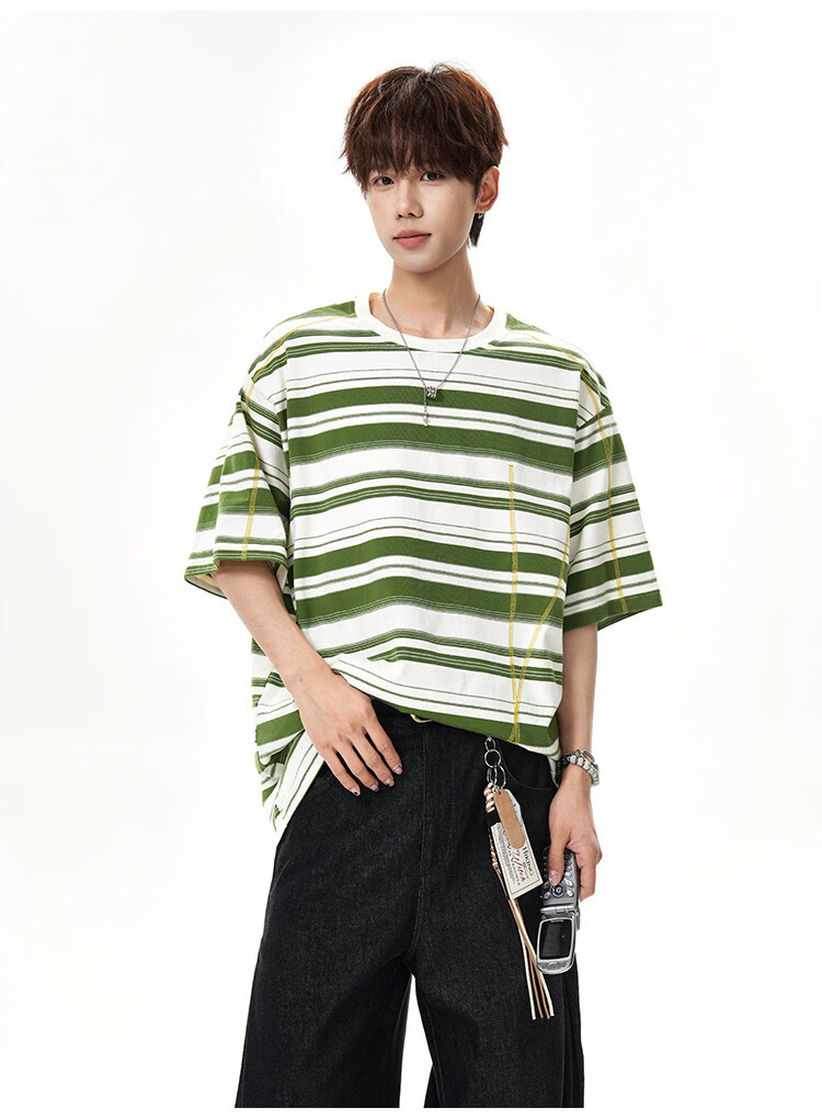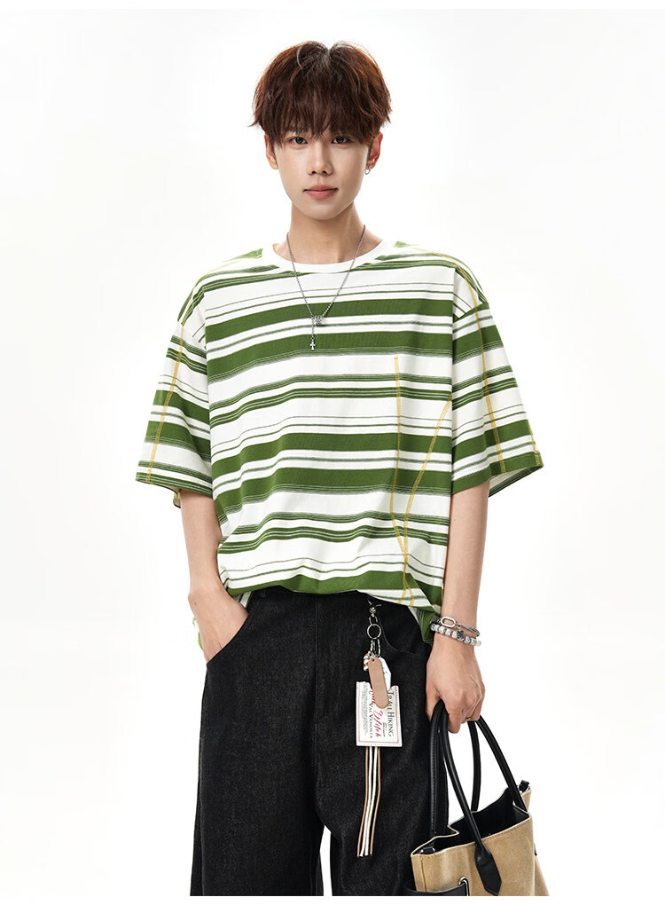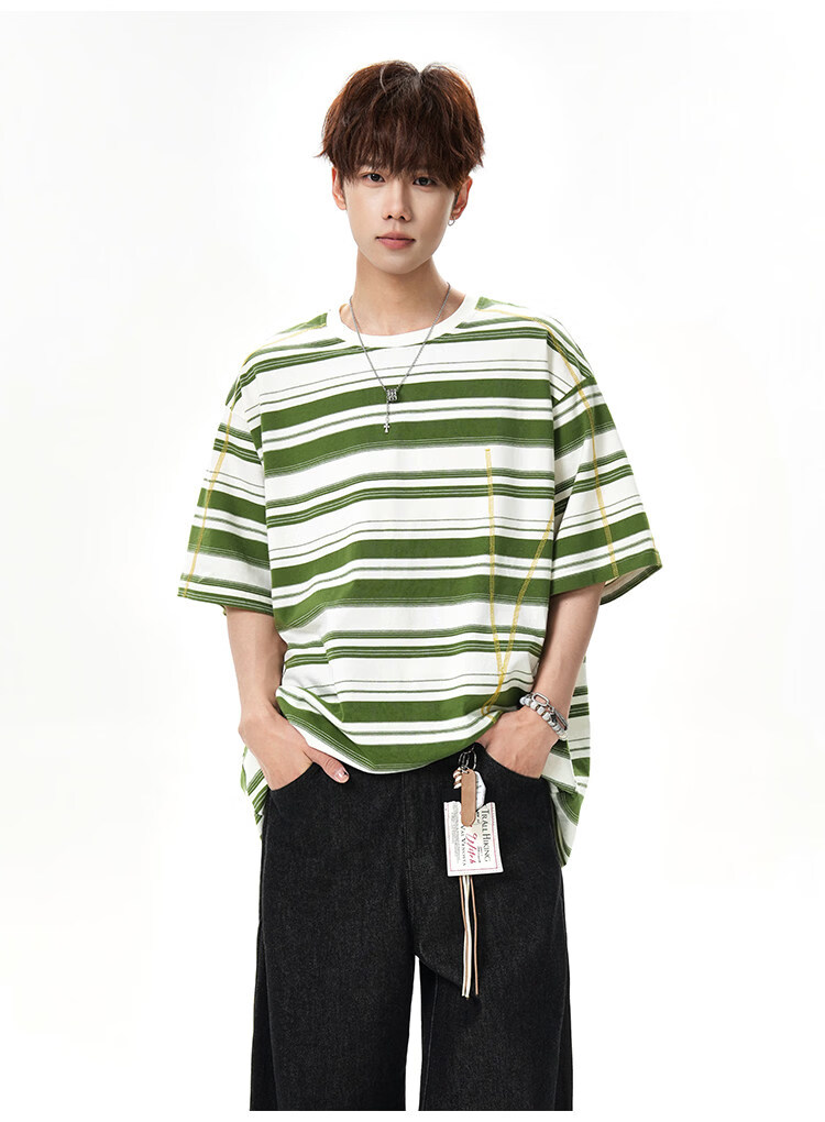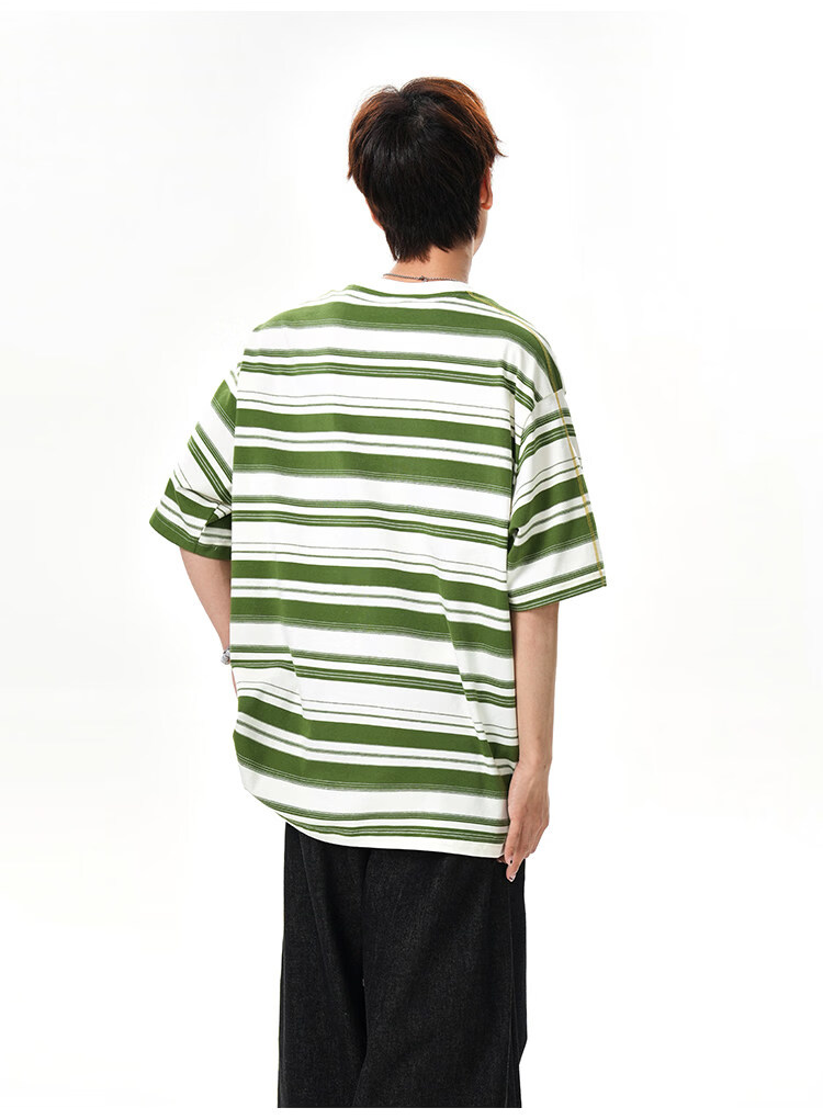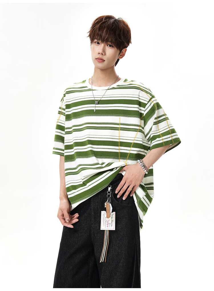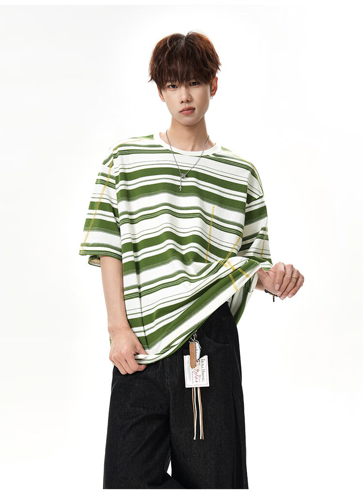 NEW OR MODE美式哈苏线条纹短袖t恤男夏季新款潮牌高街宽松痞帅青少年半袖T恤 绿色【高品质】 M 【建议90-110斤】