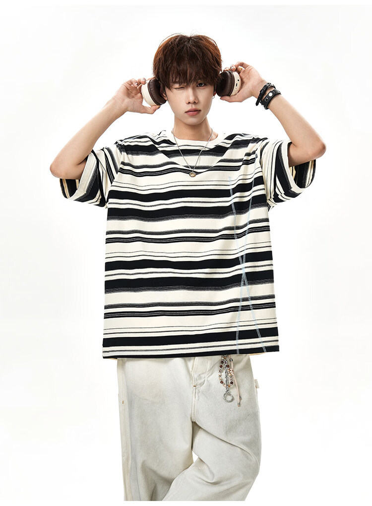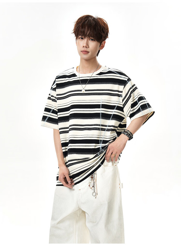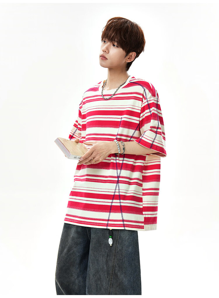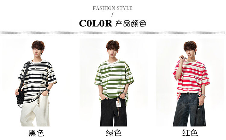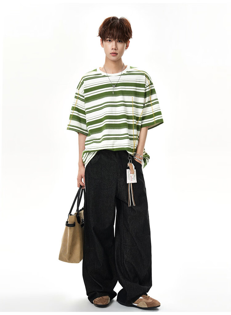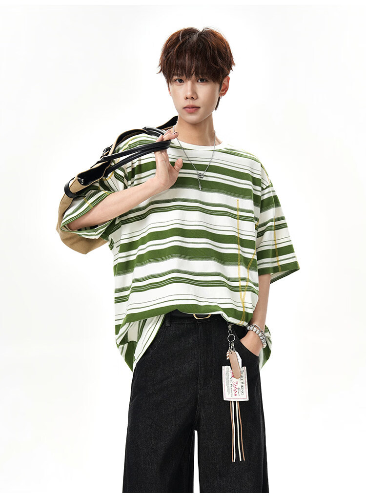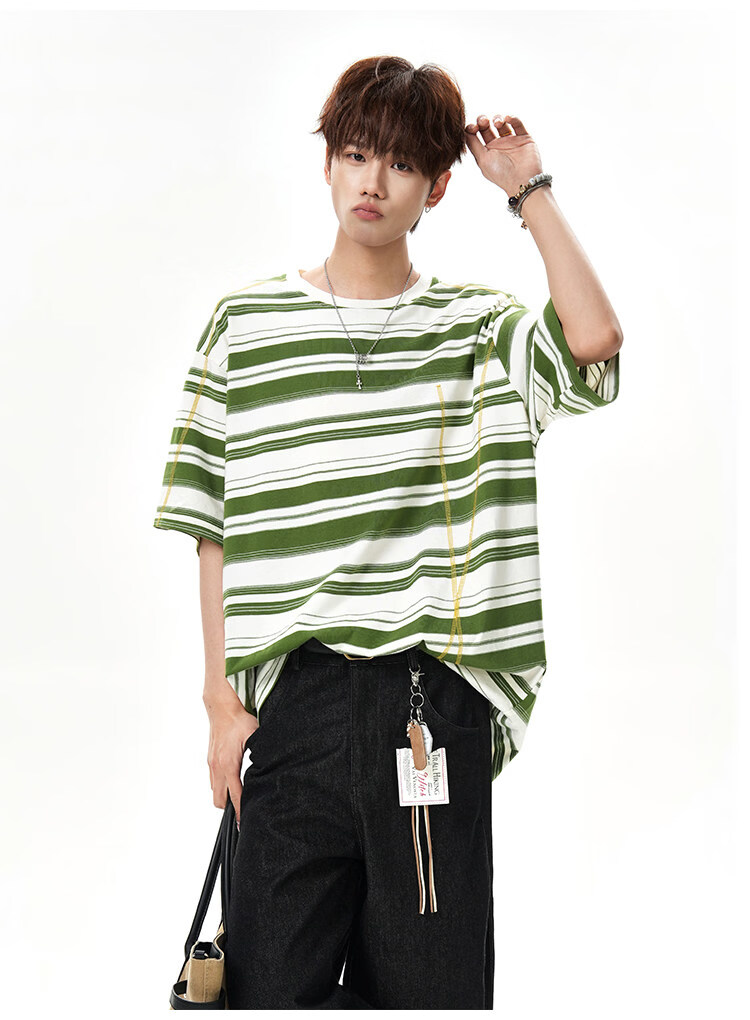 NEW OR MODE美式哈苏线条纹短袖t恤男夏季新款潮牌高街宽松痞帅青少年半袖T恤 绿色【高品质】 M 【建议90-110斤】