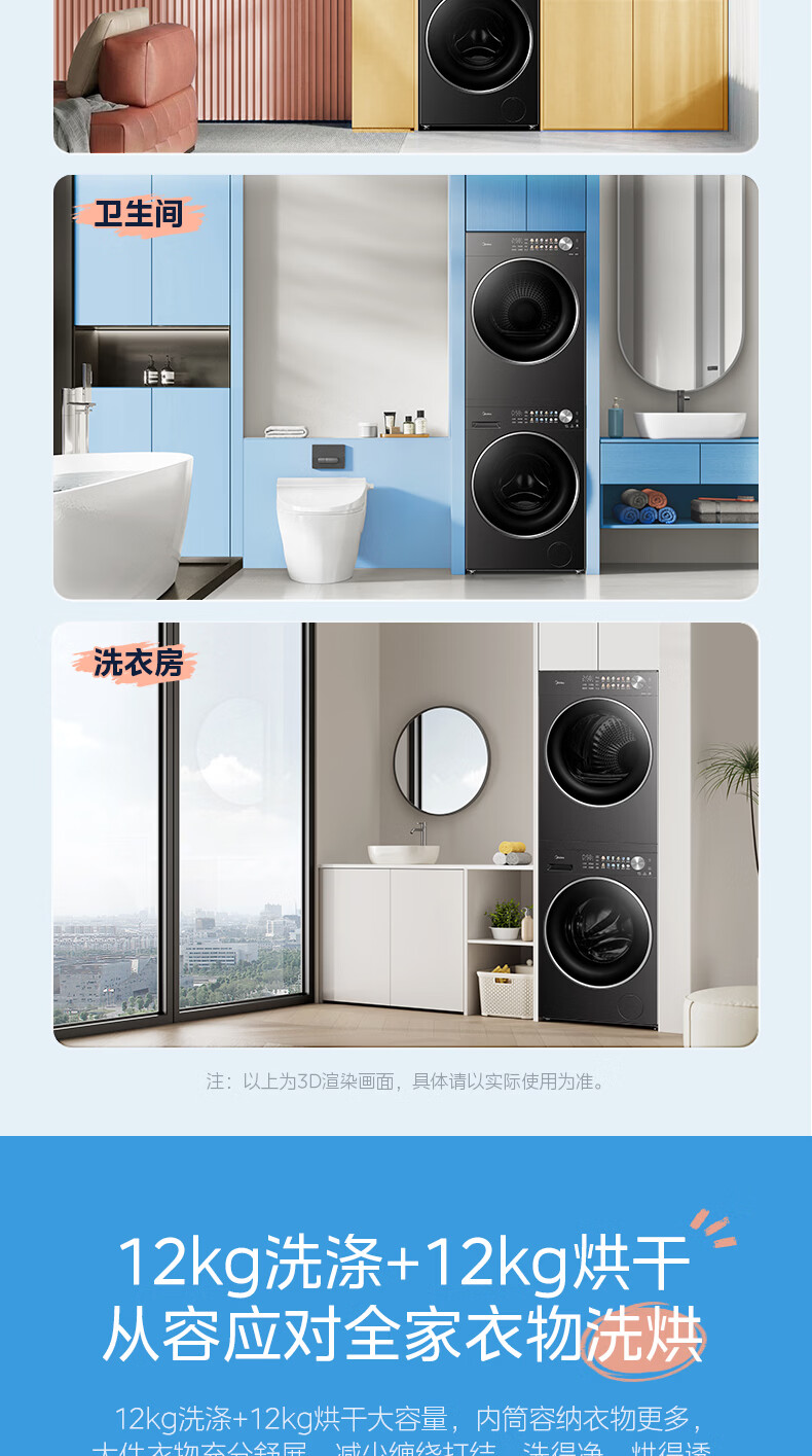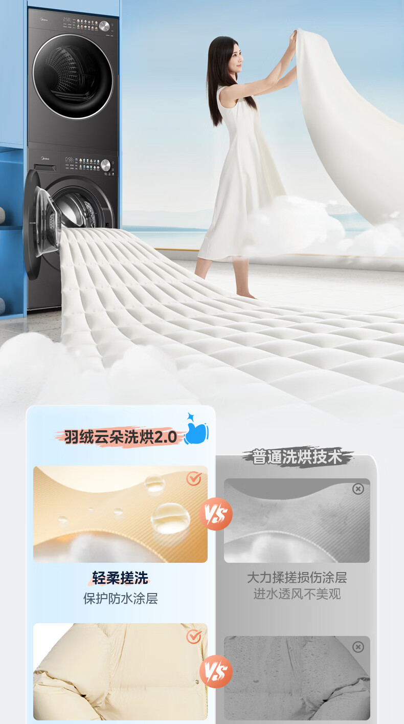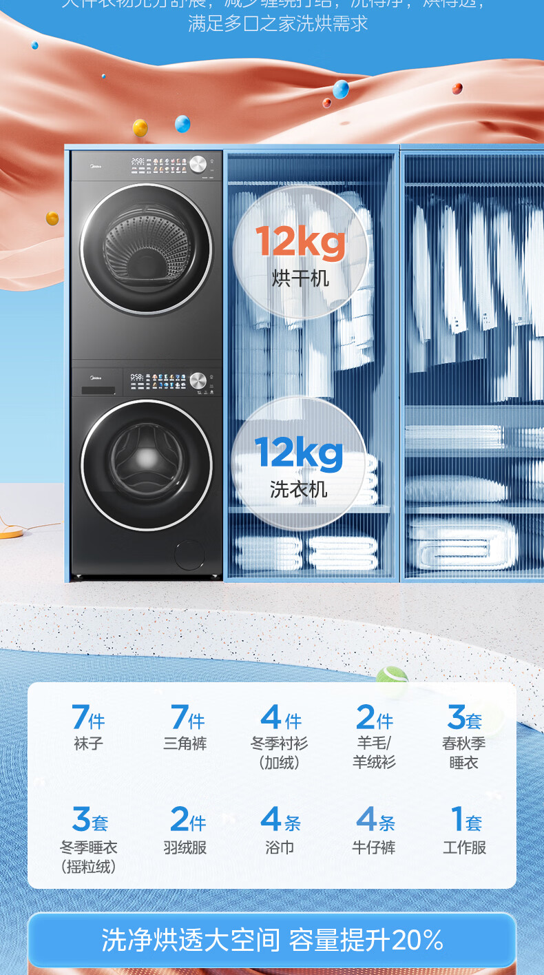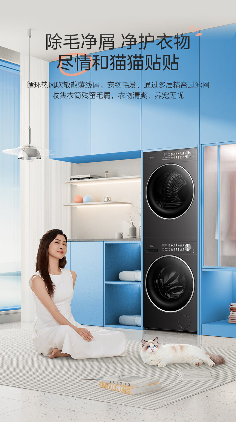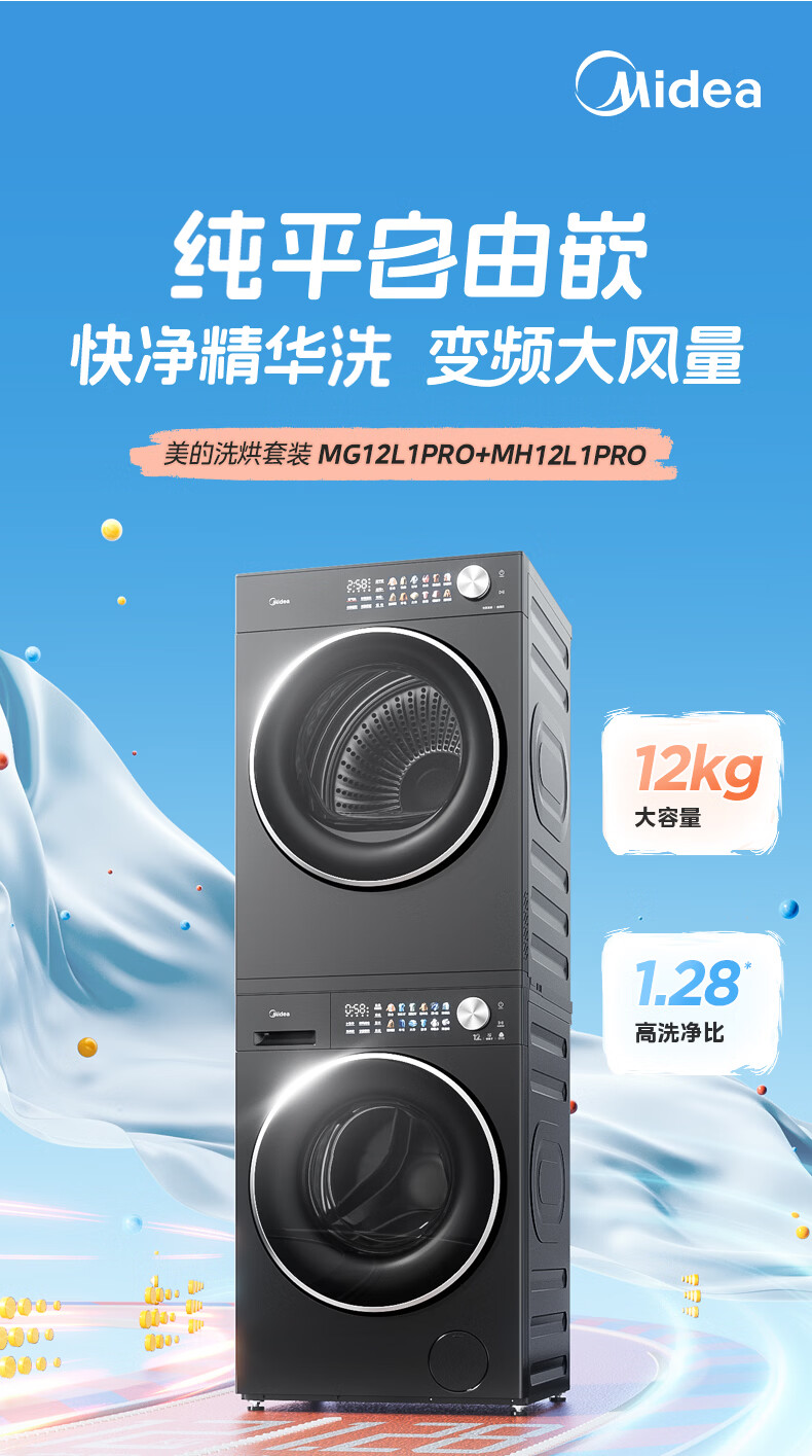 美的(Midea)洗烘套装12kg滚筒洗衣机+12kg热泵烘干机 全变频省水省电智能投放 1.28高洗净比智能判干除毛净屑一级能效 MG12L1PRO+MH12L1PRO