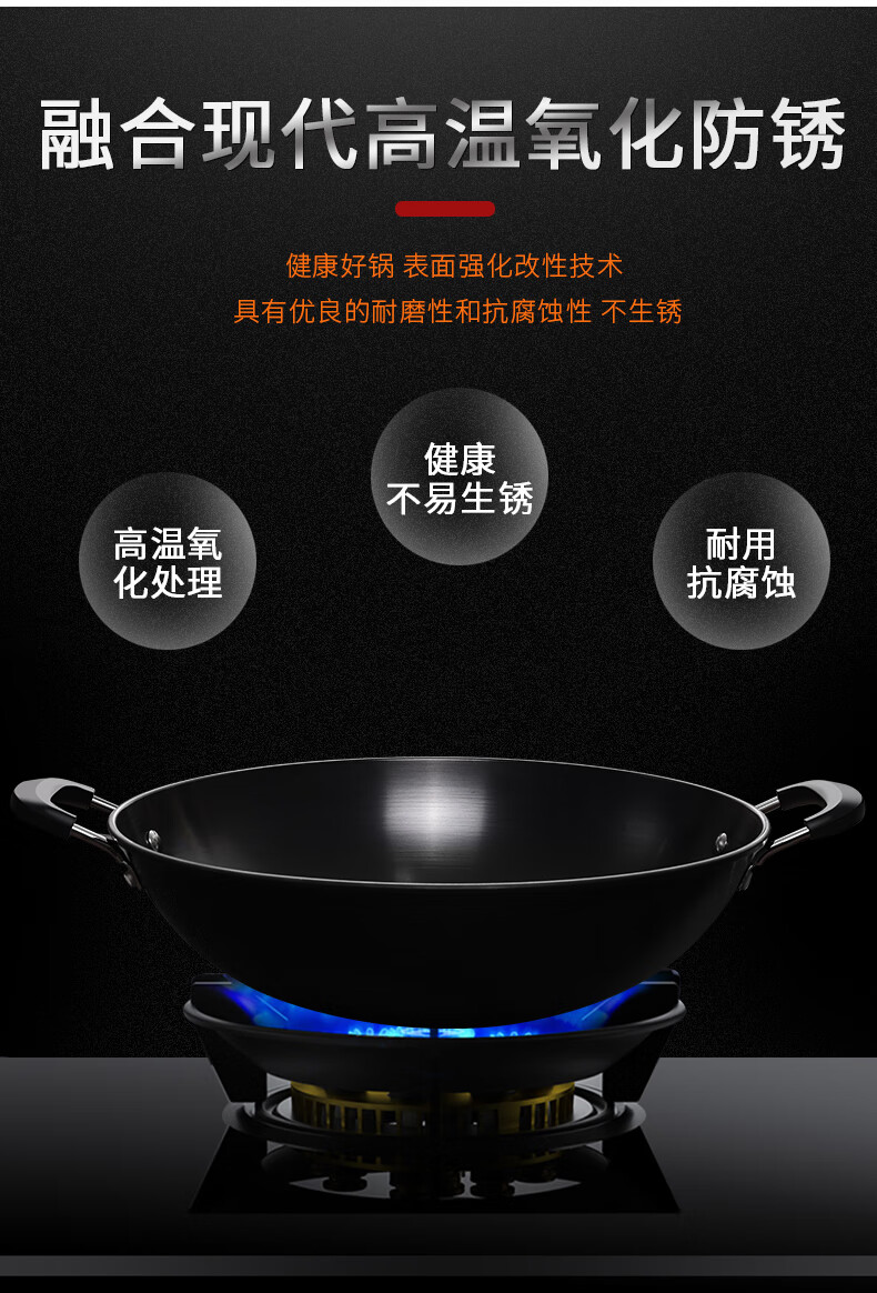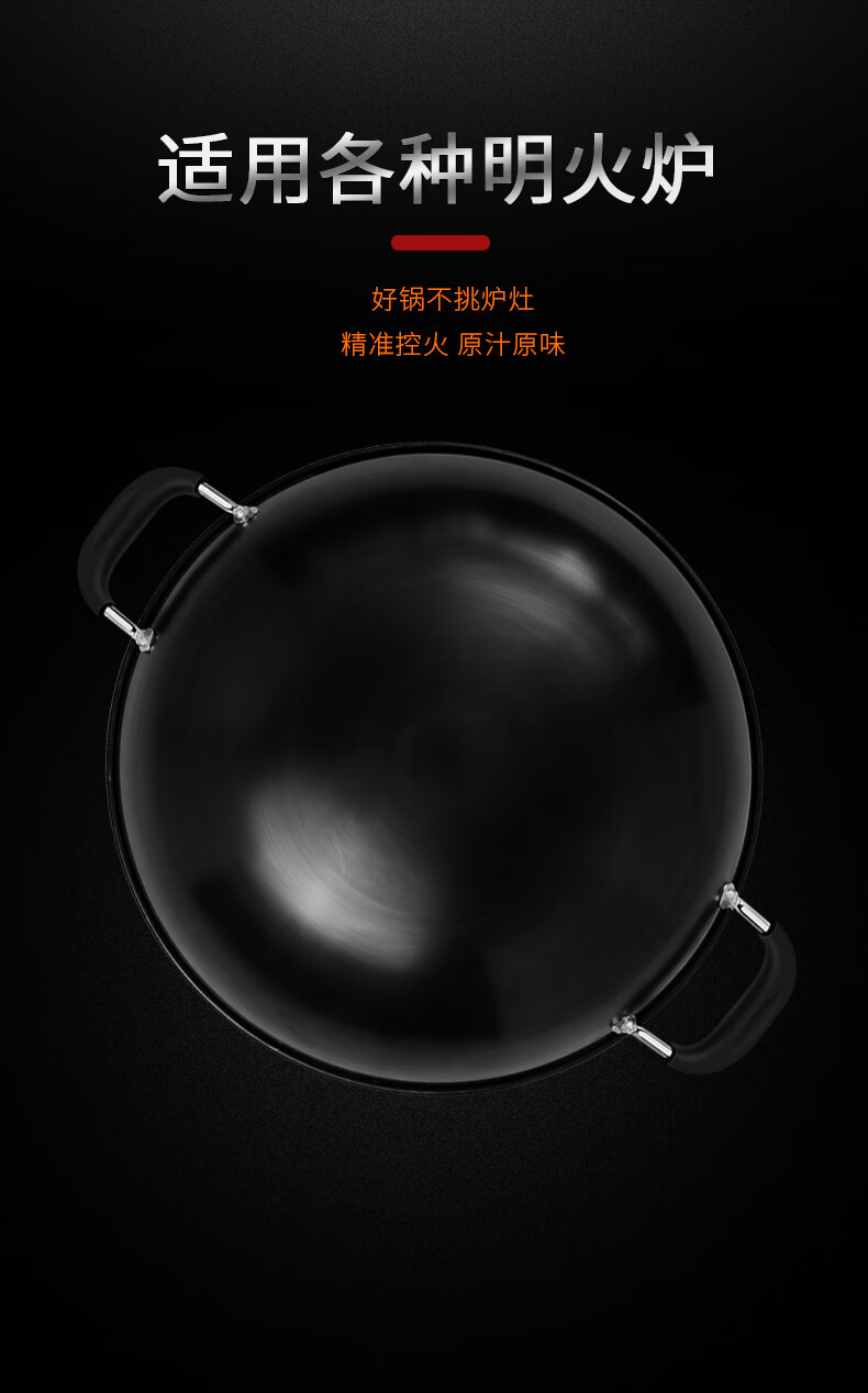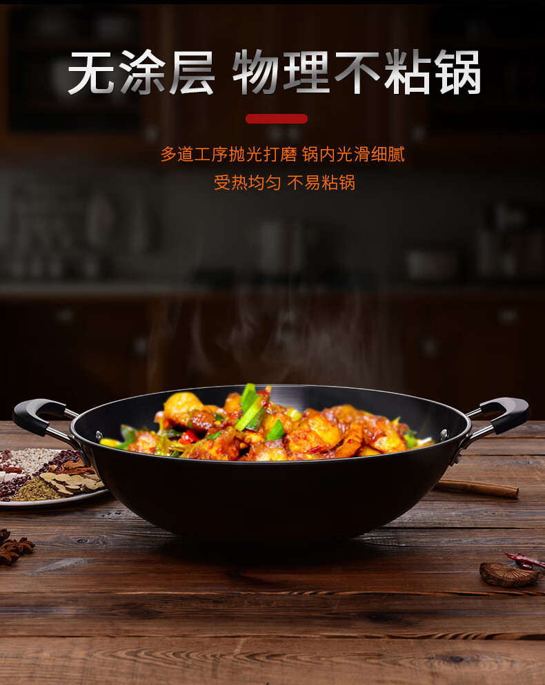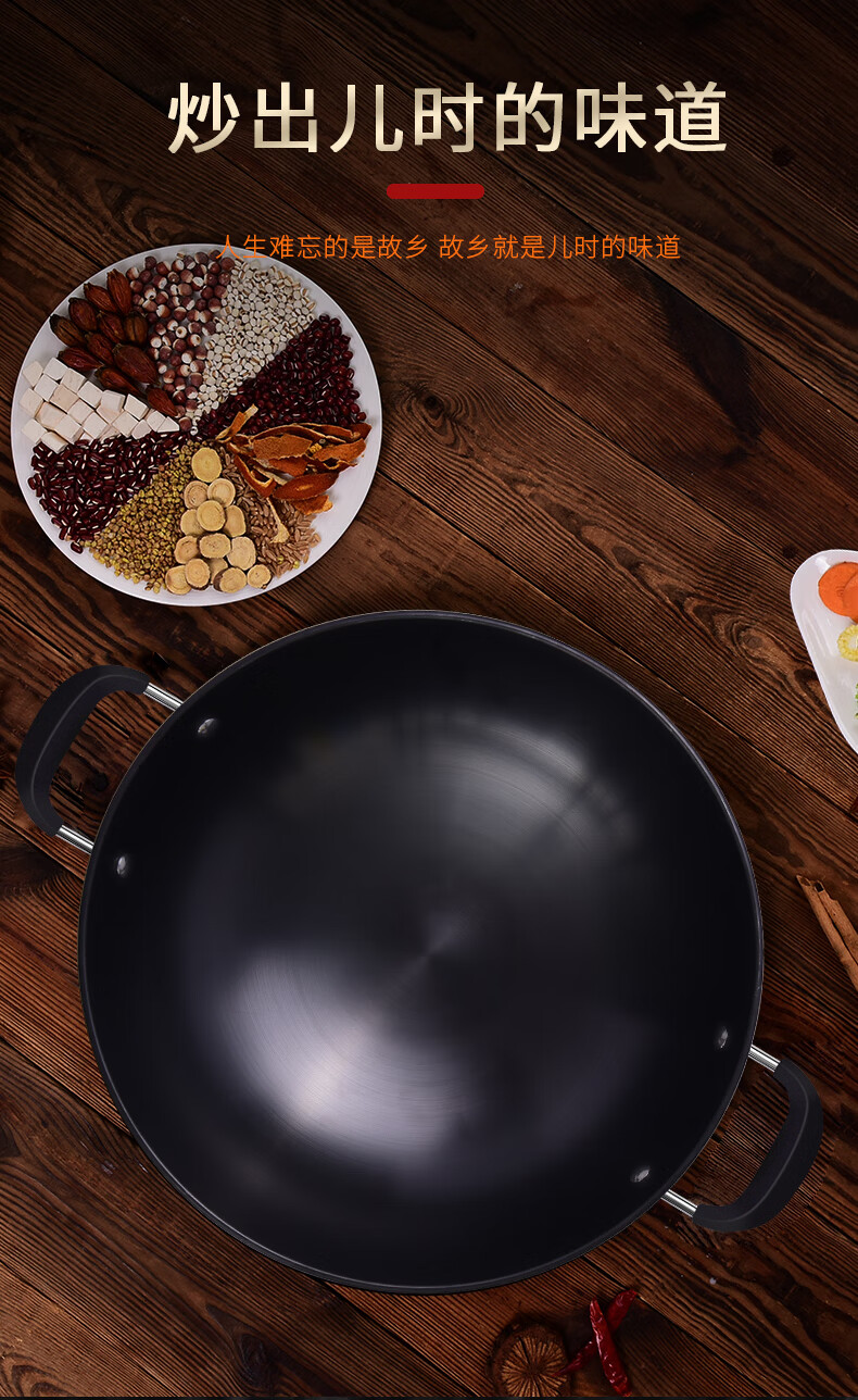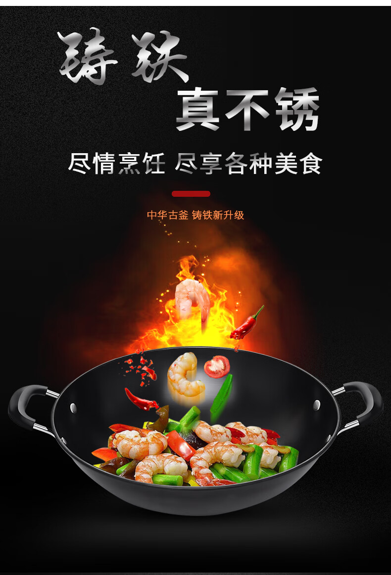 PJ双耳生铁锅大炒锅不粘锅煤气灶燃气灶铸铁炒菜锅具无涂层38 1寸 1寸50点cm炒锅适合9-14人鎹钢铲