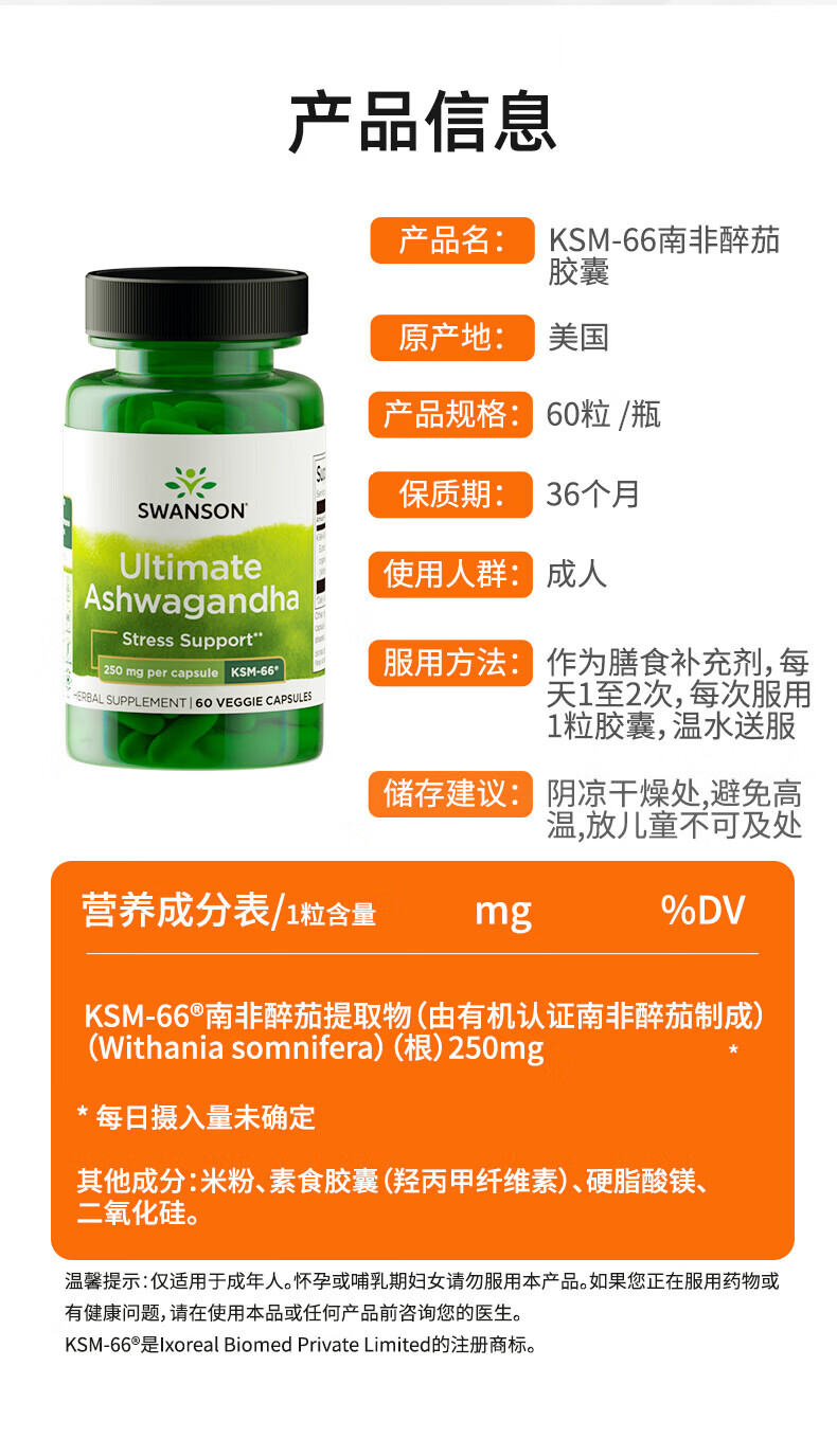 斯旺森(SWANSON)改善睡眠平静舒缓情绪缓解压力降低皮质醇改善失眠好梦无添加 舒缓情绪提升睡眠南非醉茄 100粒*2瓶 送2瓶褪黑素