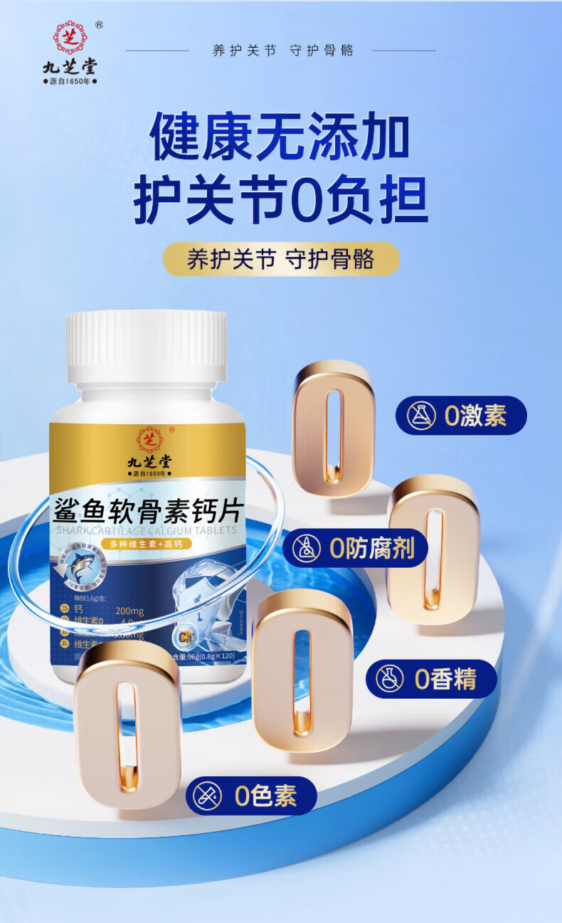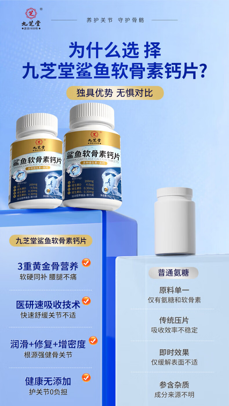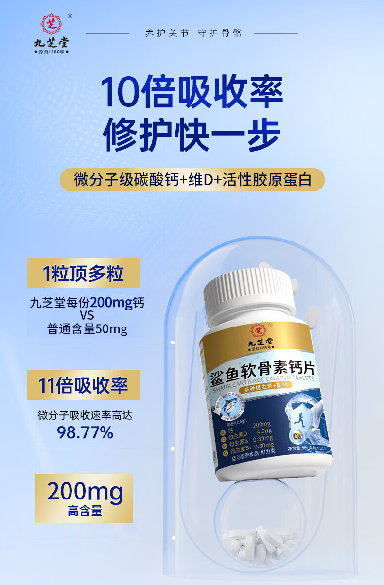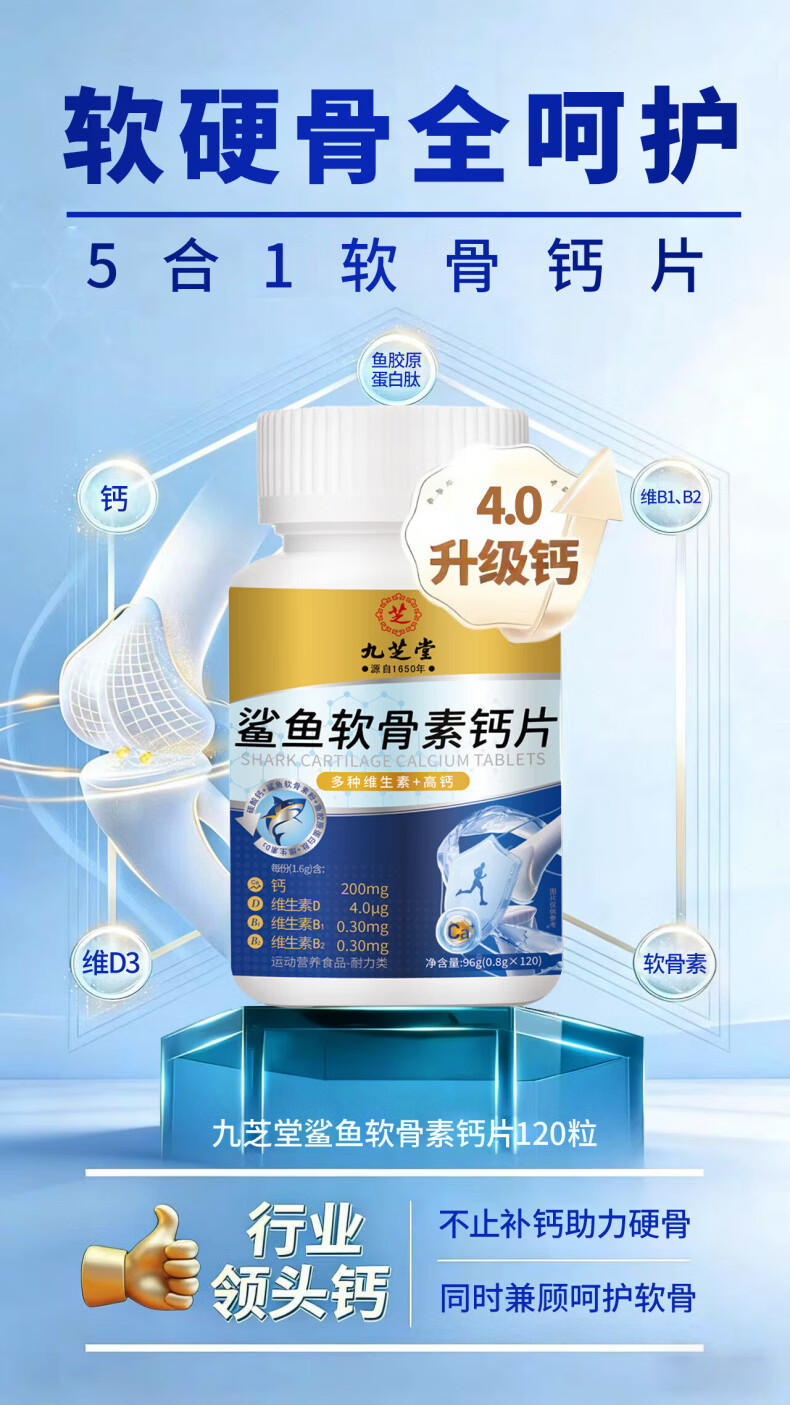 九芝堂鲨鱼软骨素钙片中老年人补钙钙片中老年人腿抽筋腰腿疼骨质疏松 1瓶【关节养护】 120片*1瓶