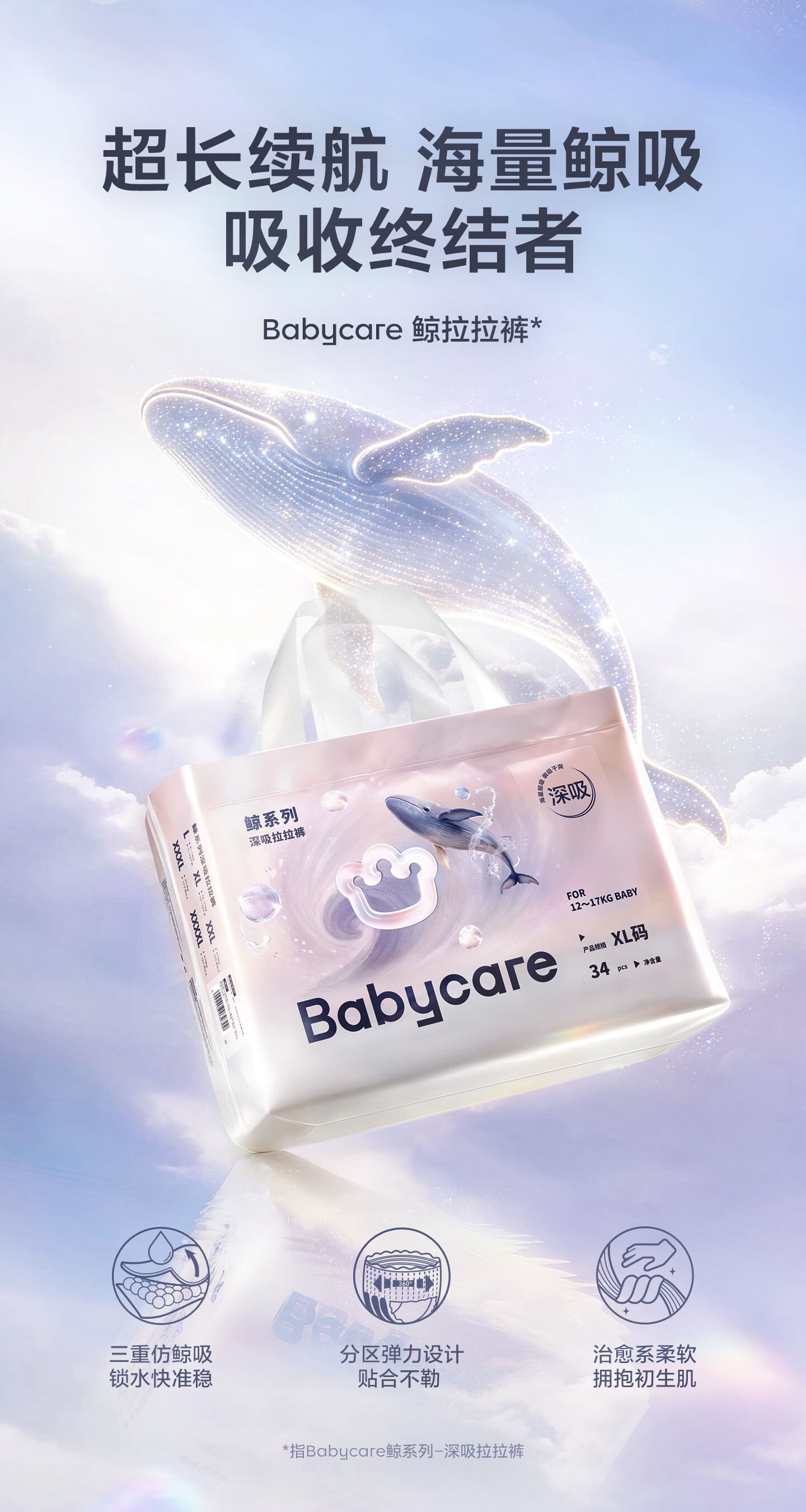 babycare【重磅新品】Babycare鲸拉拉裤婴幼儿大吸量尿不湿透气干爽深吸裤 XL 1包 34片 鲸-拉拉裤-正装