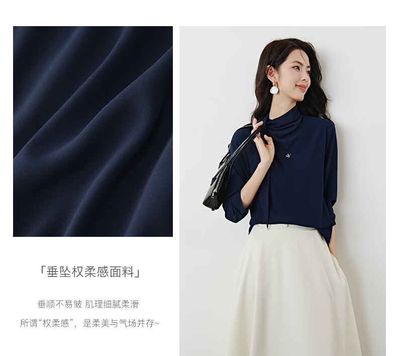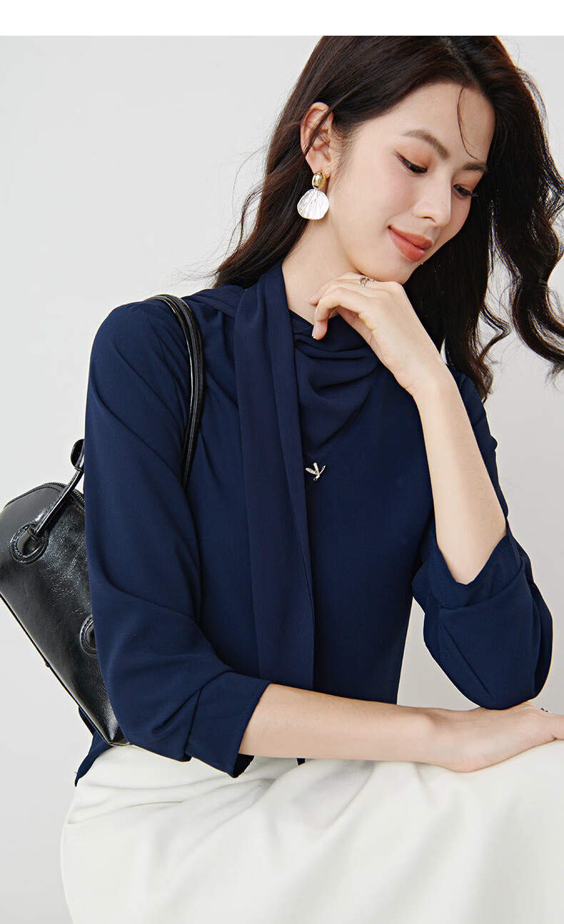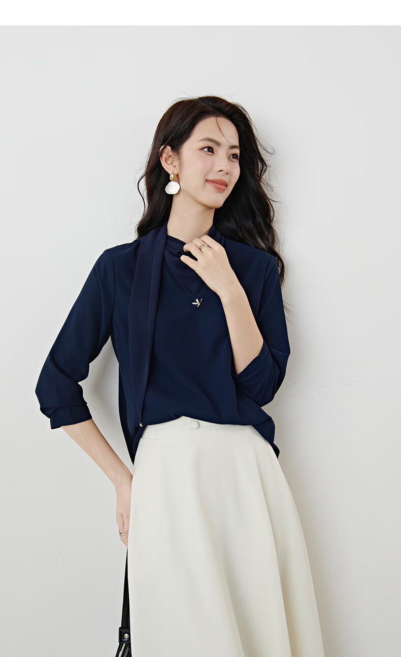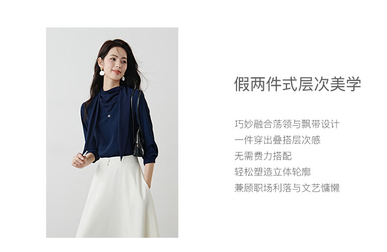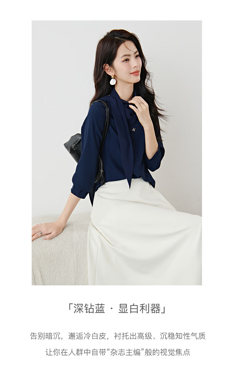 晚白2026年春款垂感系带蝴蝶结领假两件上衣干练通勤行政蓝衬衫女 深蓝色 S