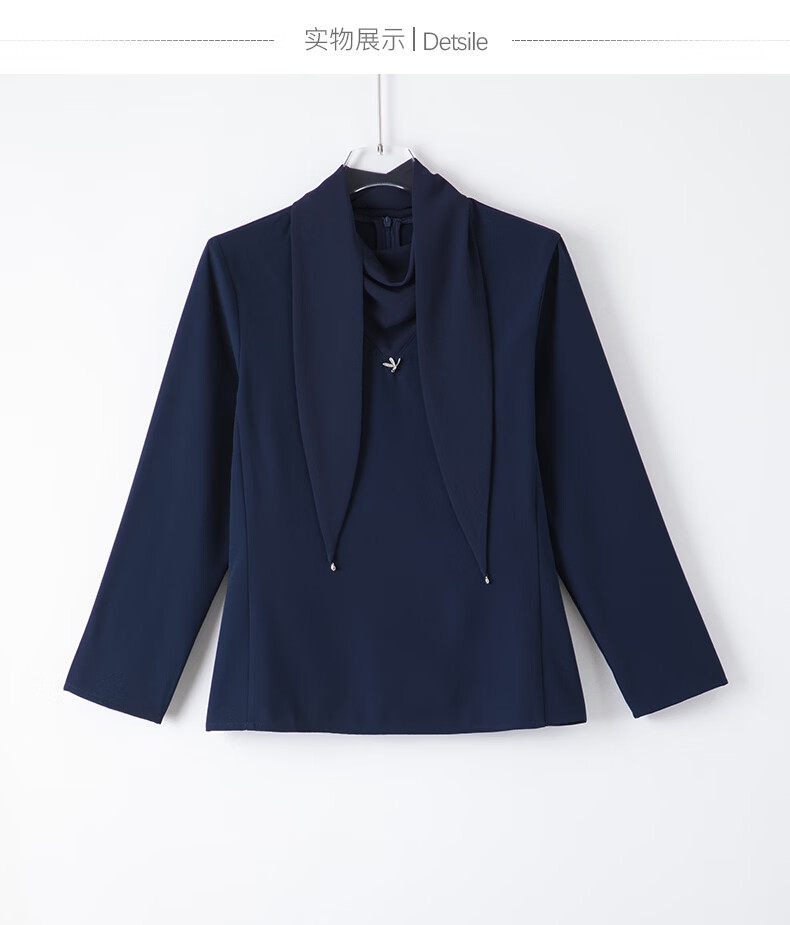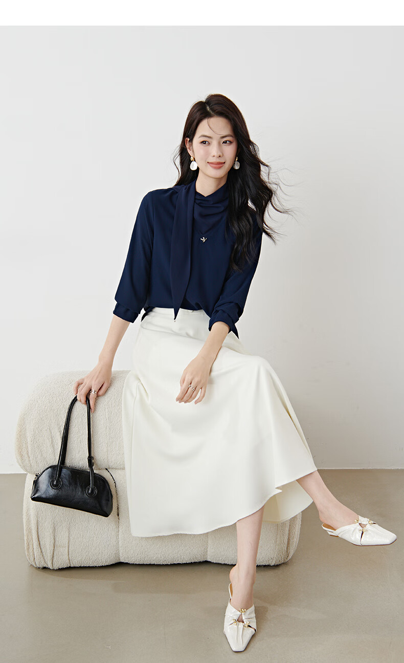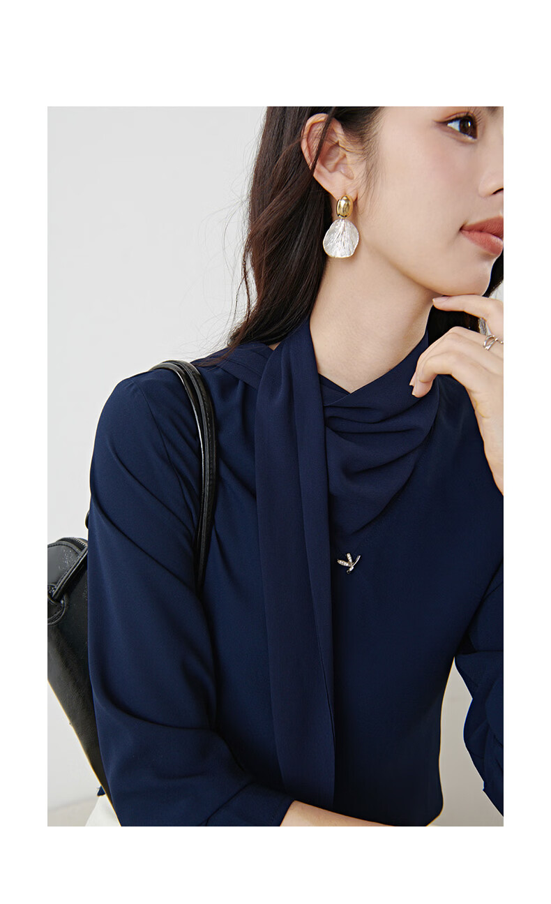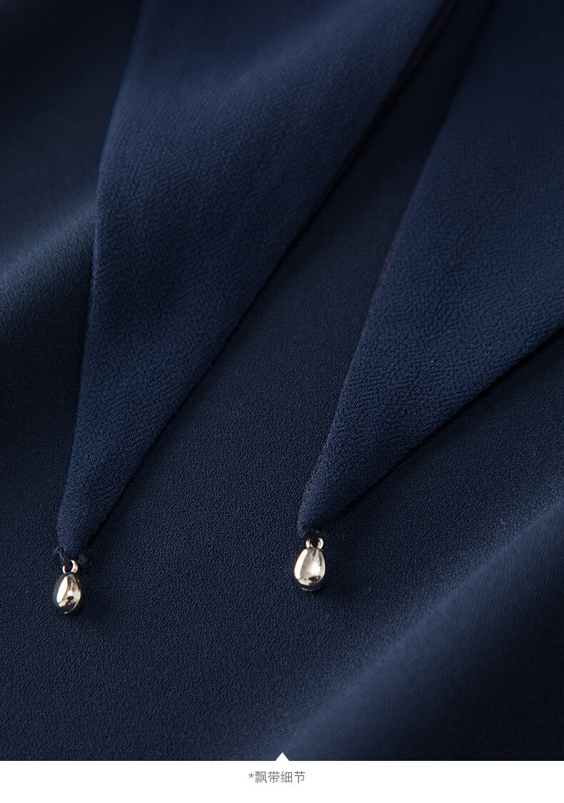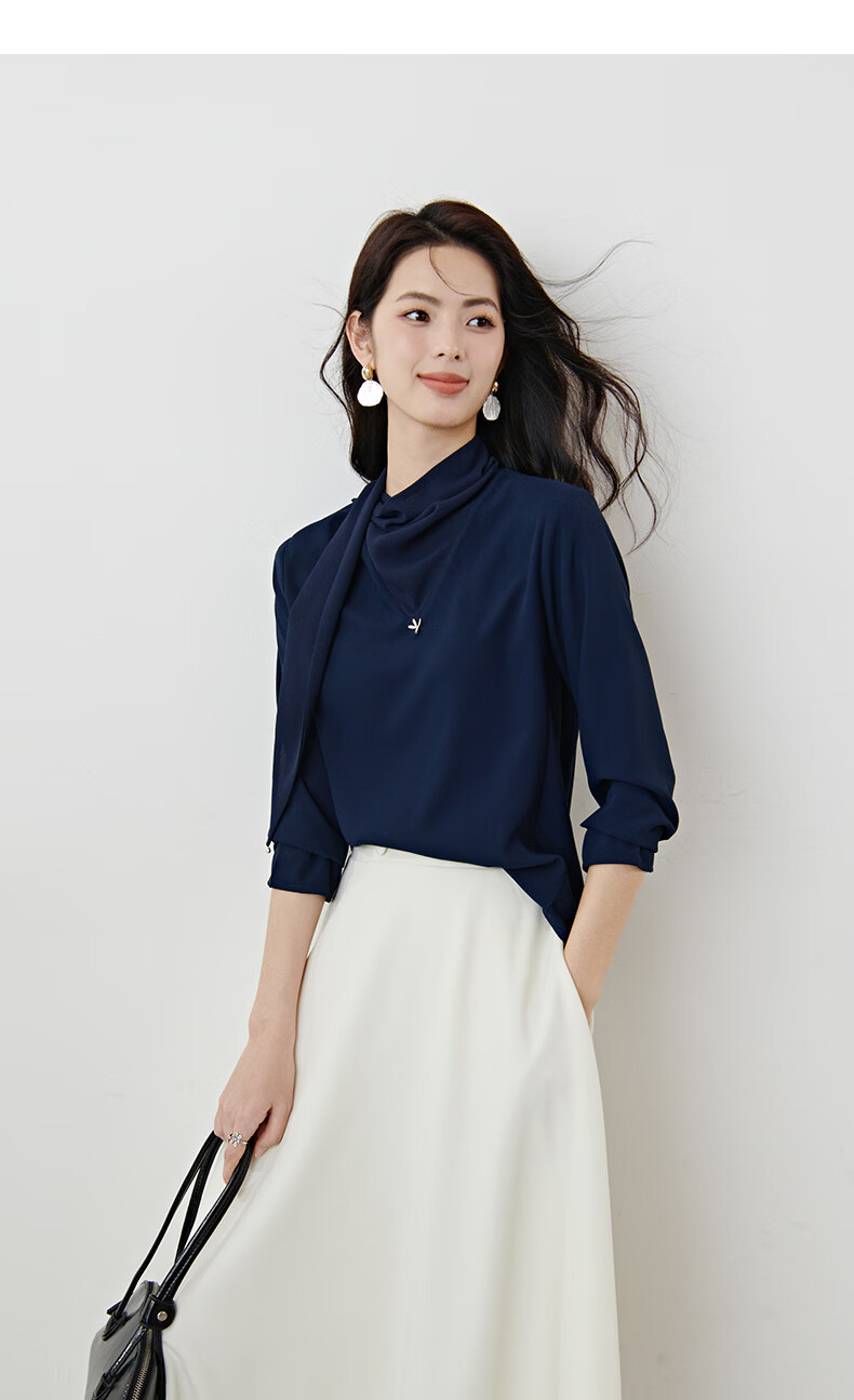 晚白2026年春款垂感系带蝴蝶结领假两件上衣干练通勤行政蓝衬衫女 深蓝色 S