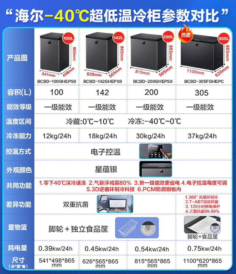 海尔(Haier)超低温冰柜家用小型零下40度冷柜无需频繁除霜电子温控PCM内胆一级能效速冻冷藏冷冻柜以旧换新 -40度细胞级冷冻|电子控温|双重抗菌 100L