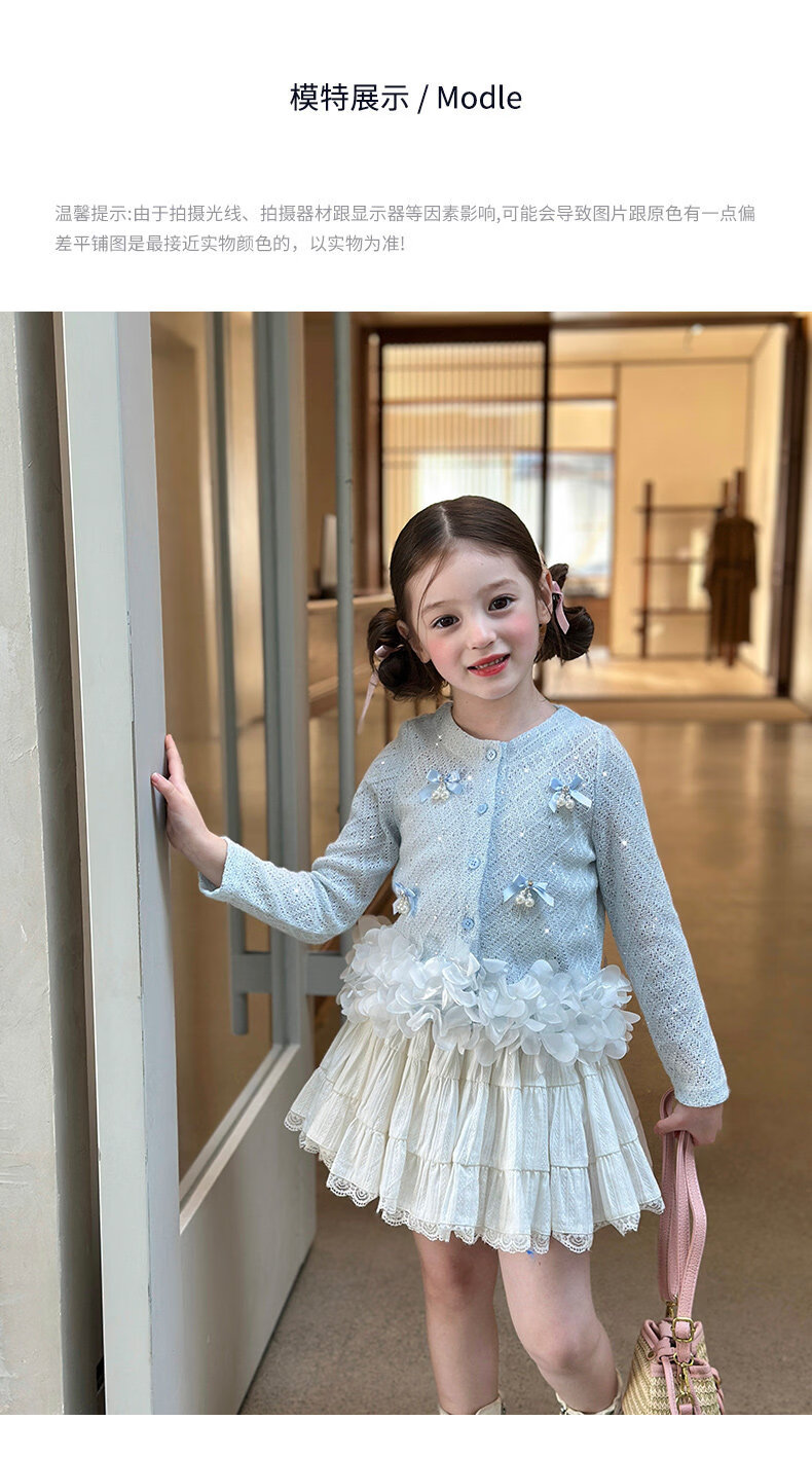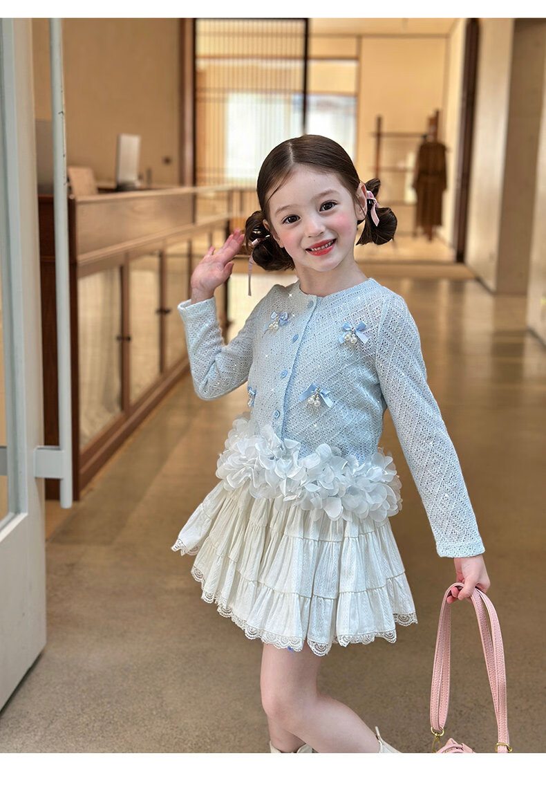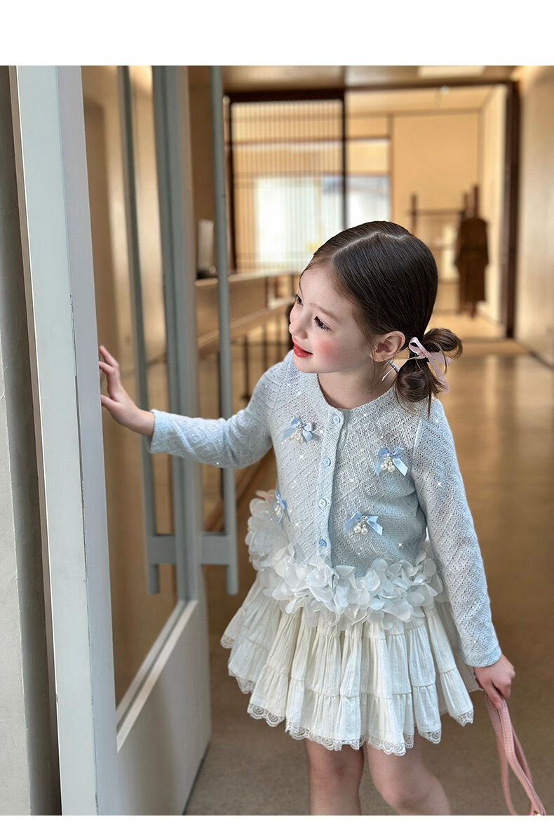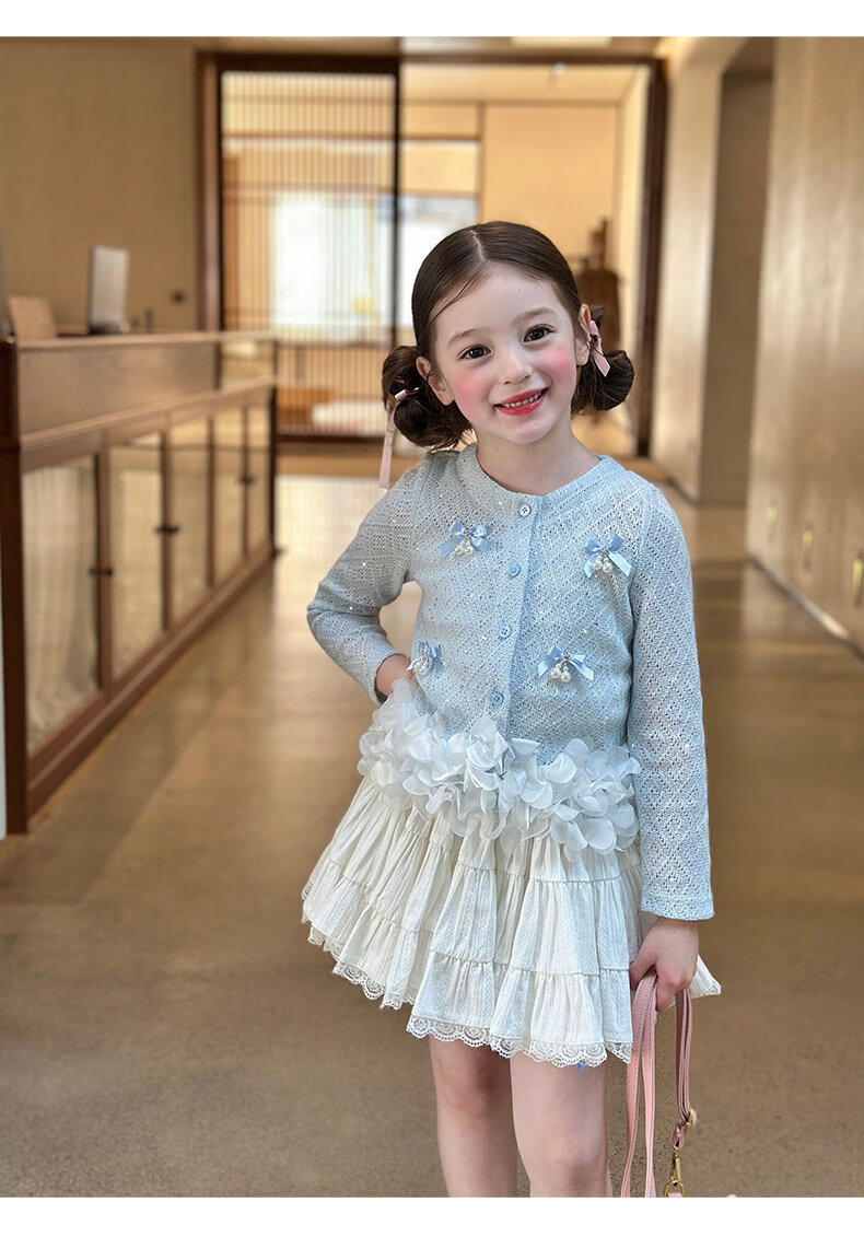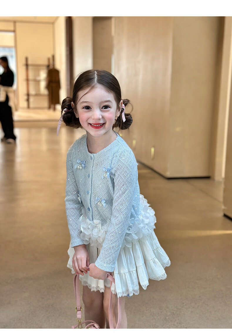 栀了成长记童装女童韩版时髦上衣2026春季儿童甜美蝴蝶结针织开衫 蓝色 上衣 100 cm