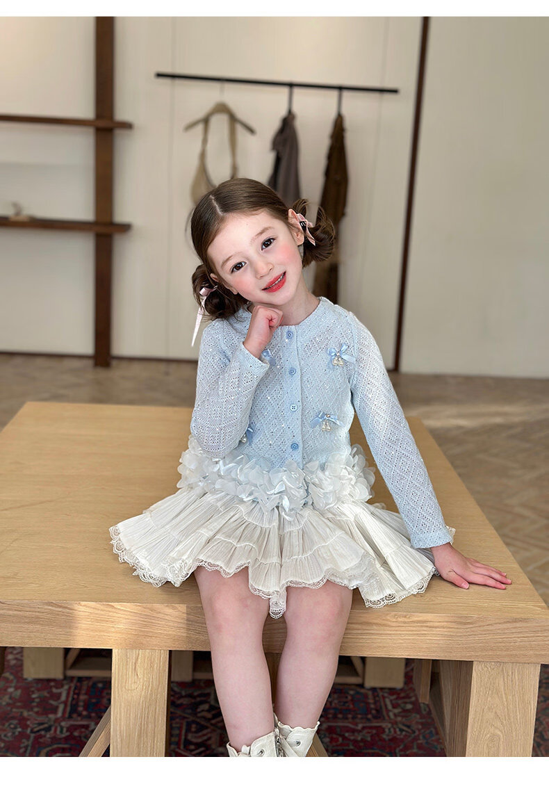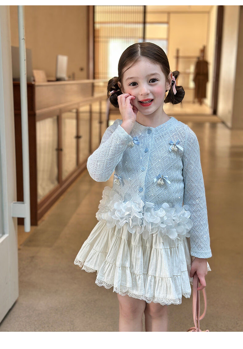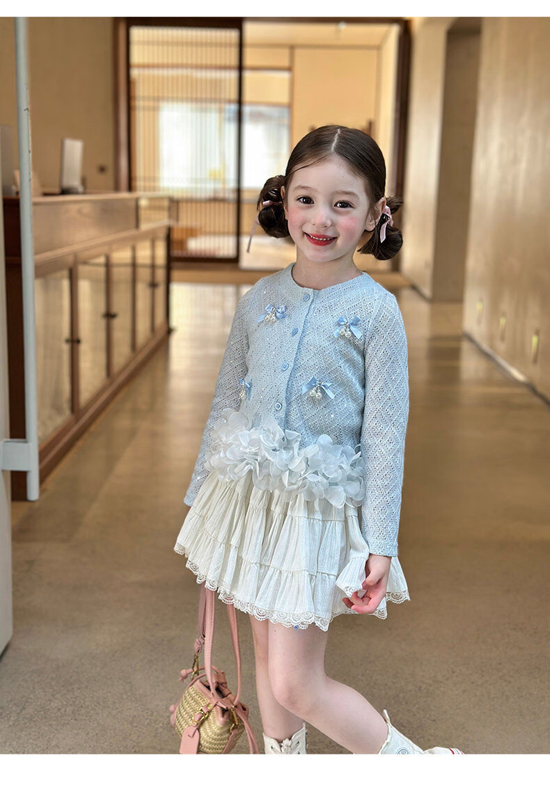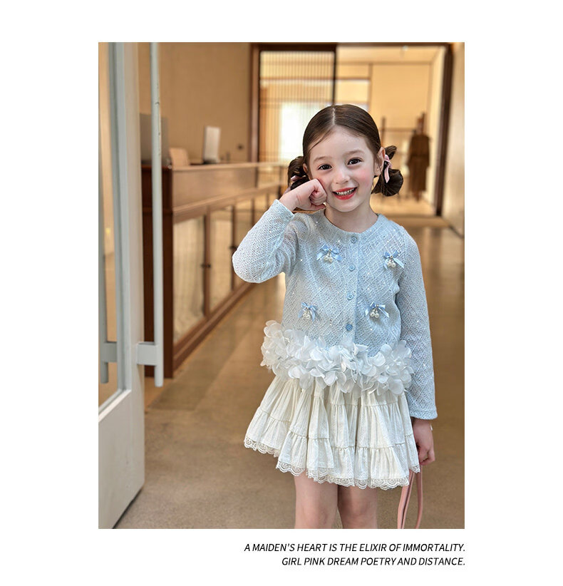 栀了成长记童装女童韩版时髦上衣2026春季儿童甜美蝴蝶结针织开衫 蓝色 上衣 100 cm