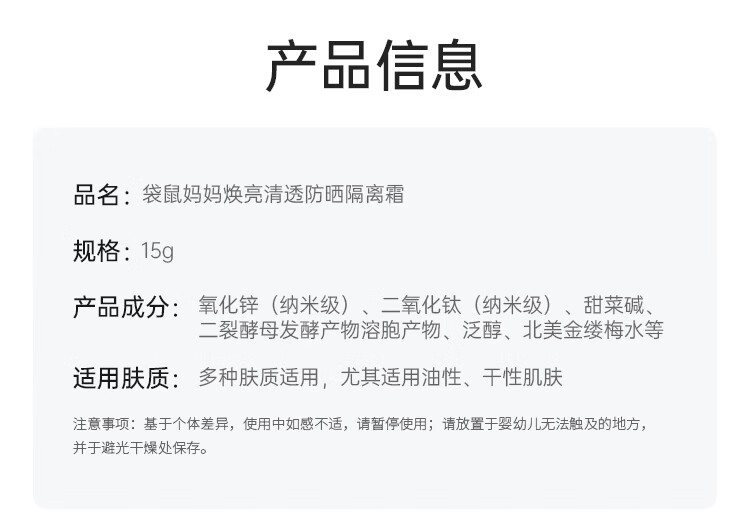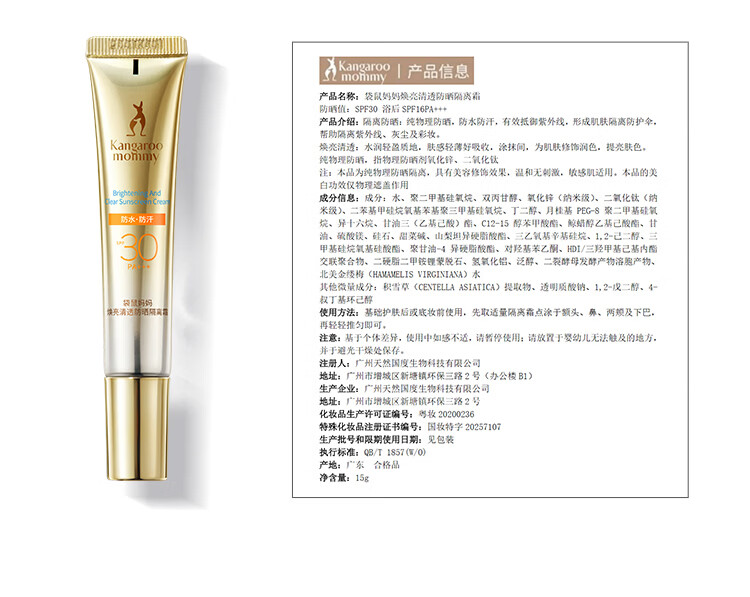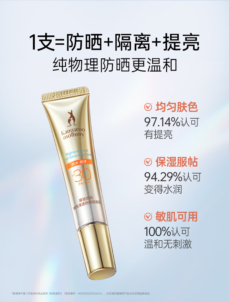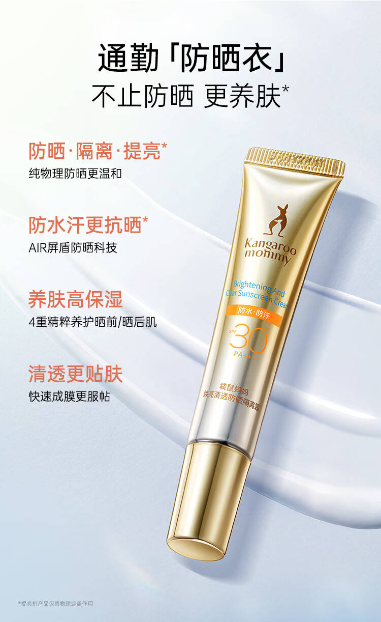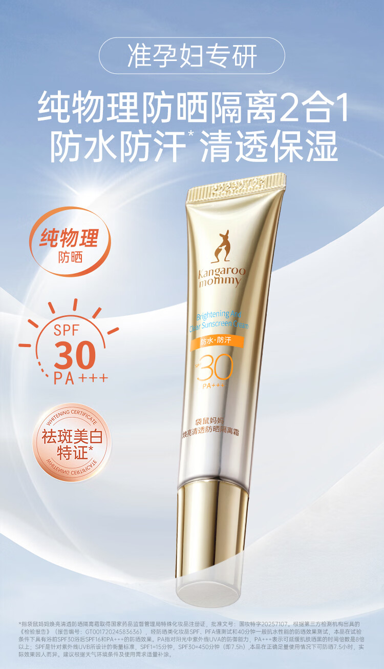 袋鼠妈妈准孕妇防晒霜物理防晒乳防紫外线女士水感清透养肤隔离二合一 【30PA+++】防晒乳15g*2支