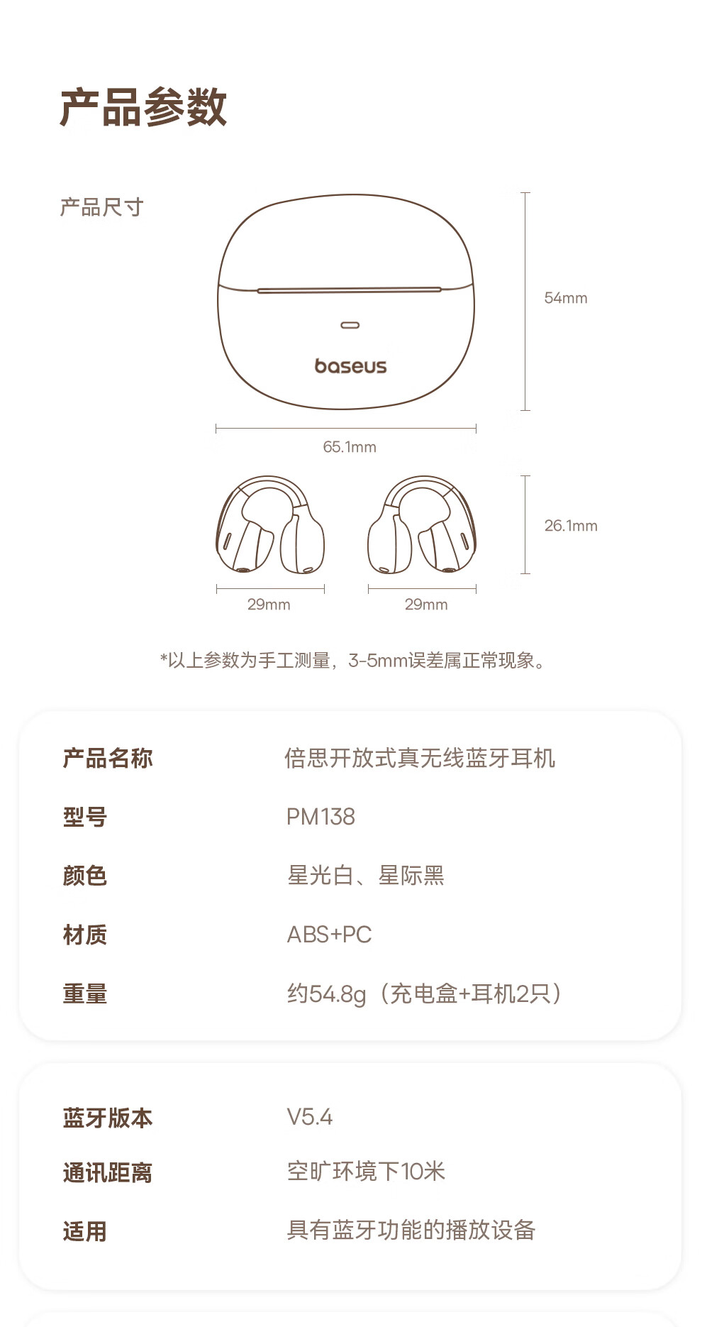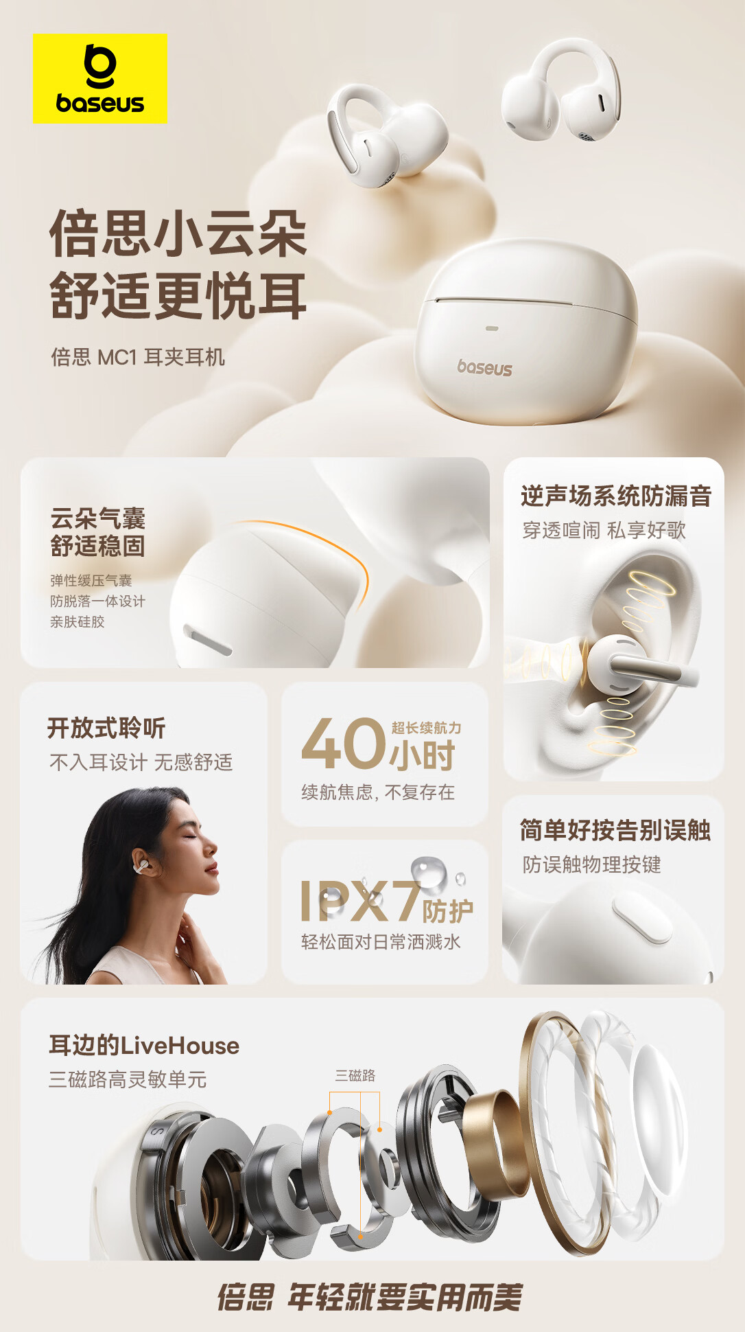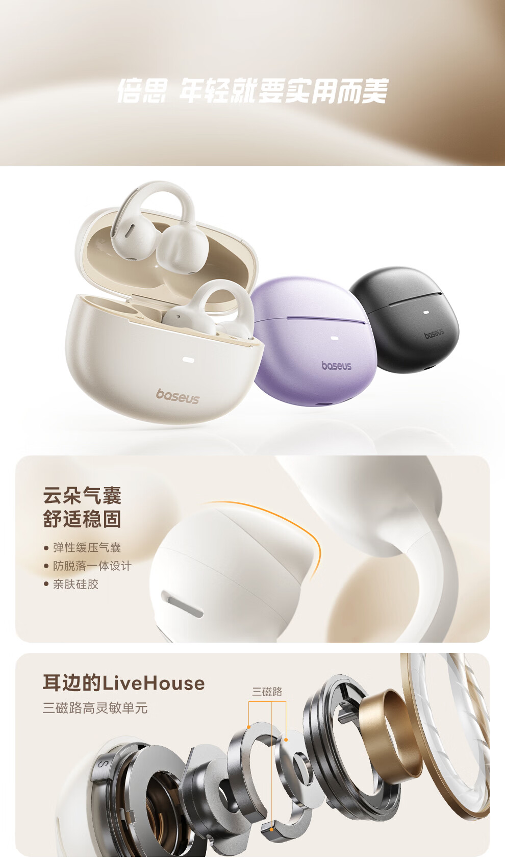BASEUS耳机蓝牙不伤耳朵2026新款耳夹式开放式气骨传导无线不入耳运动跑步高音质耳机运动跑步专用耳机 白色 【冰川】—白 开放式不入耳运动耳机