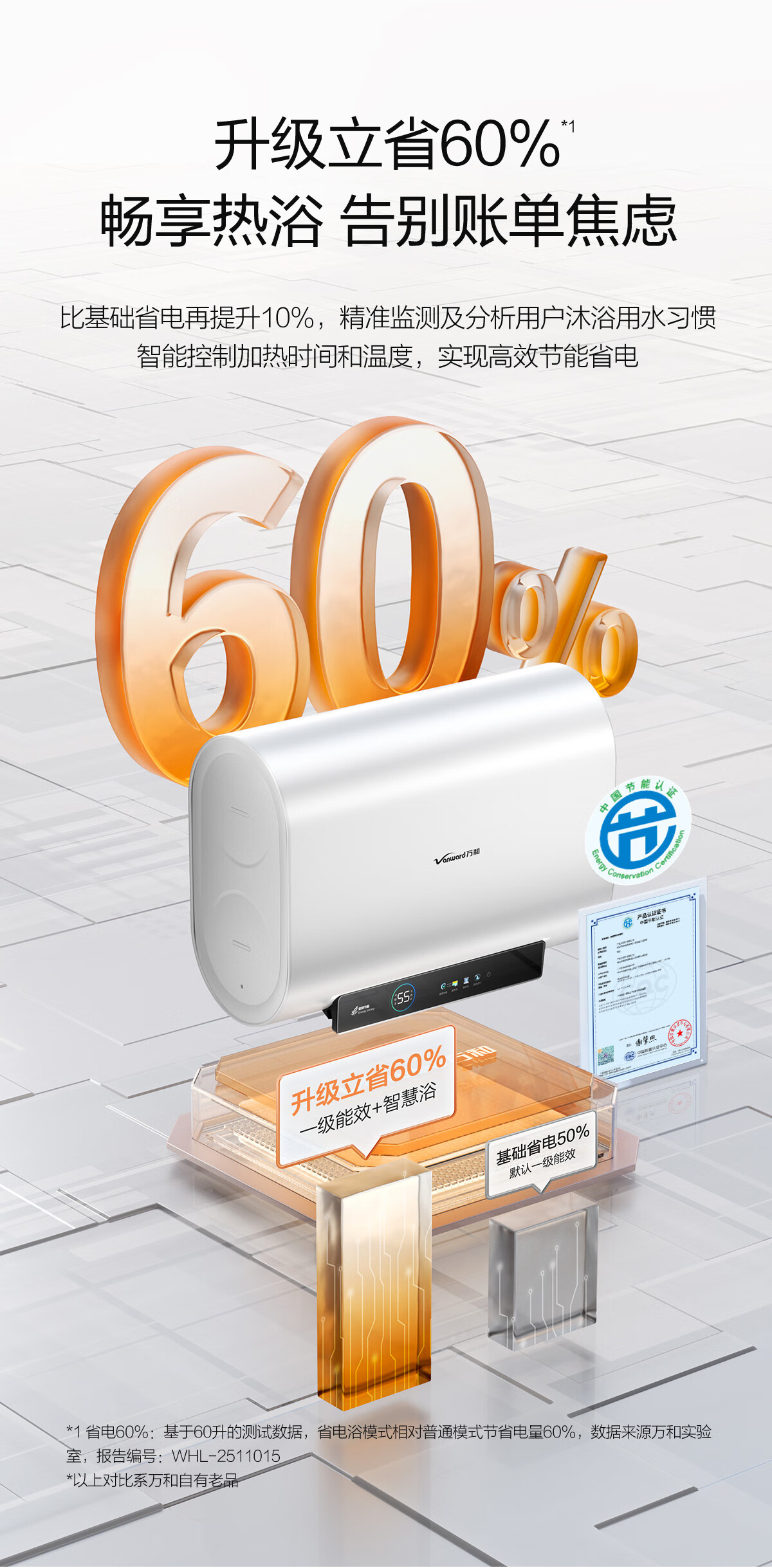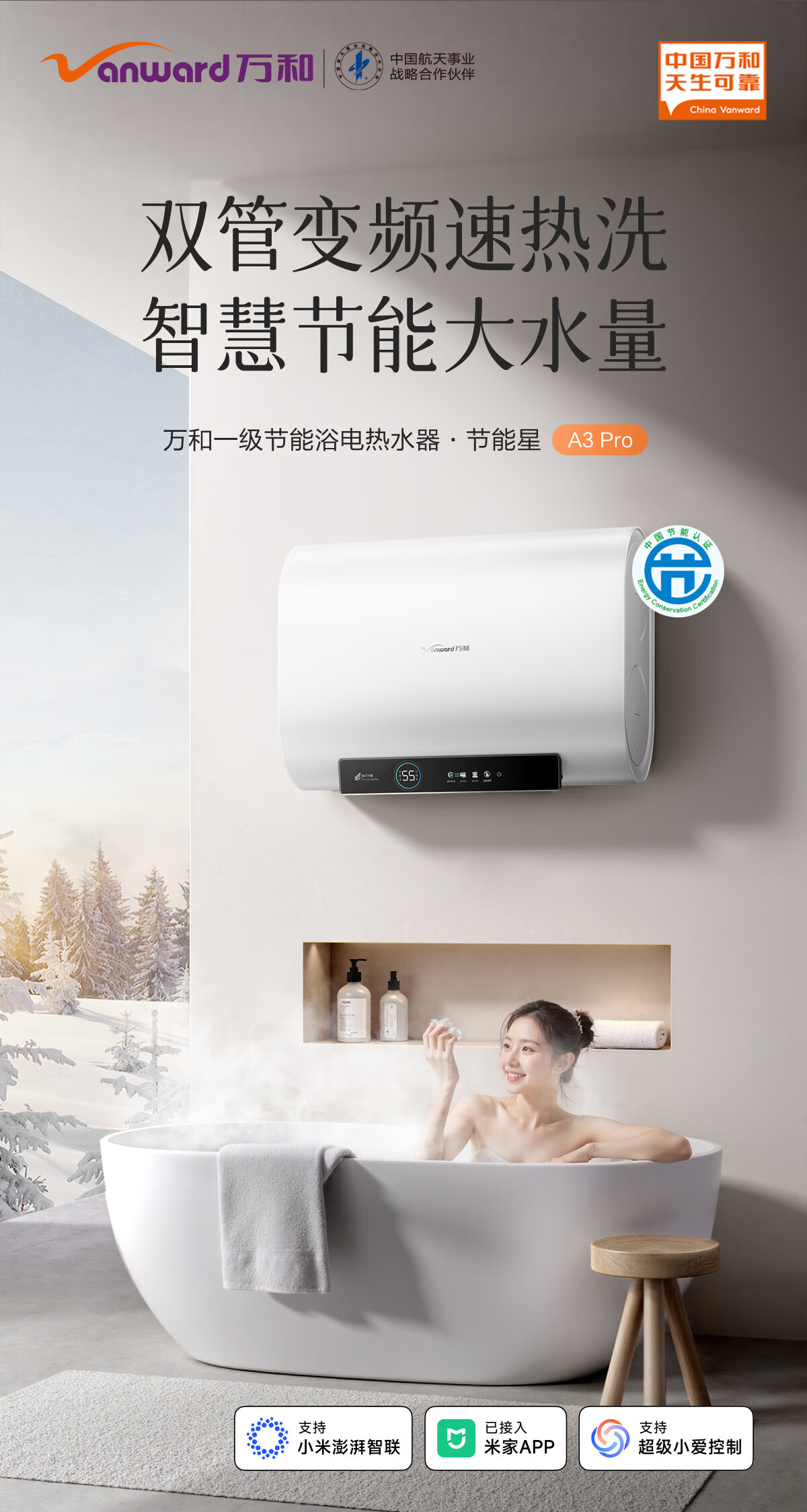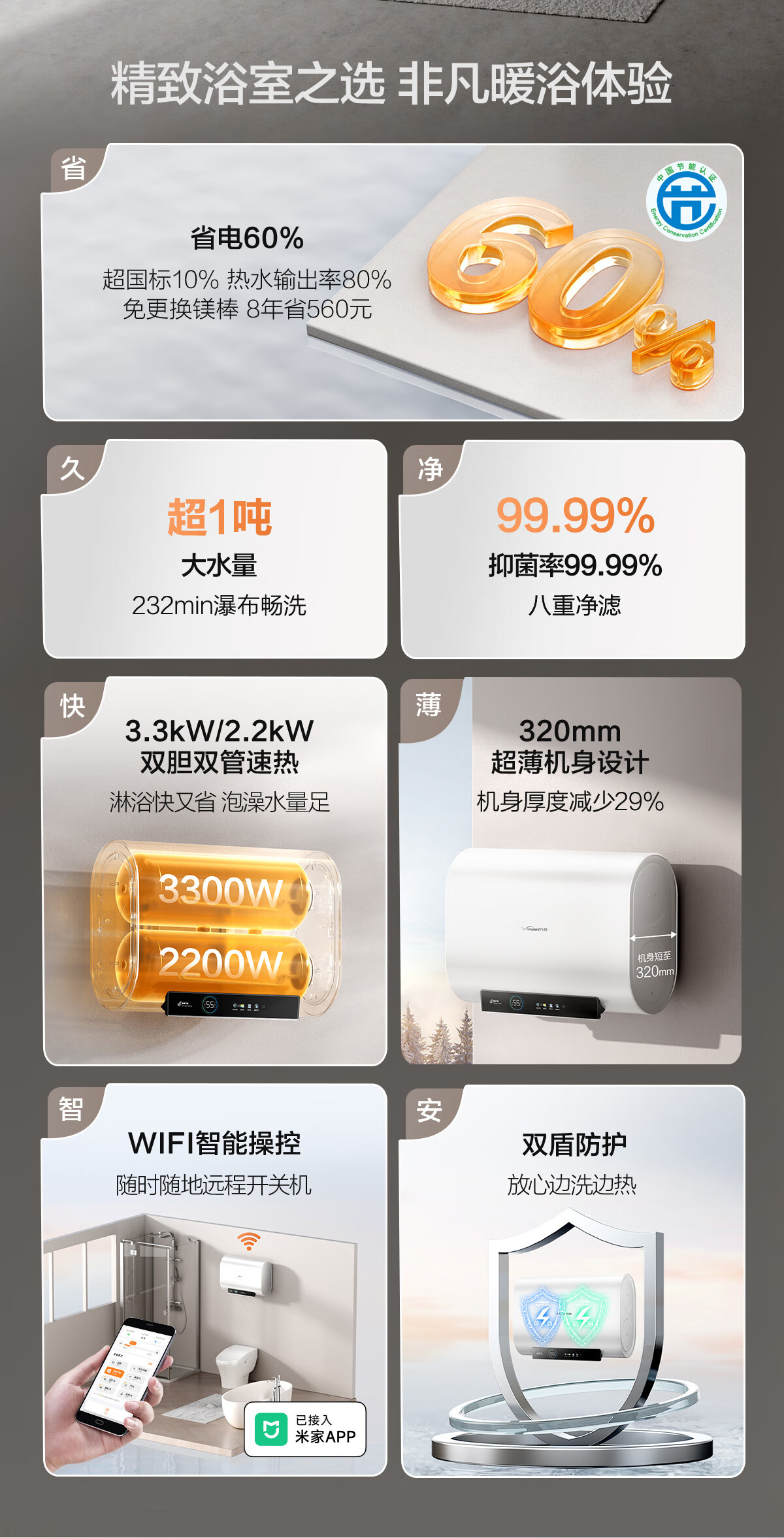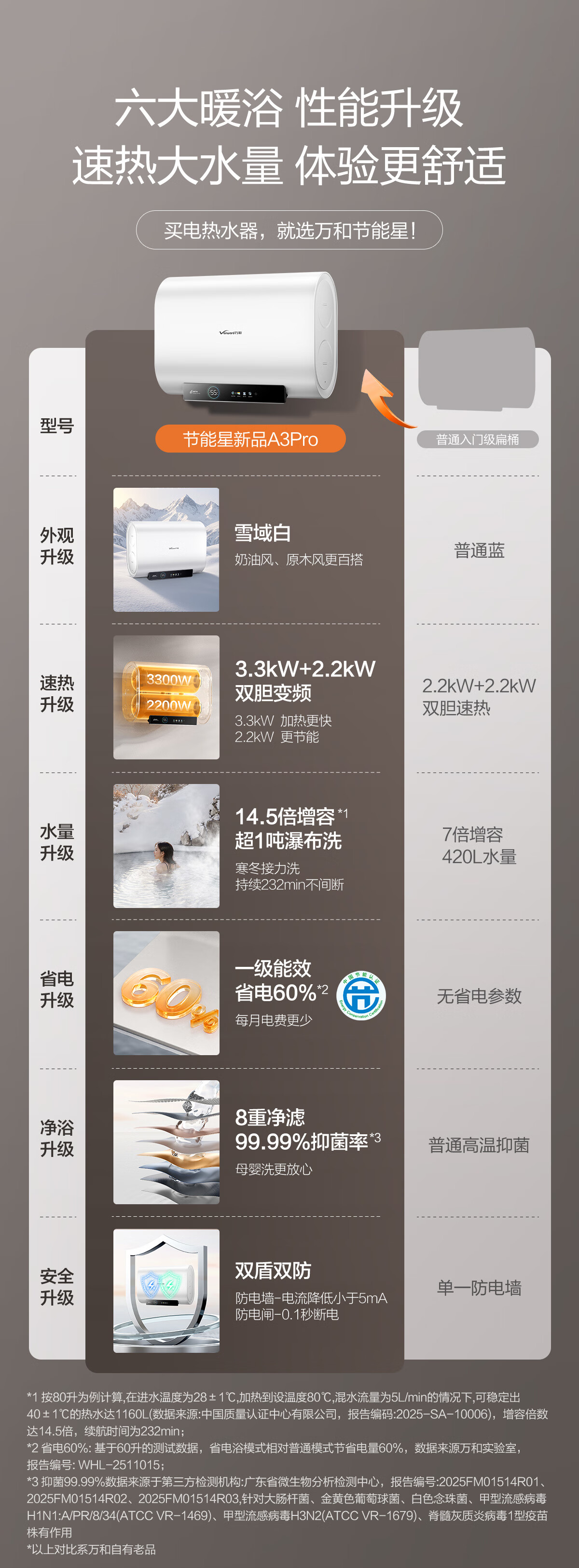 万和【节能星A3Pro】80升超薄双胆扁桶3300W变频速热免换镁棒超1吨大水量一级能效电热水器国家补贴15%
