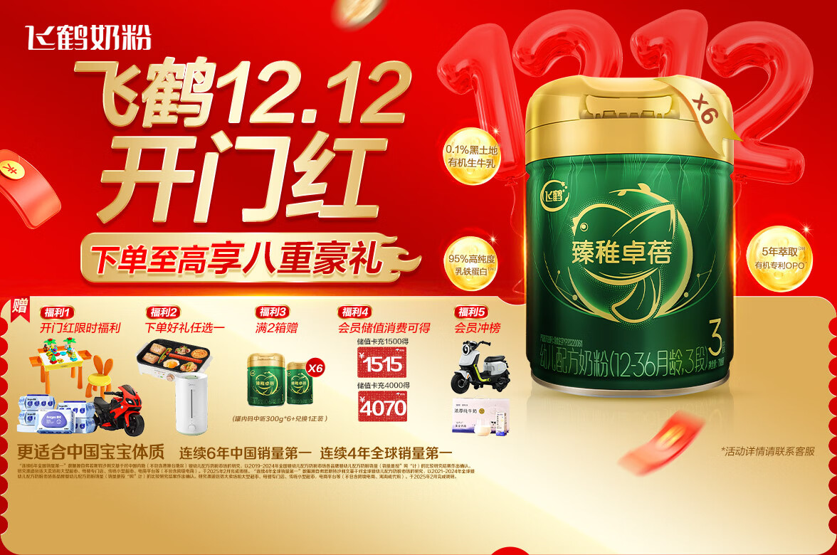 飞鹤臻稚卓蓓有机乳铁蛋白育儿补贴幼儿配方奶粉3段(1-3岁)700g*6罐