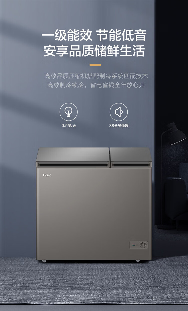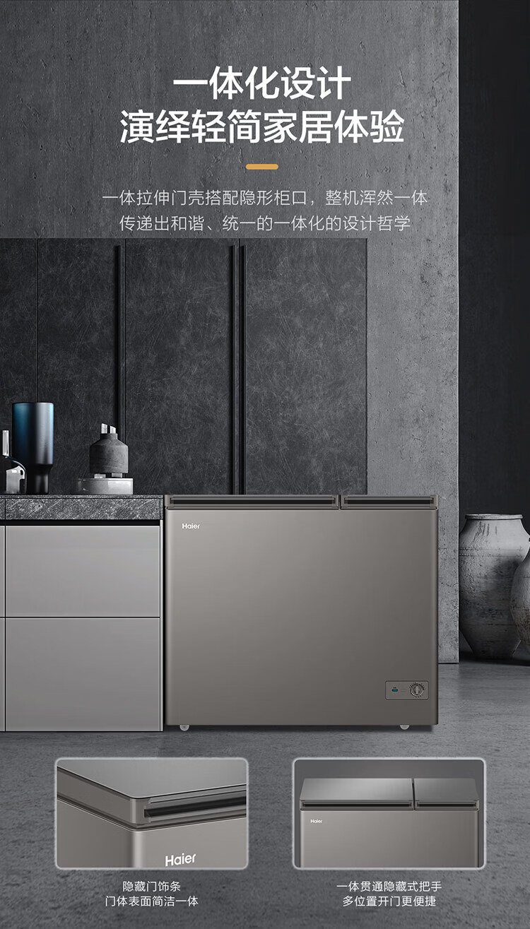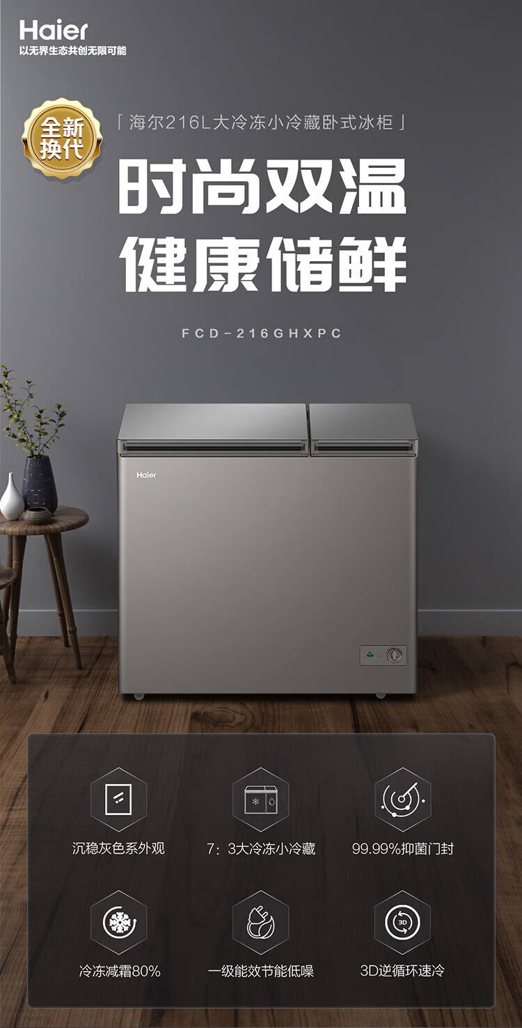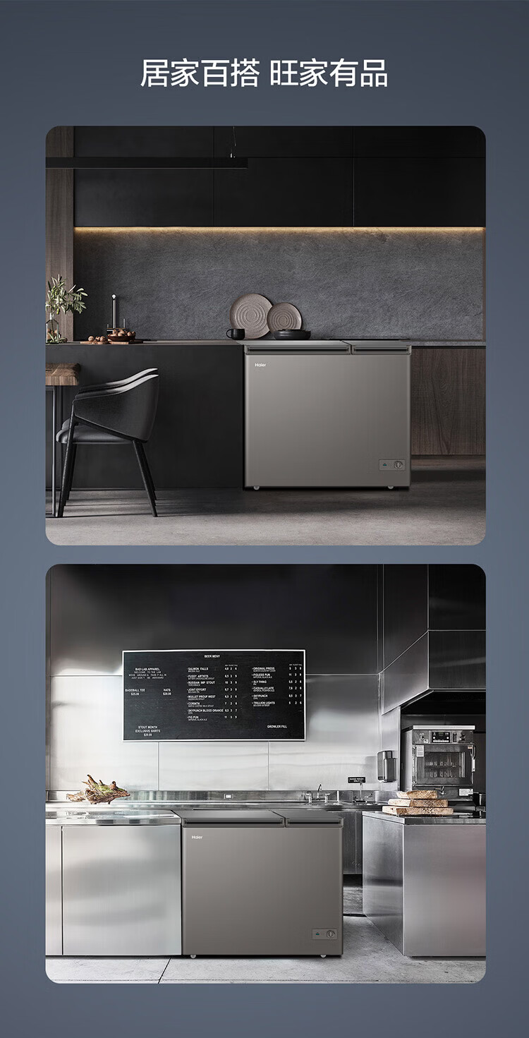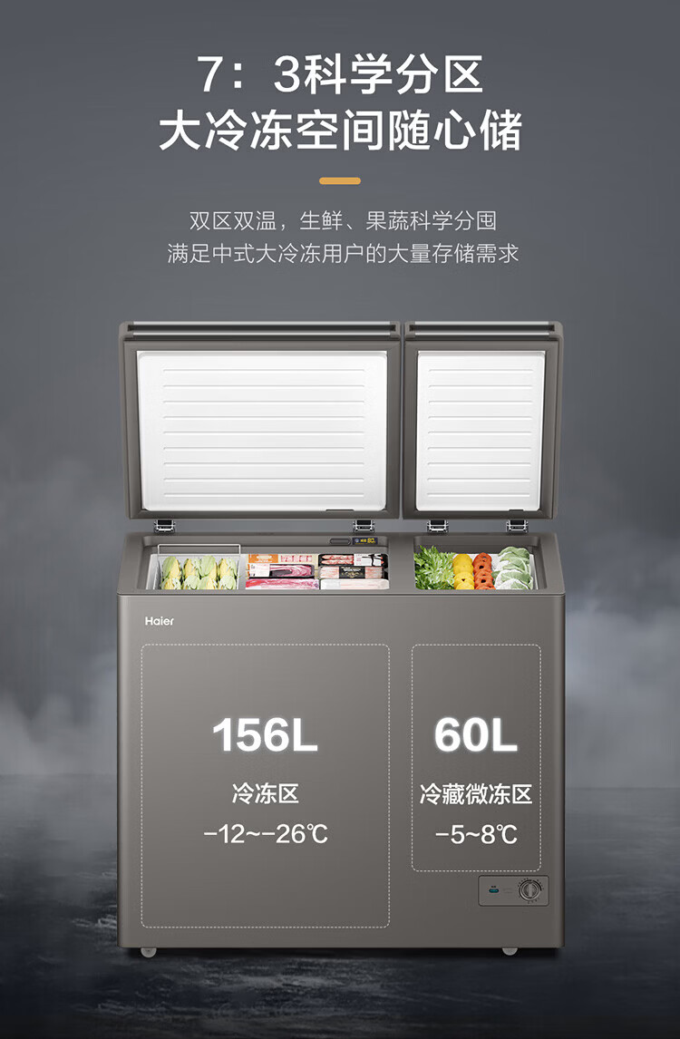 海尔(Haier)双温冰柜家用冰柜商用大容量冷藏冷冻两用冷冻柜一级能效节能卧式双箱冷柜以旧换新 钛金灰|冷冻156升|冷藏60升|一级能效 216L