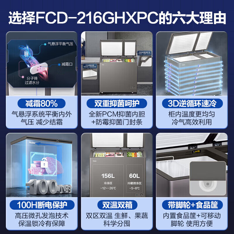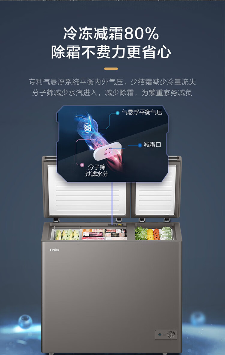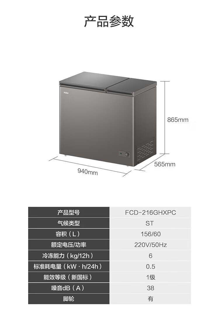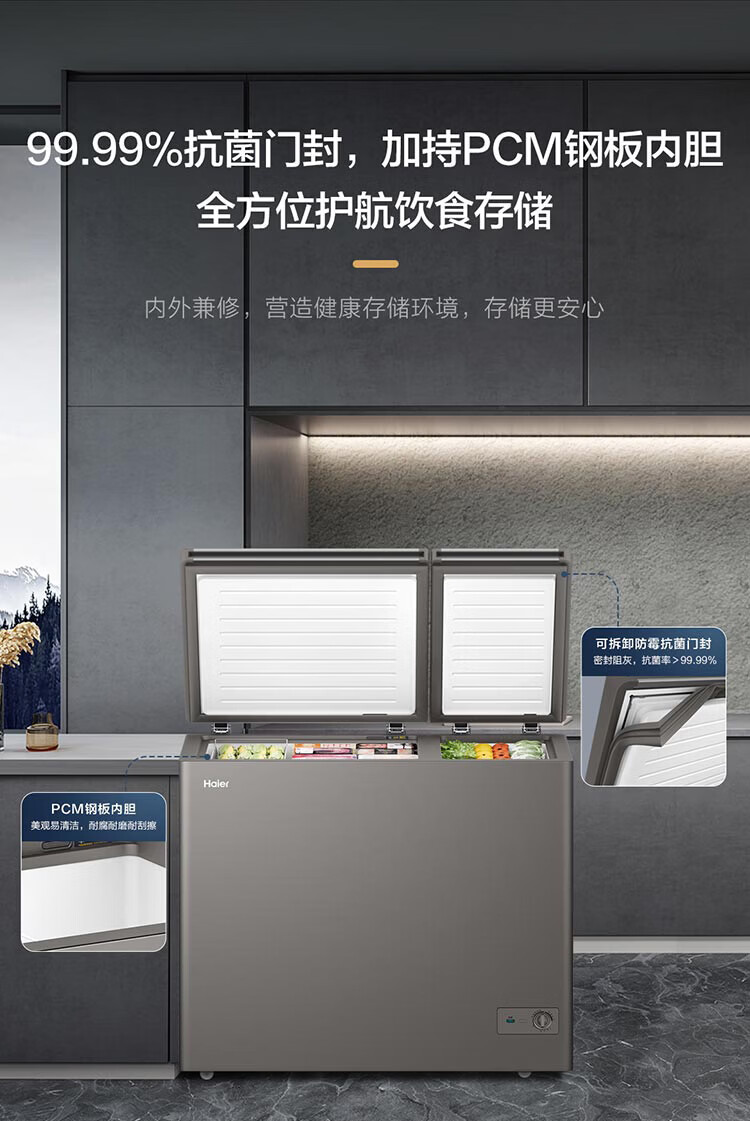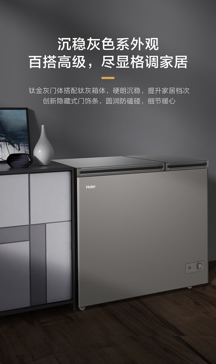 海尔(Haier)双温冰柜家用冰柜商用大容量冷藏冷冻两用冷冻柜一级能效节能卧式双箱冷柜以旧换新 钛金灰|冷冻156升|冷藏60升|一级能效 216L