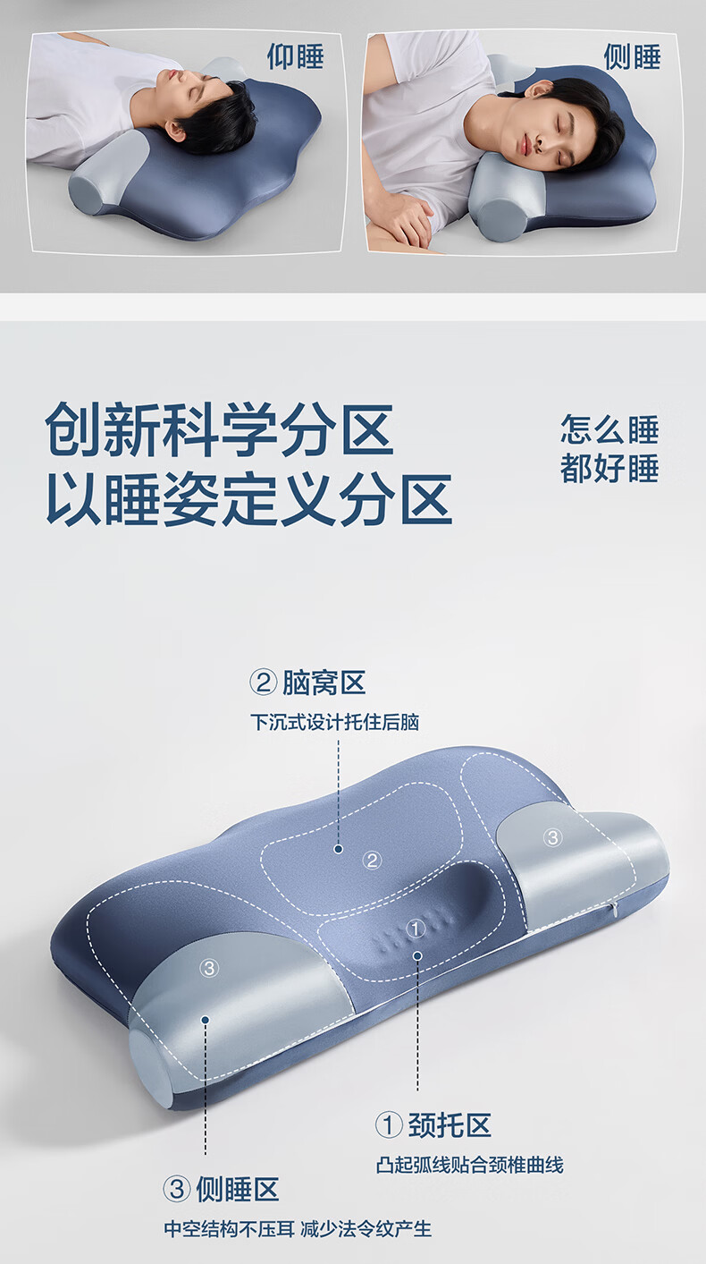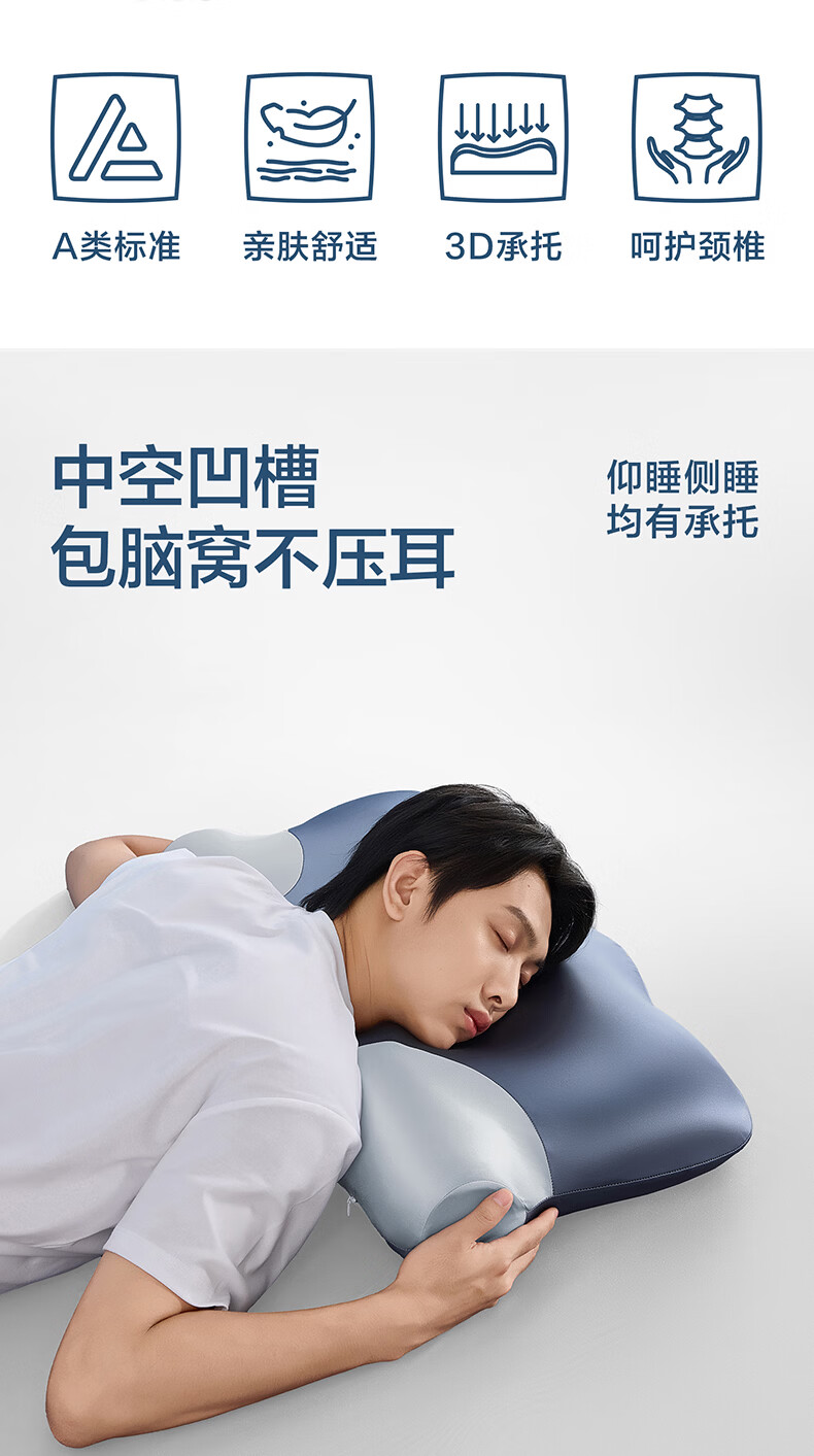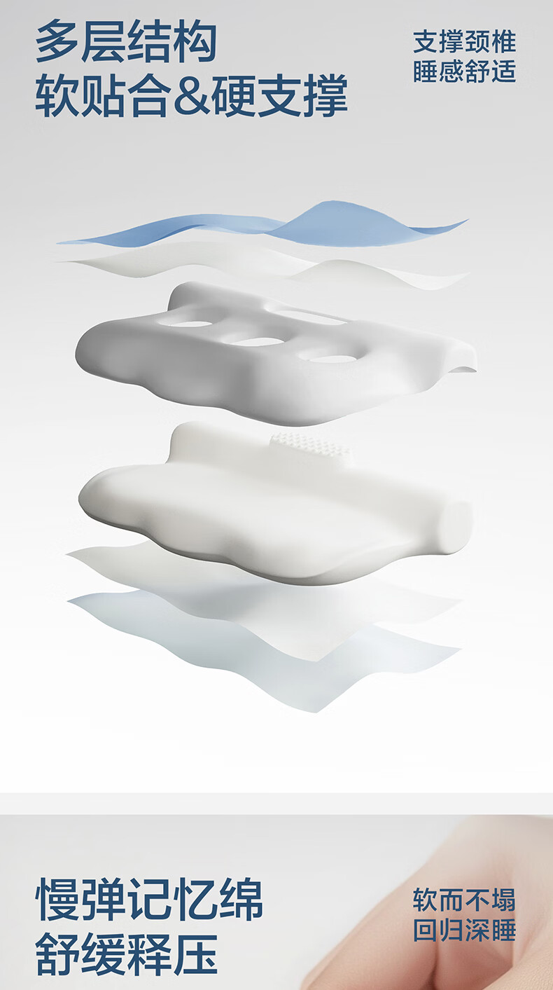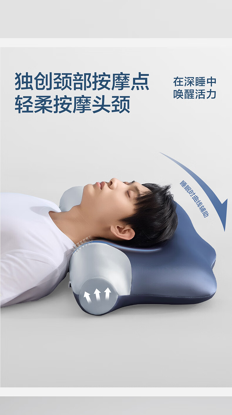 海澜之家(HLA)枕头记忆枕护颈枕颈椎病深度睡眠男士专用反牵引枕成人单一只枕芯 灰屿蓝 【颈部按摩点 轻柔按摩头颈】 66*42【高度约12/10cm】