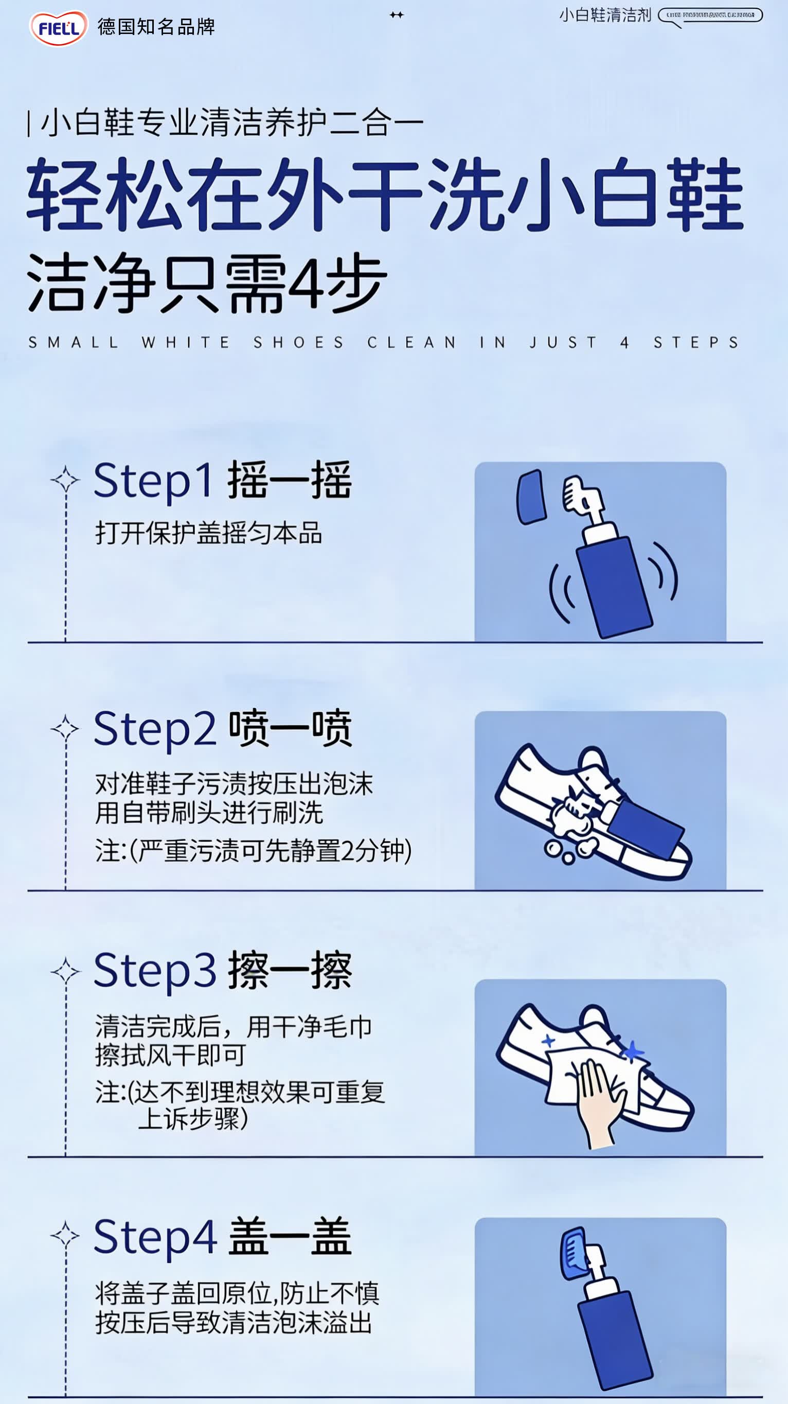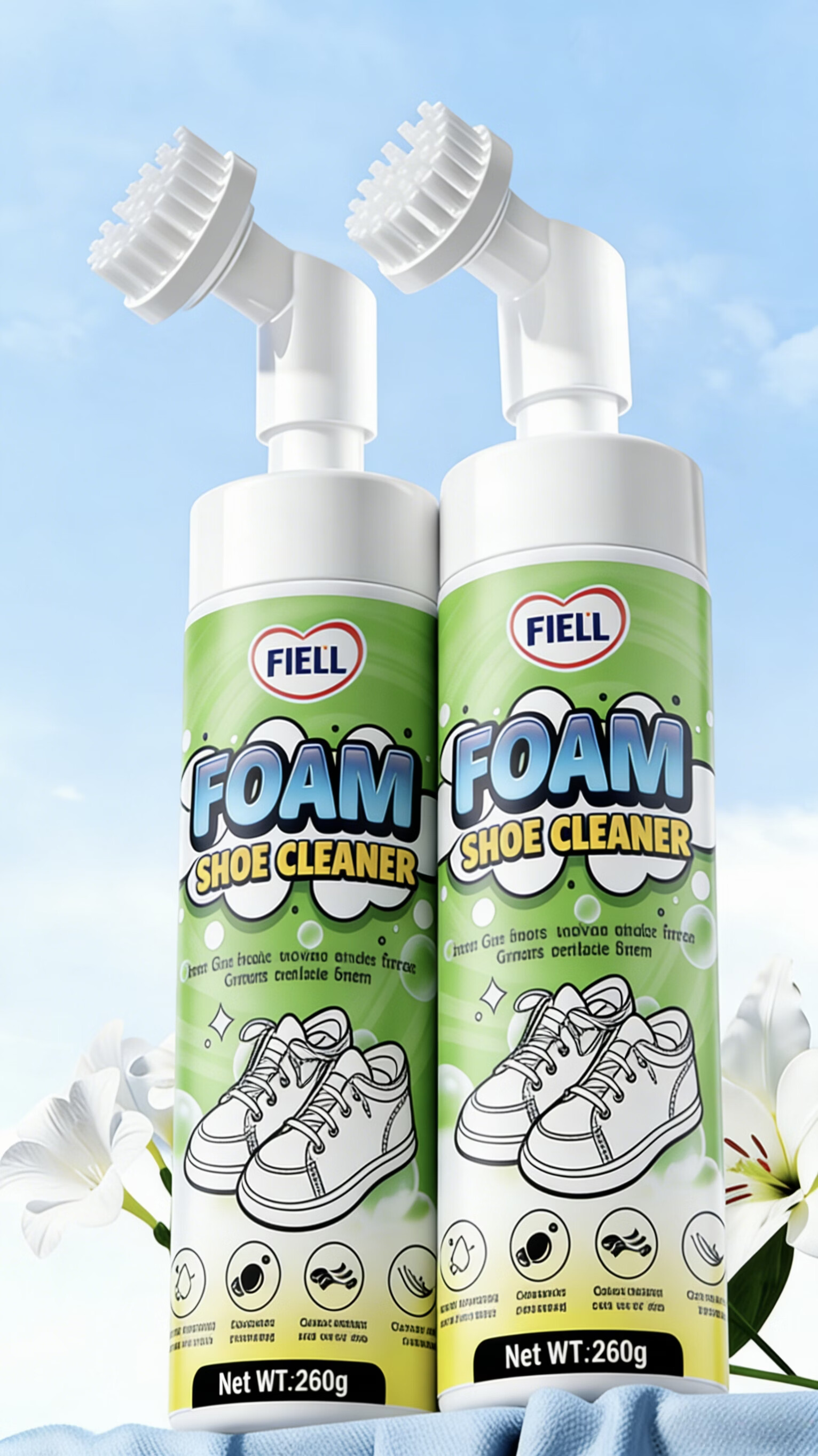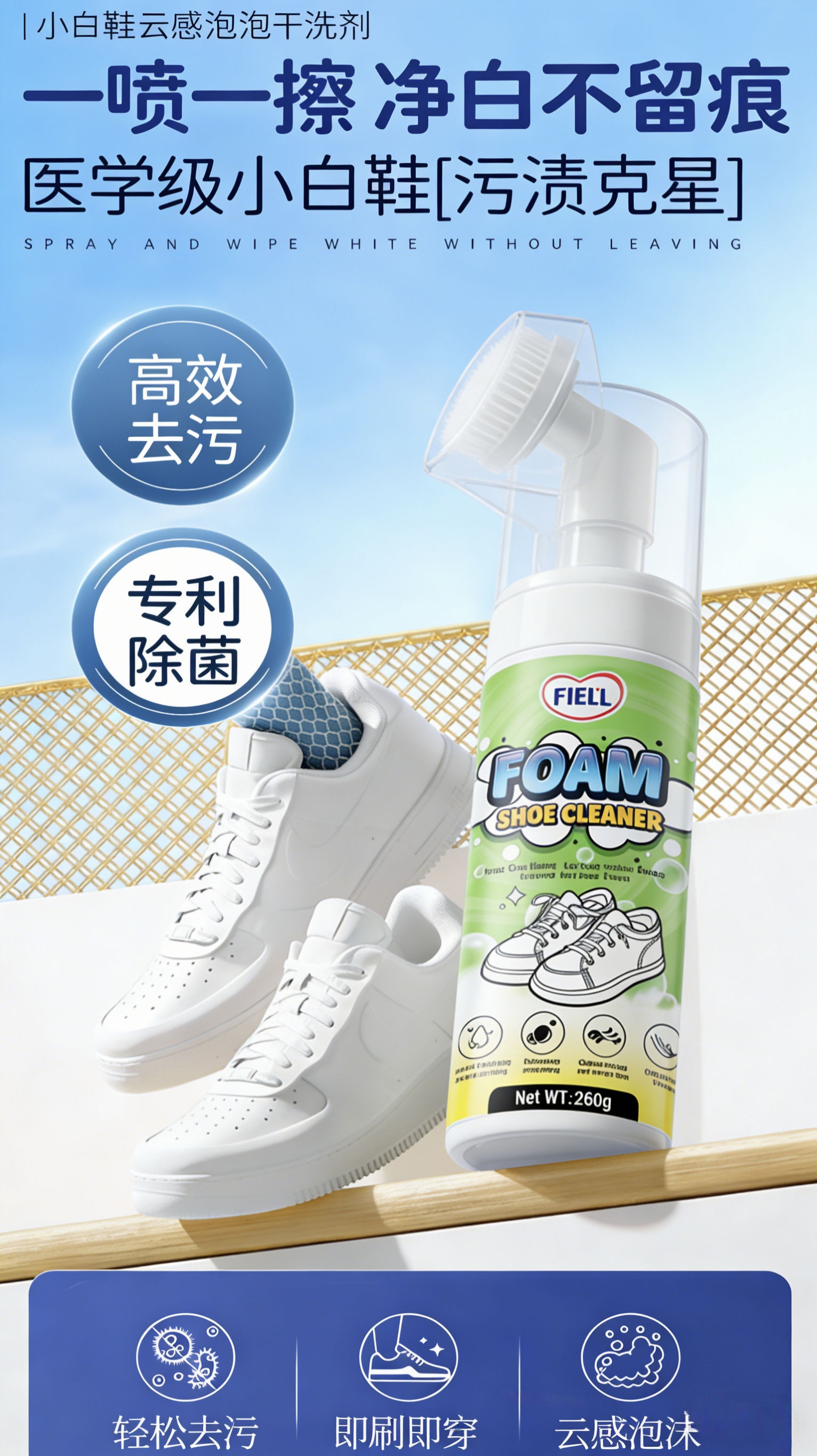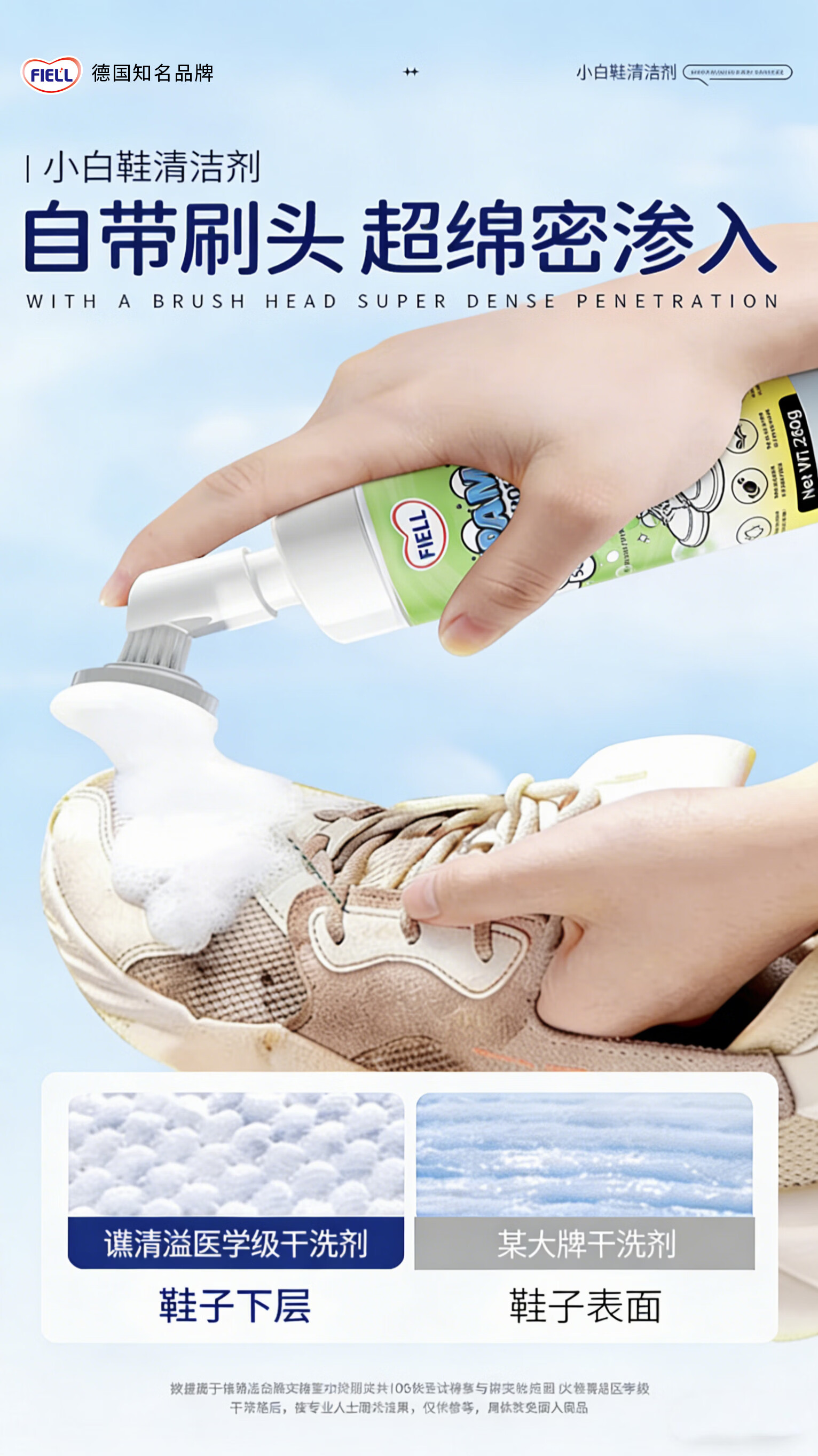 FIELL【德国】小白鞋专用清洁剂慕斯泡沫型免水洗去污增白去黄去污去渍 260g 1瓶【洗鞋神器 强力去污】 【运动鞋,网鞋】去黄去污增白专用清洗剂