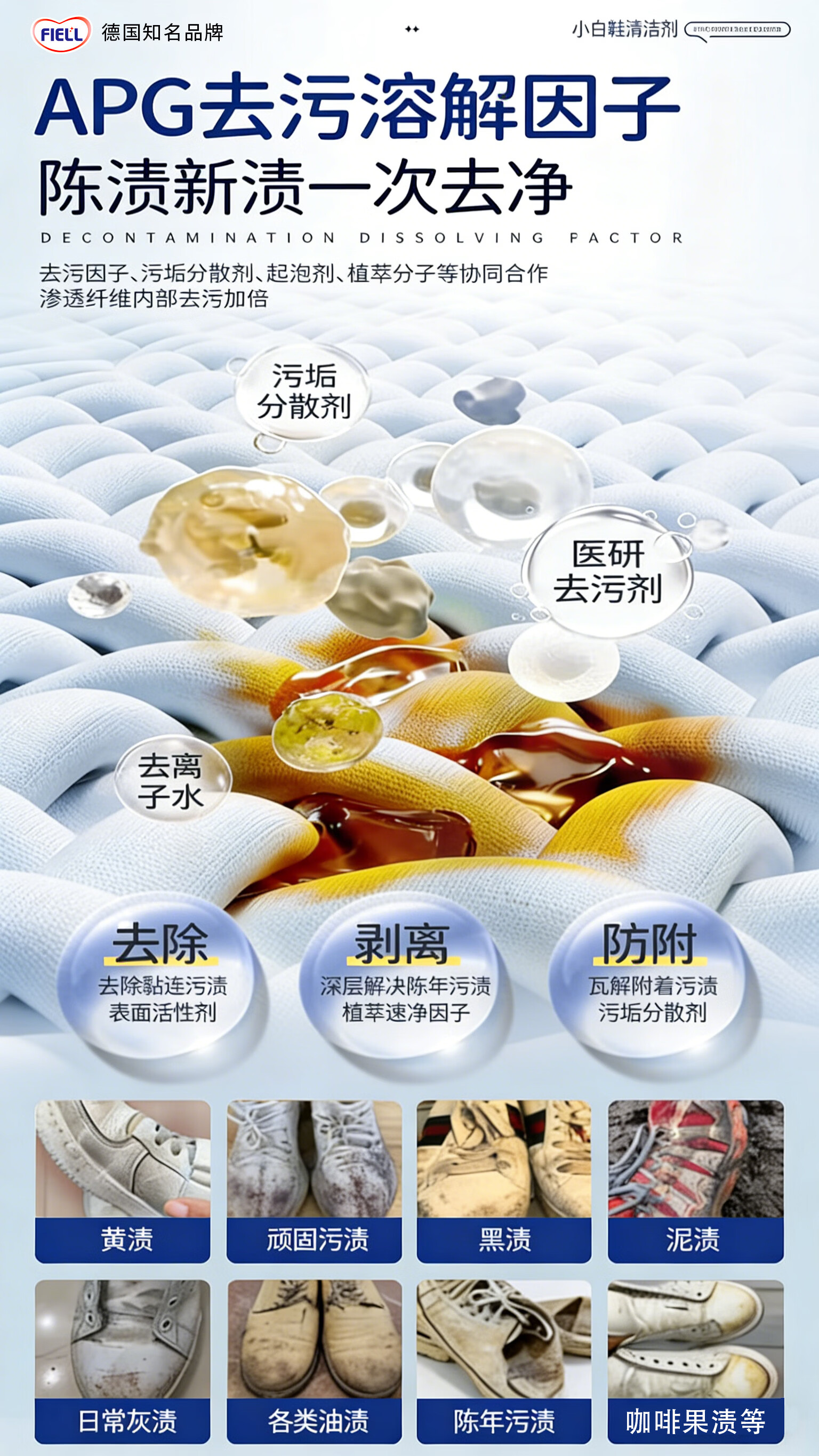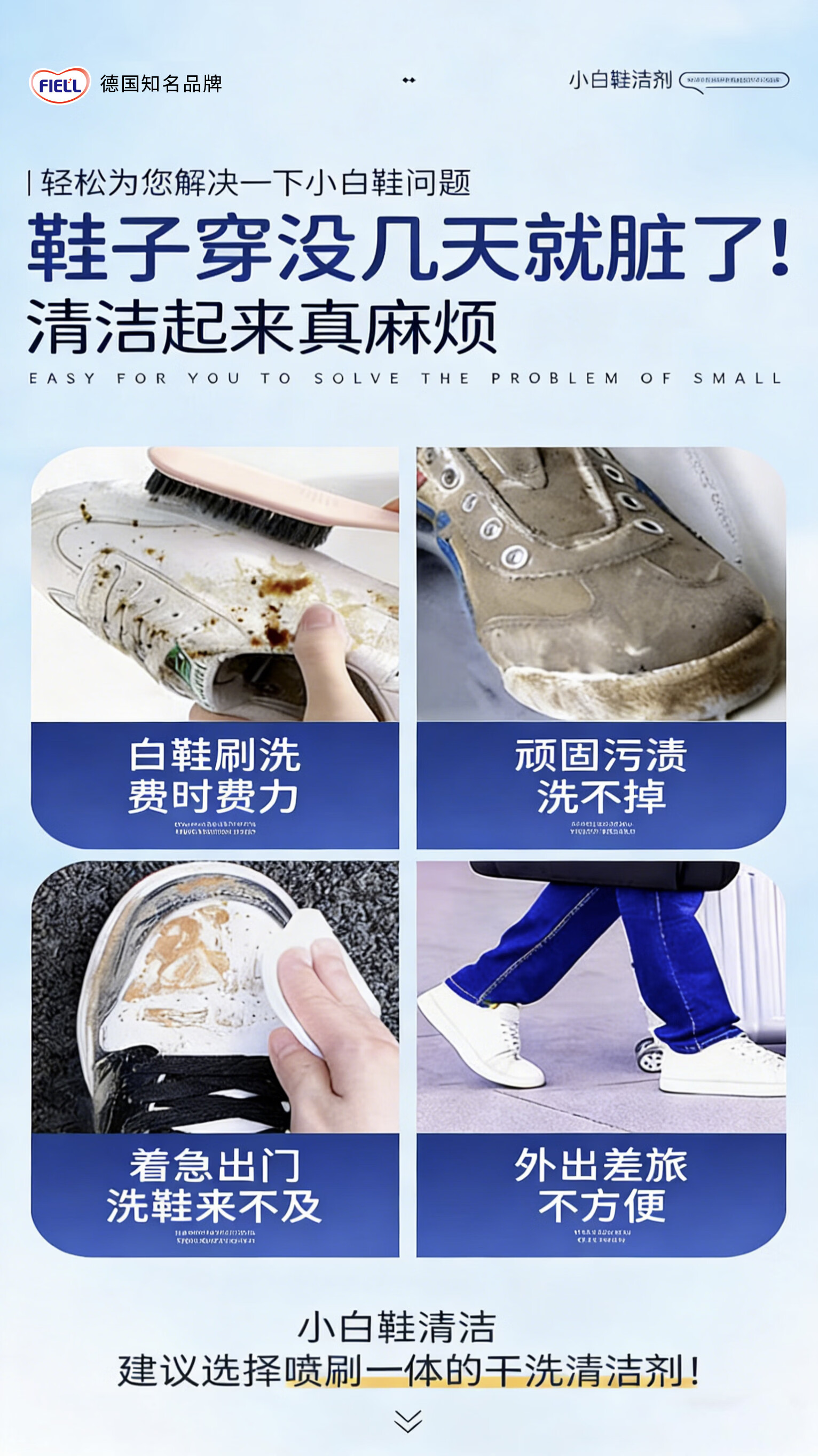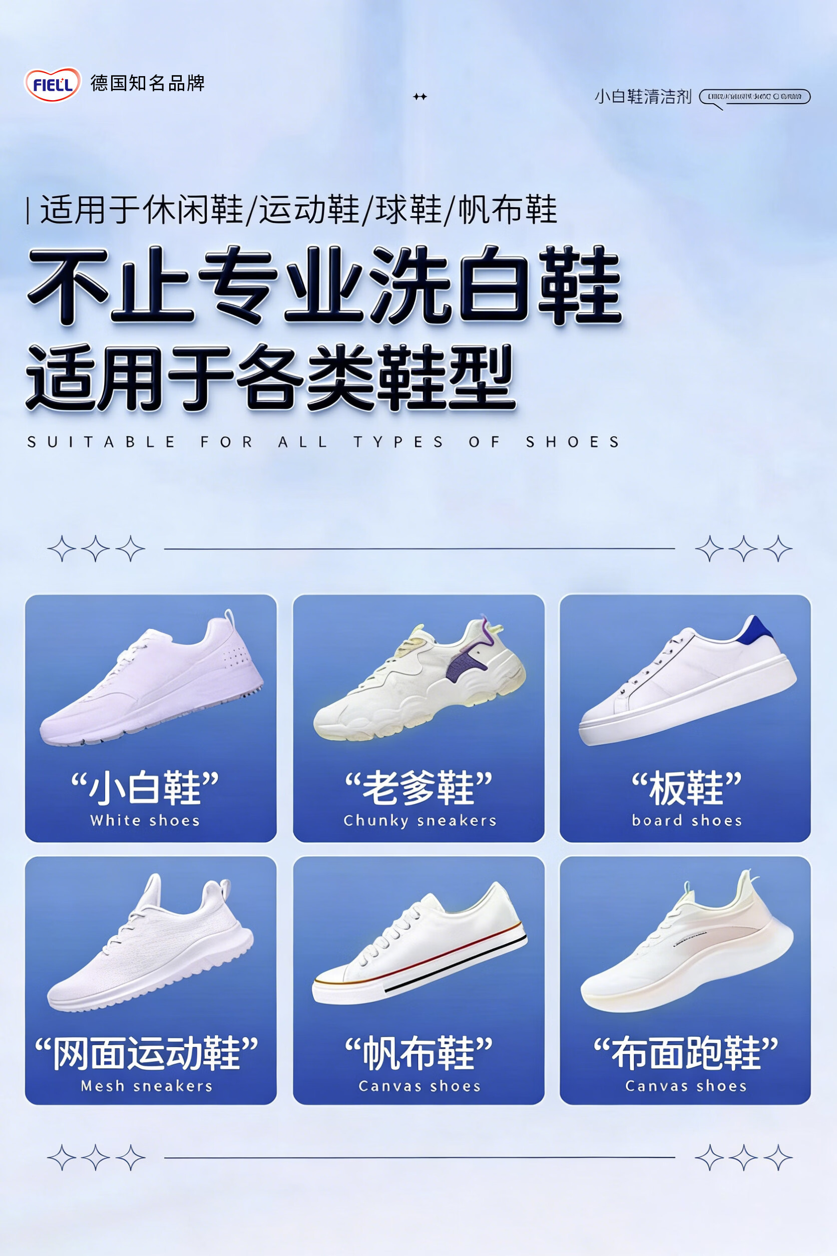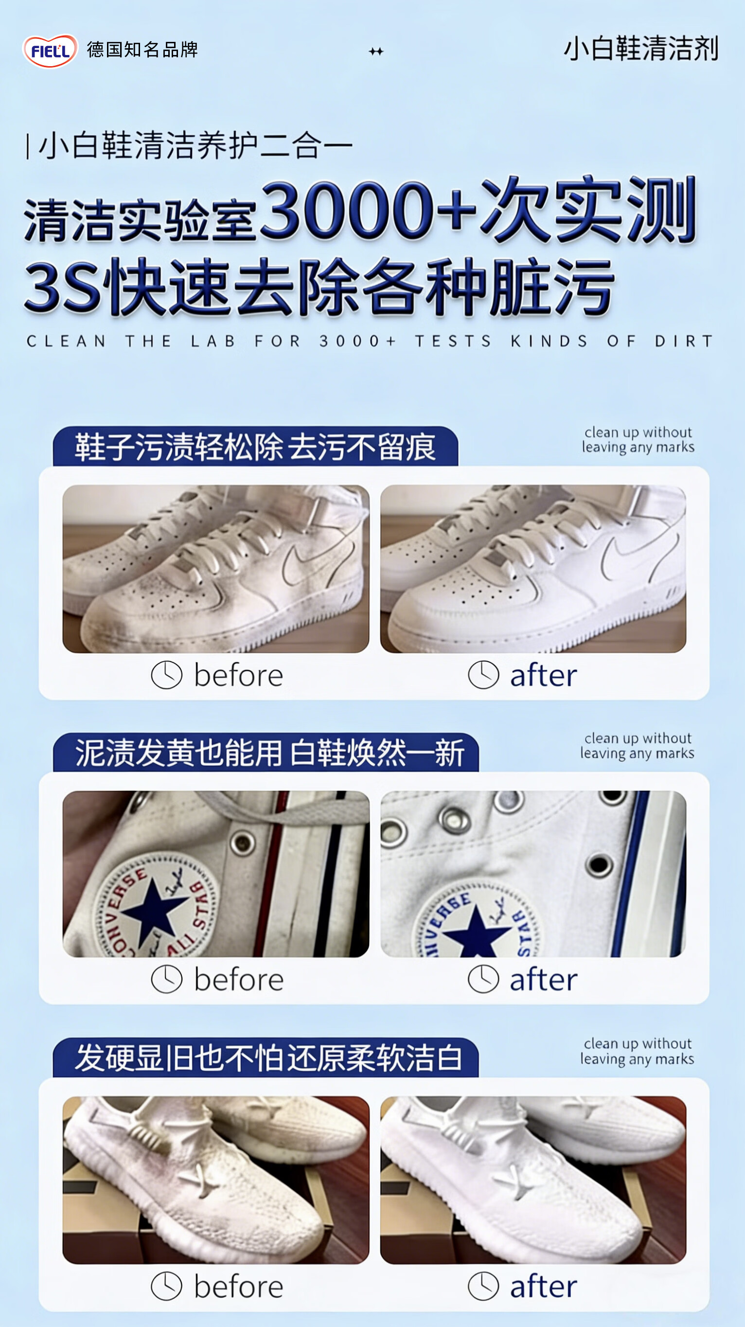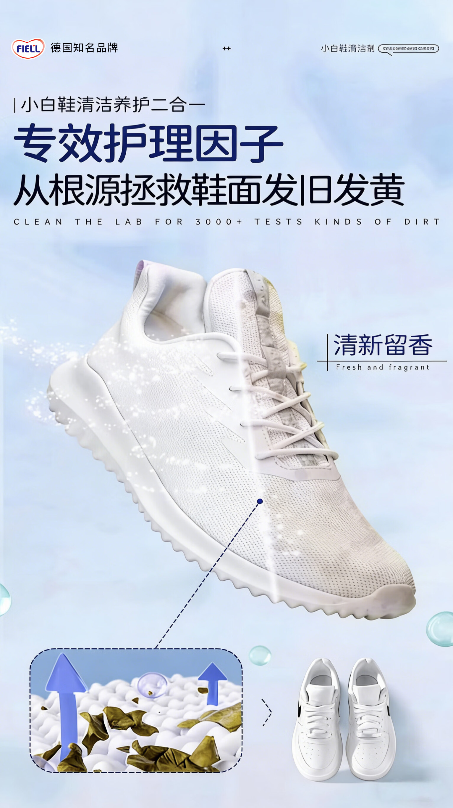 FIELL【德国】小白鞋专用清洁剂慕斯泡沫型免水洗去污增白去黄去污去渍 260g 1瓶【洗鞋神器 强力去污】 【运动鞋,网鞋】去黄去污增白专用清洗剂