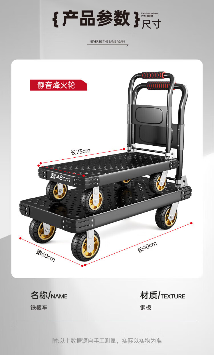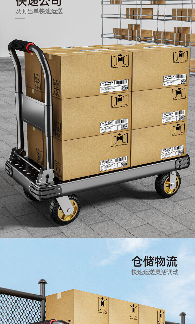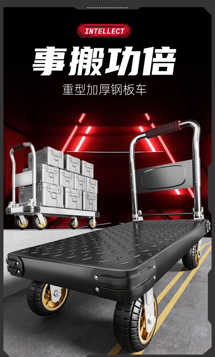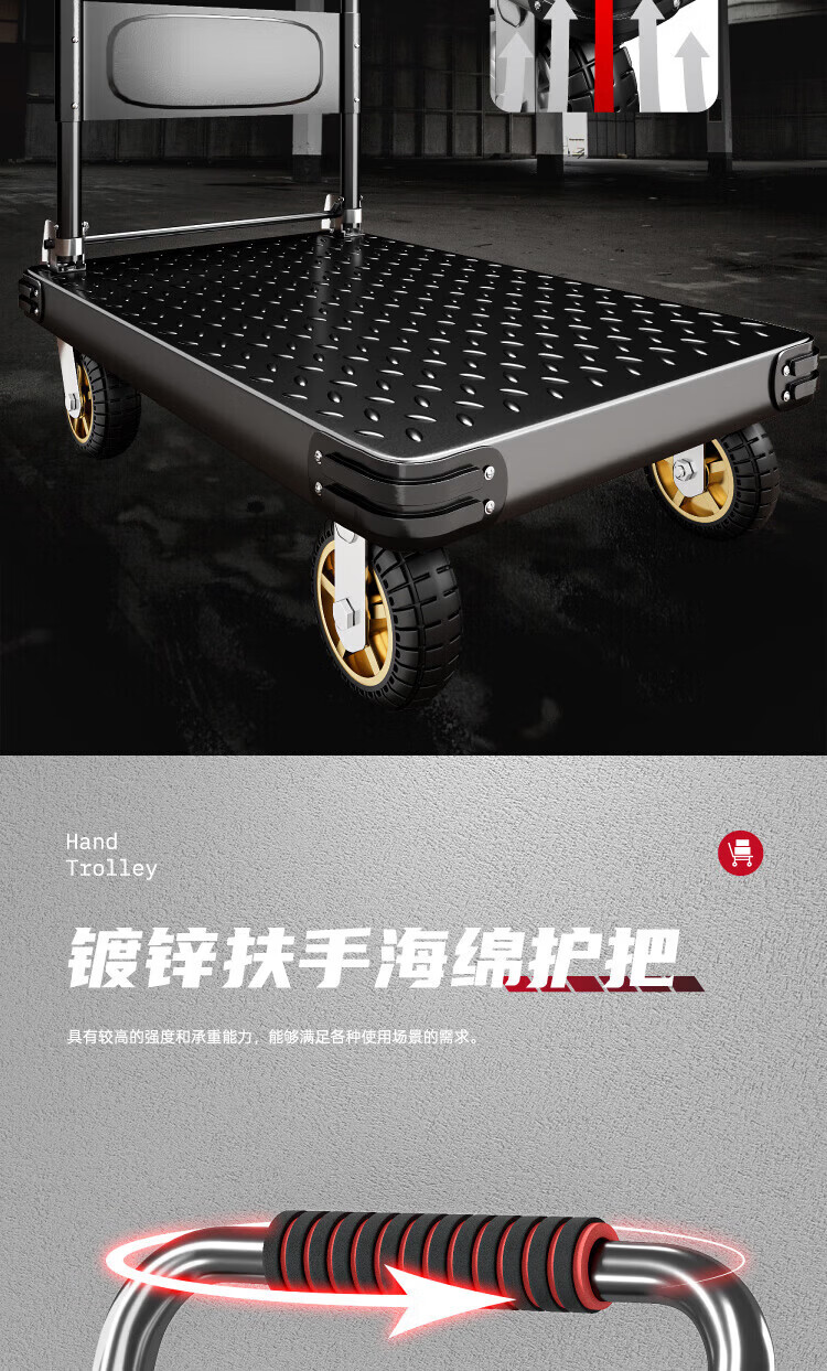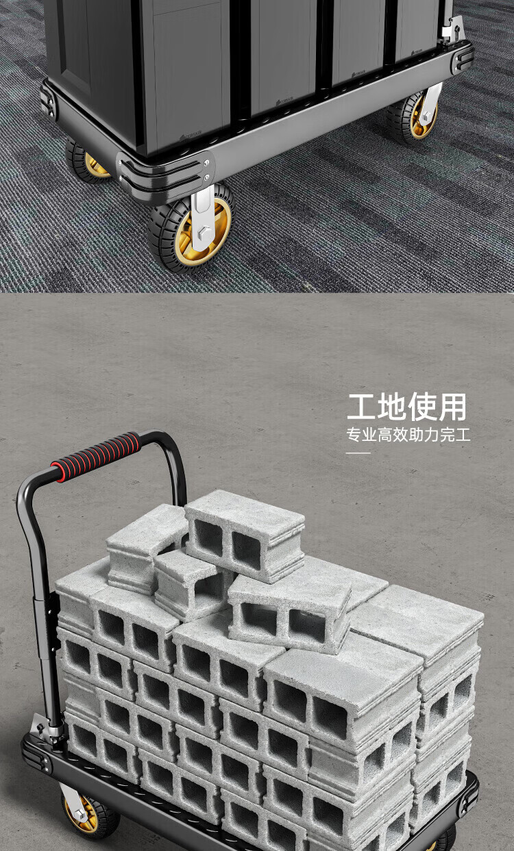 亚伦大力士小手推车平板车拉货家用搬运车折叠拖车仓库商用拉车快递搬运工具 加厚黑板【90*60】5寸烽火轮+承重1750斤