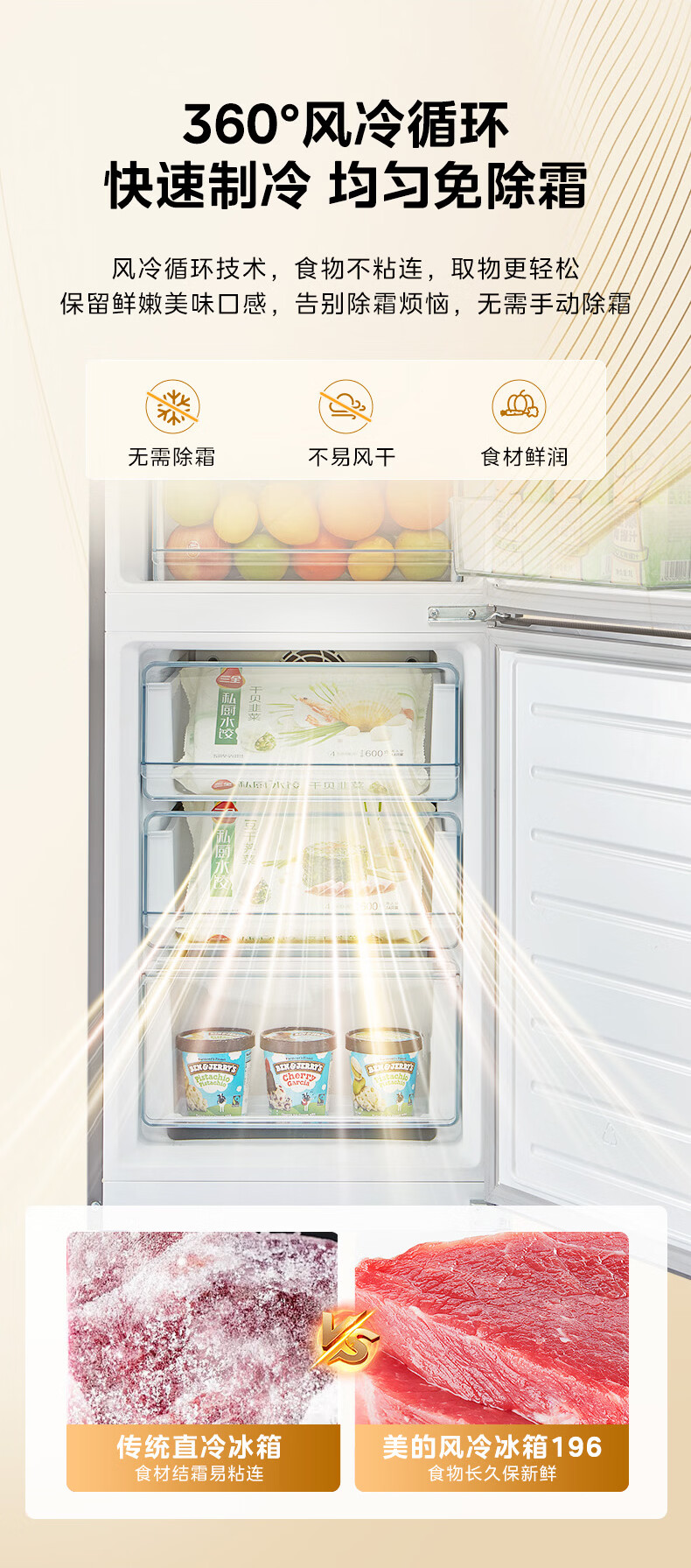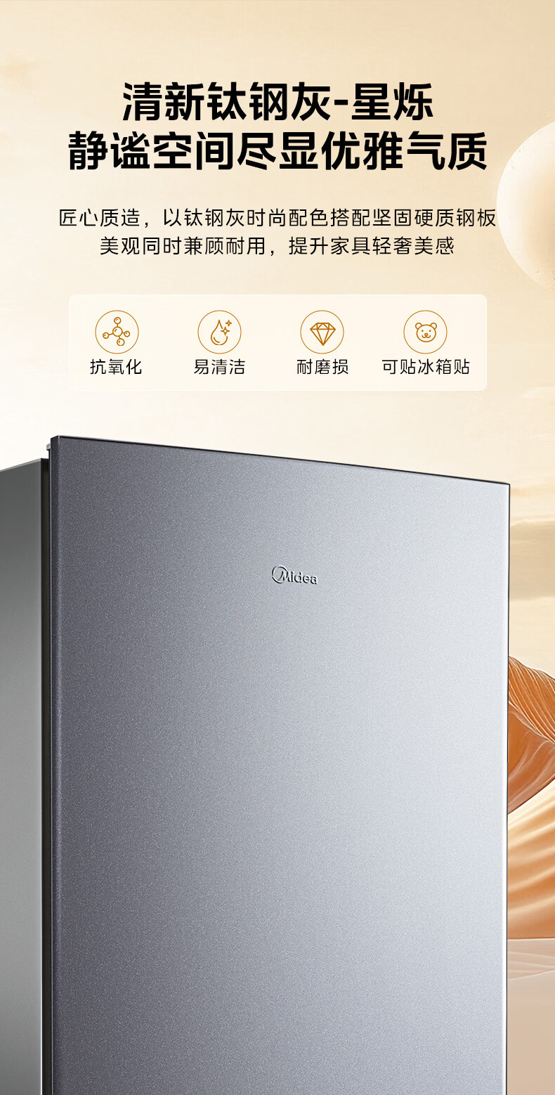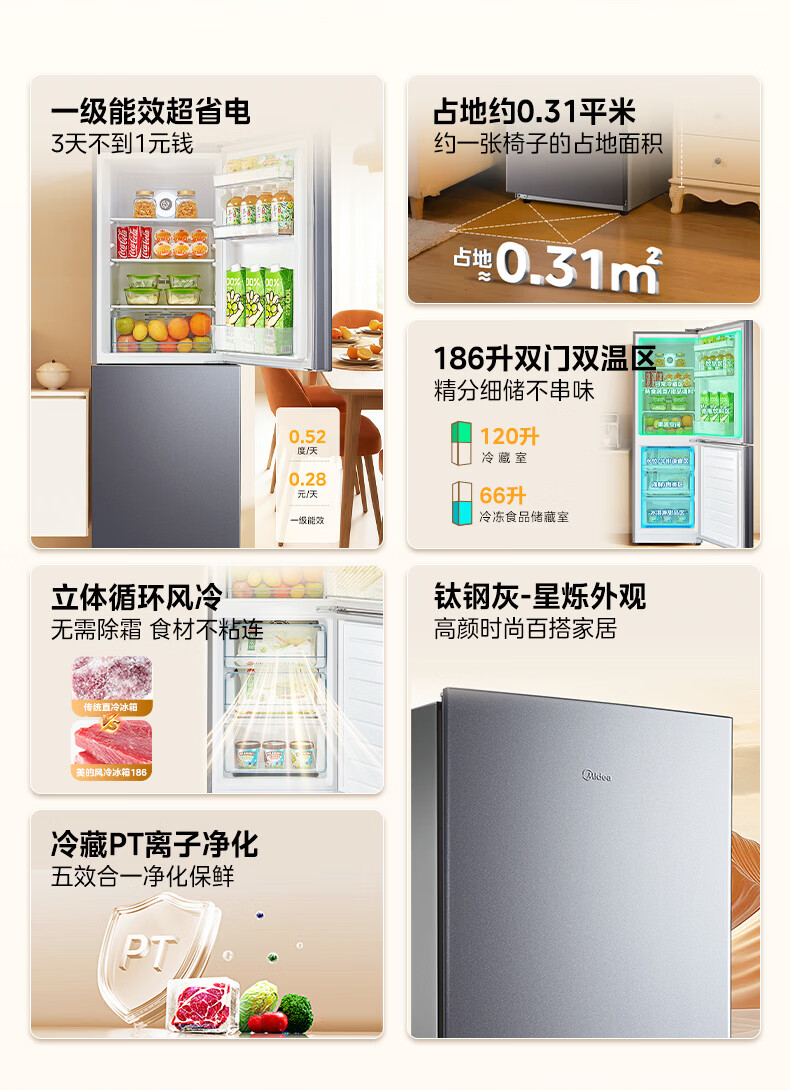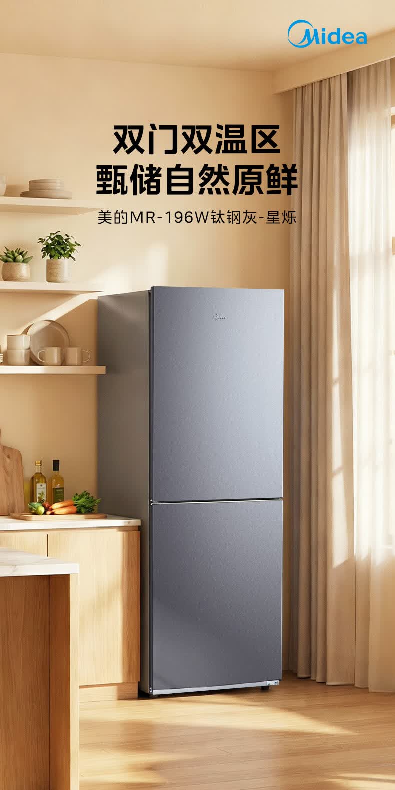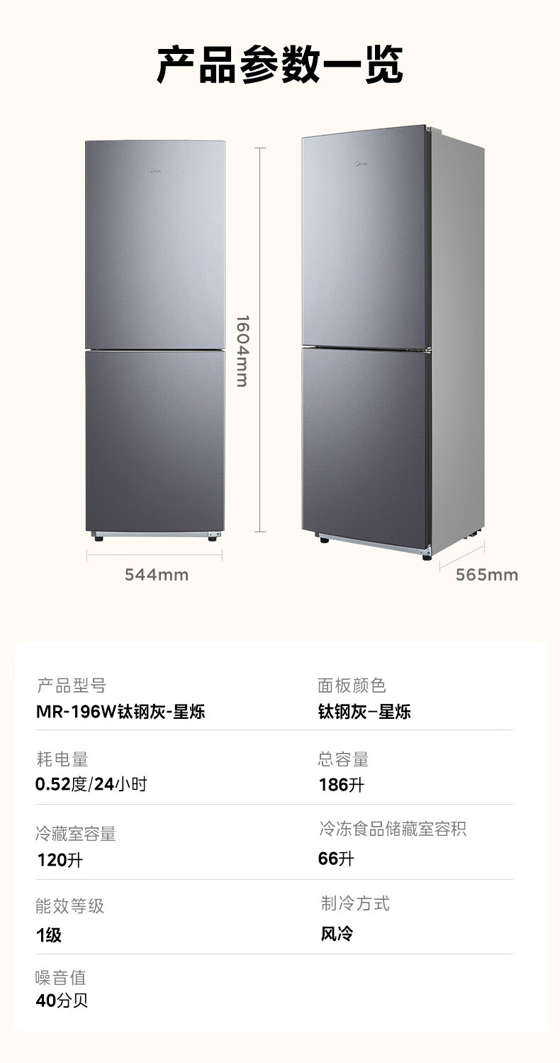 美的(Midea)「一级能效风冷无霜」186升两门冰箱小户型家用省电双门双系统不串味 钛钢灰MR-196W国家补贴