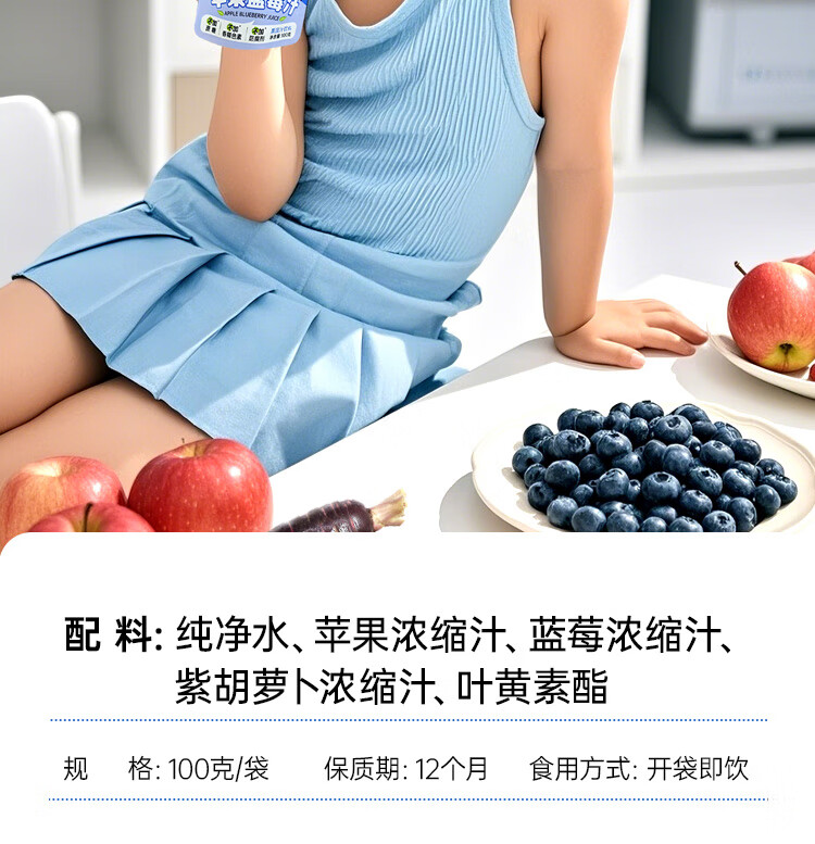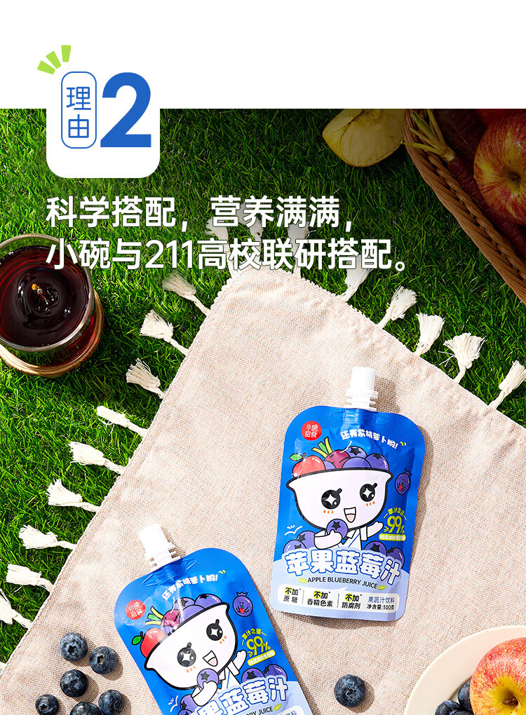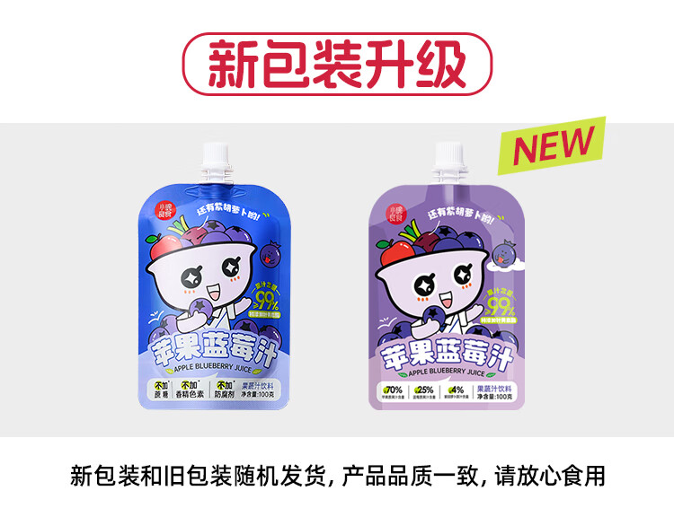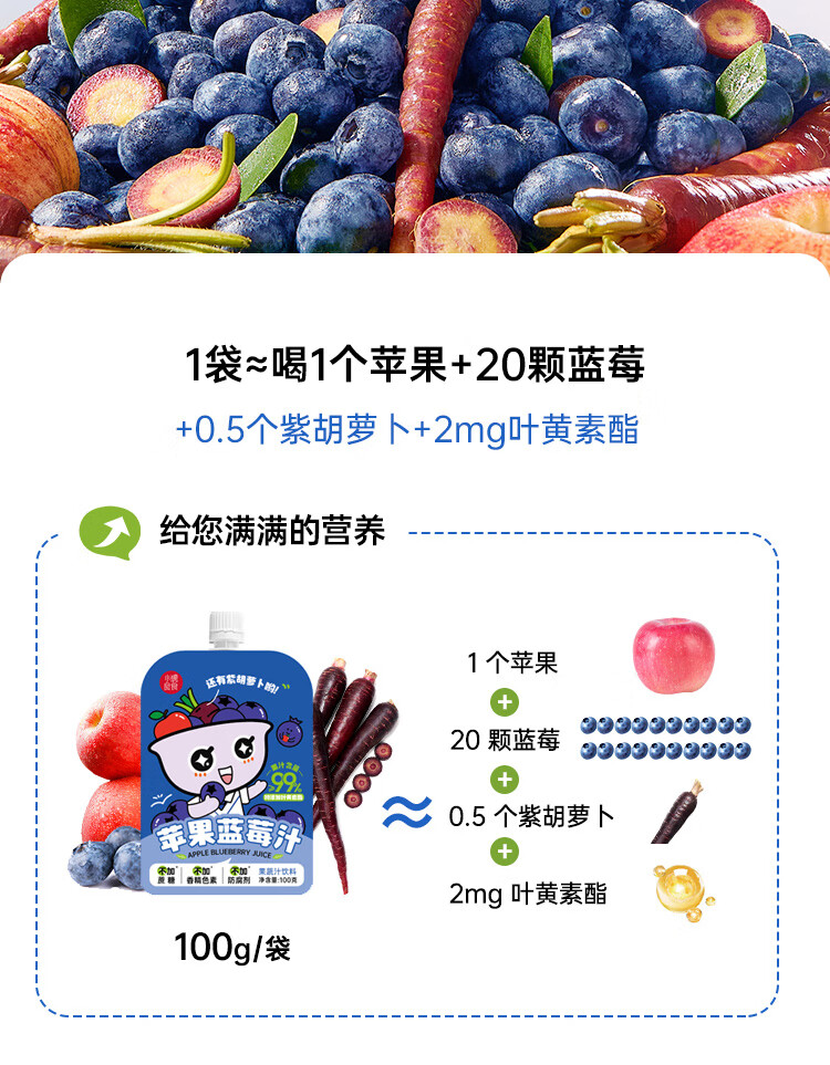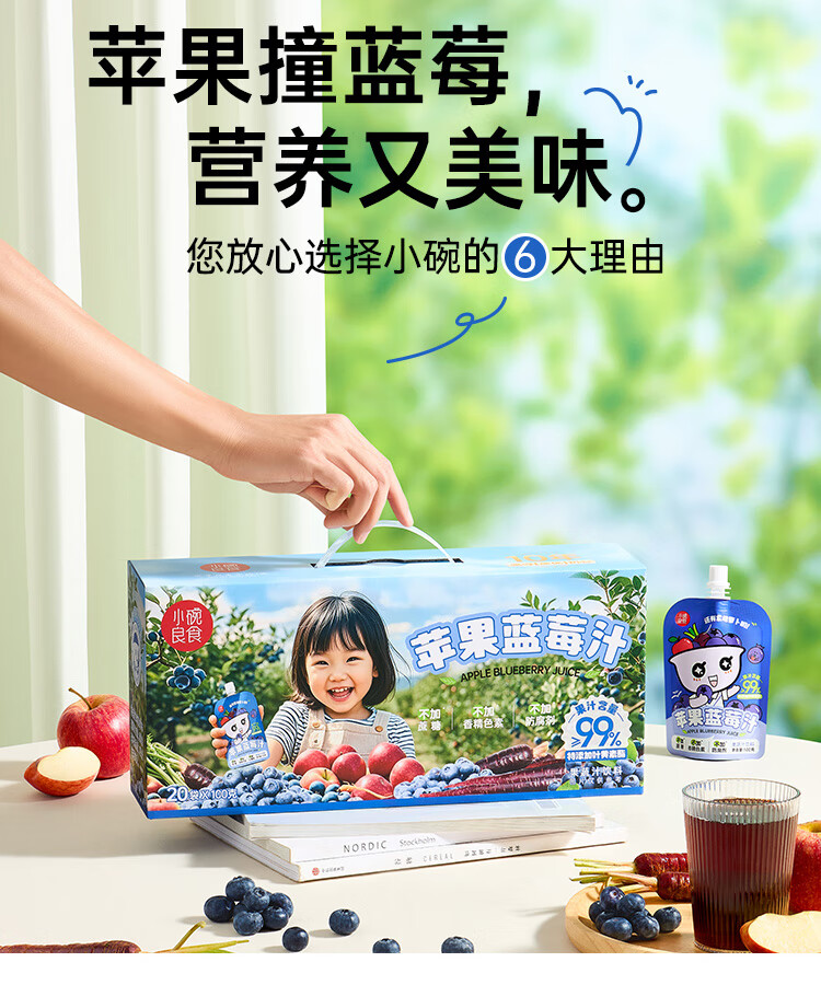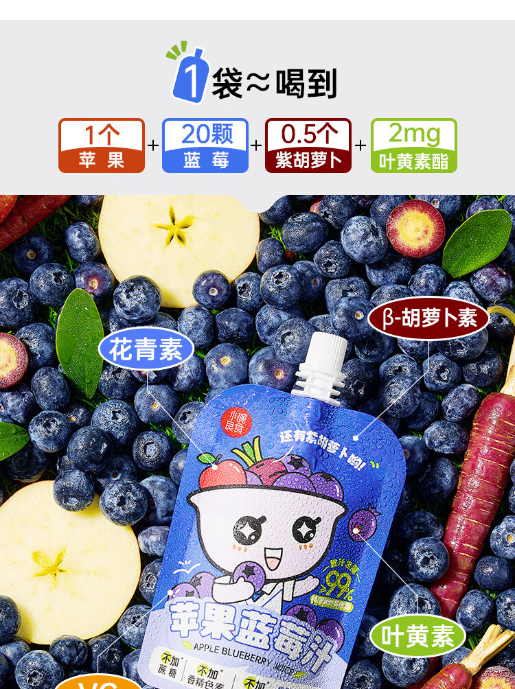 小碗良食果蔬汁饮料苹果蓝莓汁儿童无添加水果汁花青素叶黄素酯袋装整箱 100g*20袋(礼盒装)