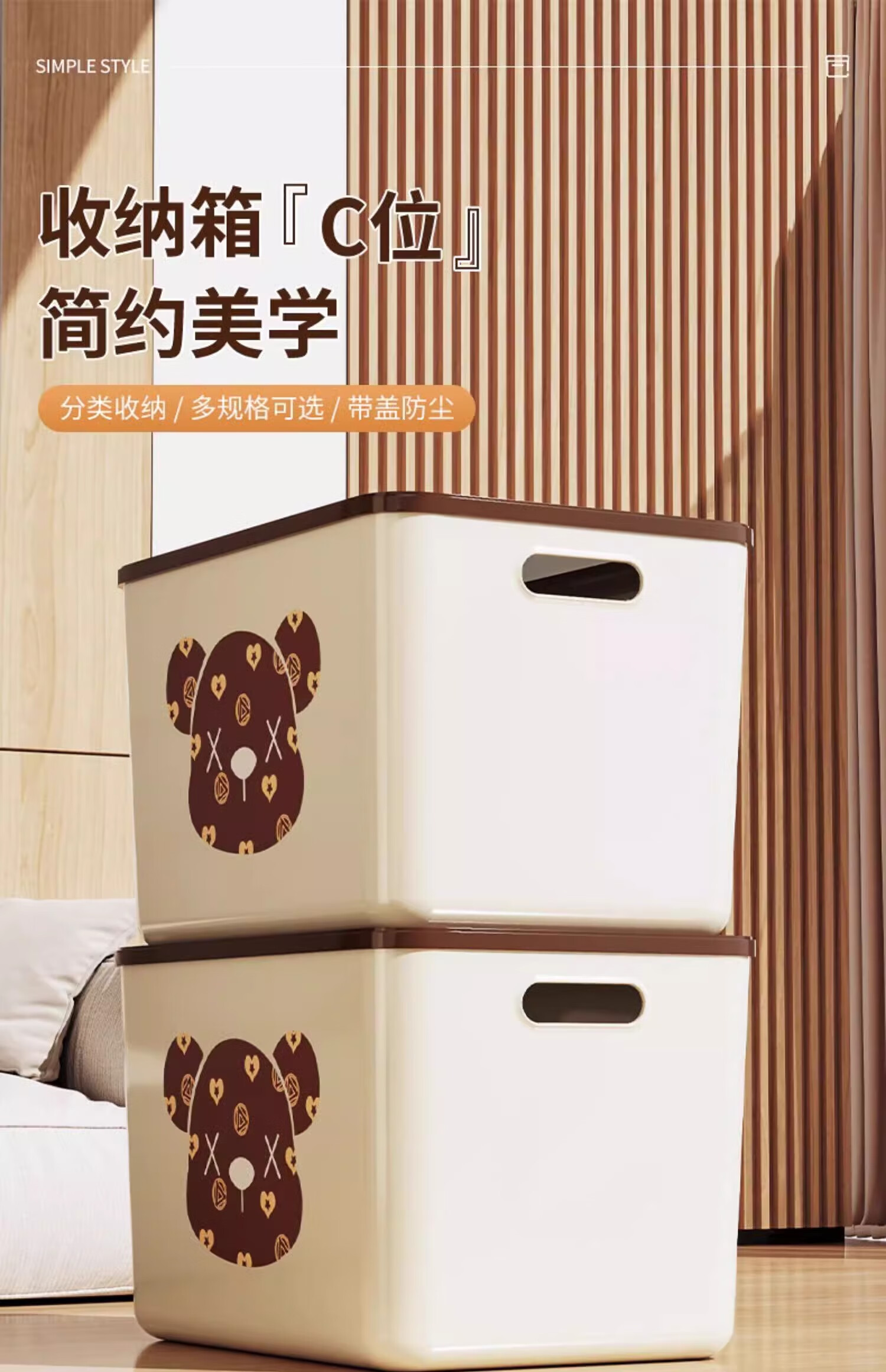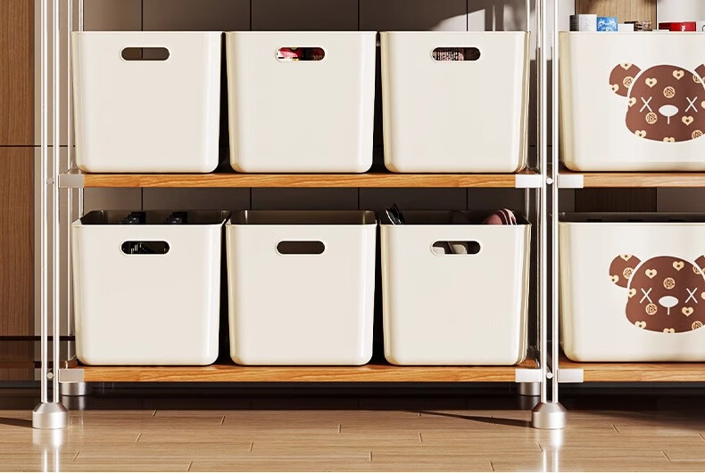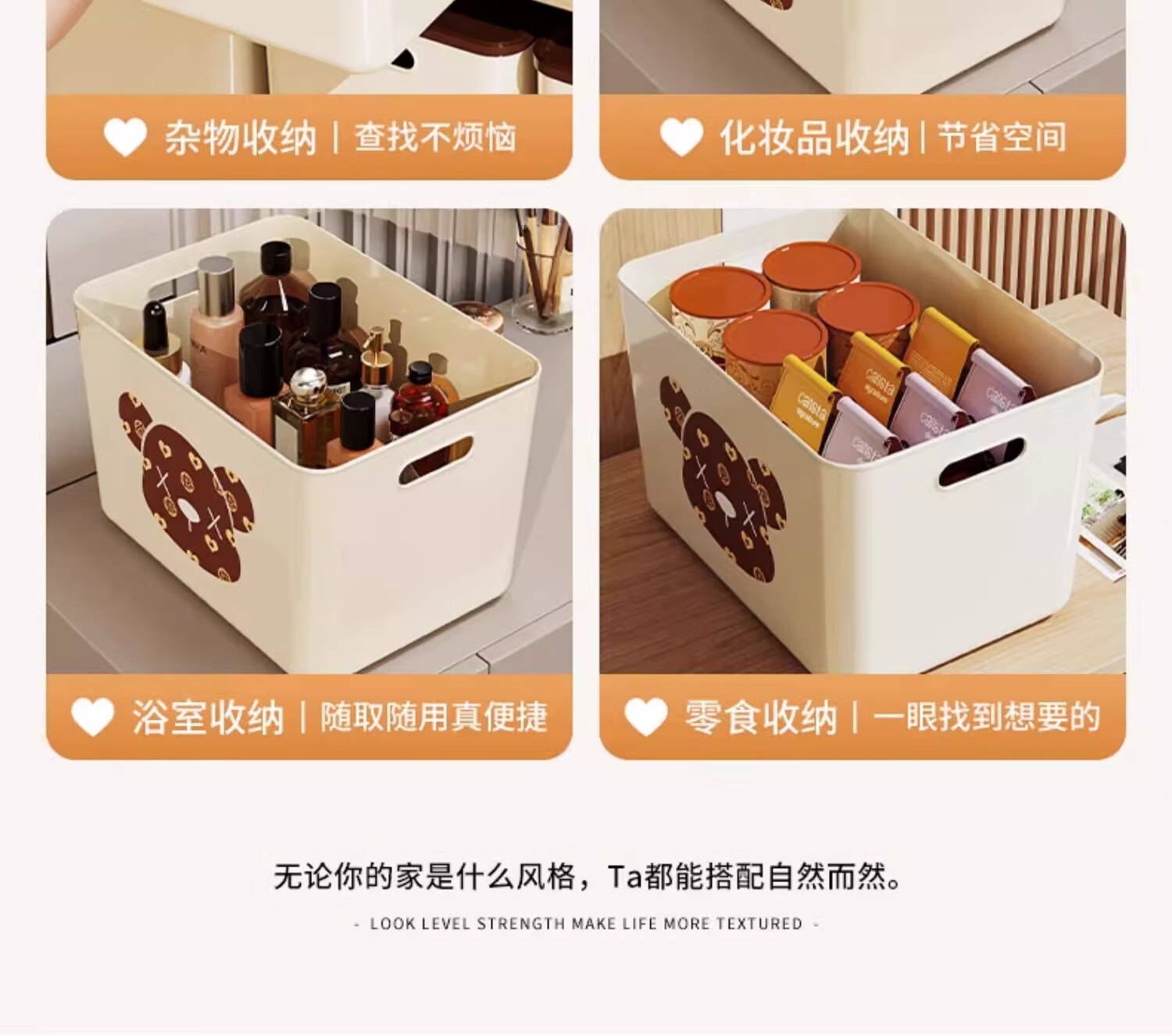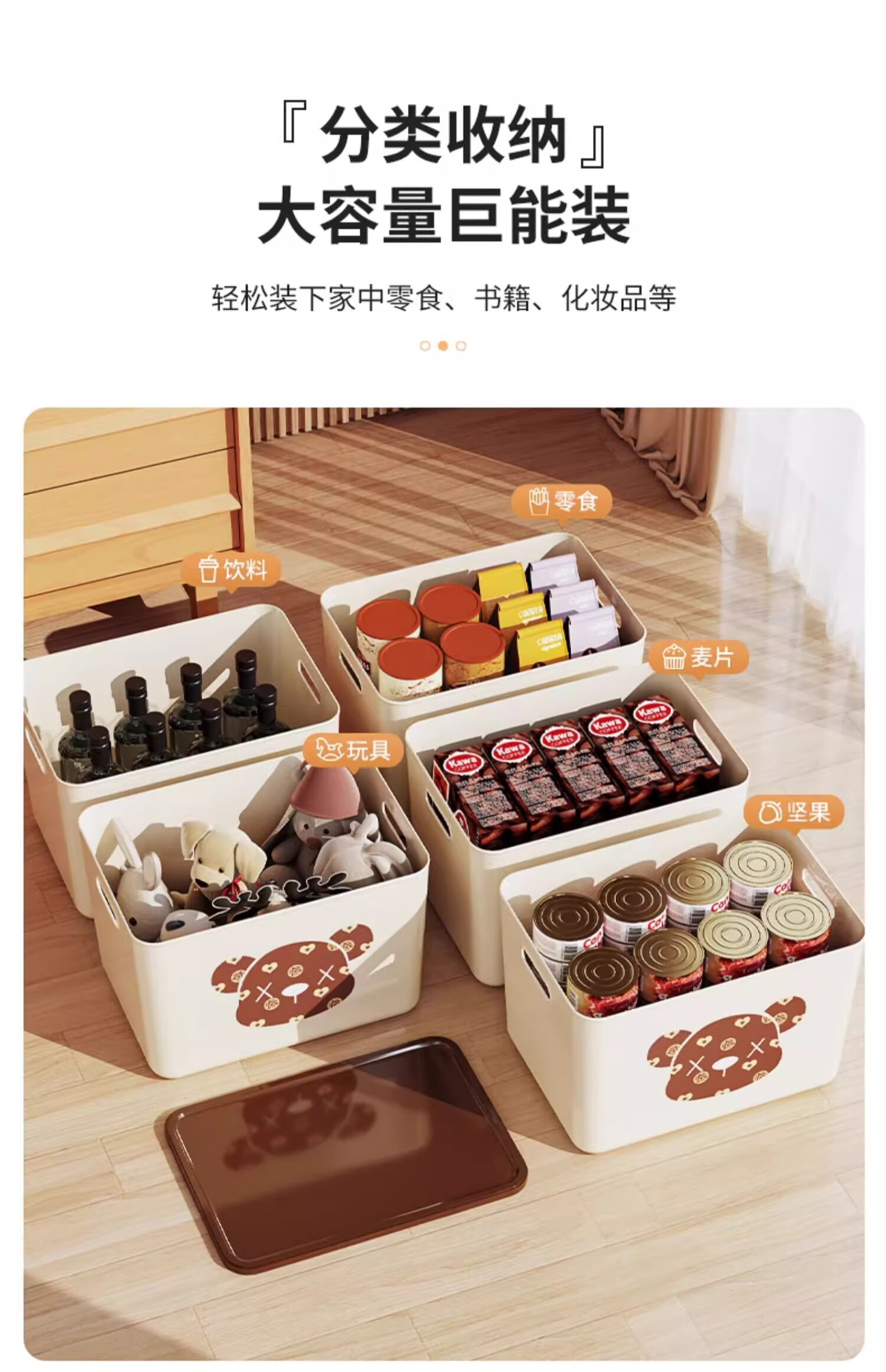 稻草熊桌面收纳盒长方形带盖整理盒杂物文具防尘储物盒零食工位整理神器 咖啡色带盖【三个装赠卡通贴纸】