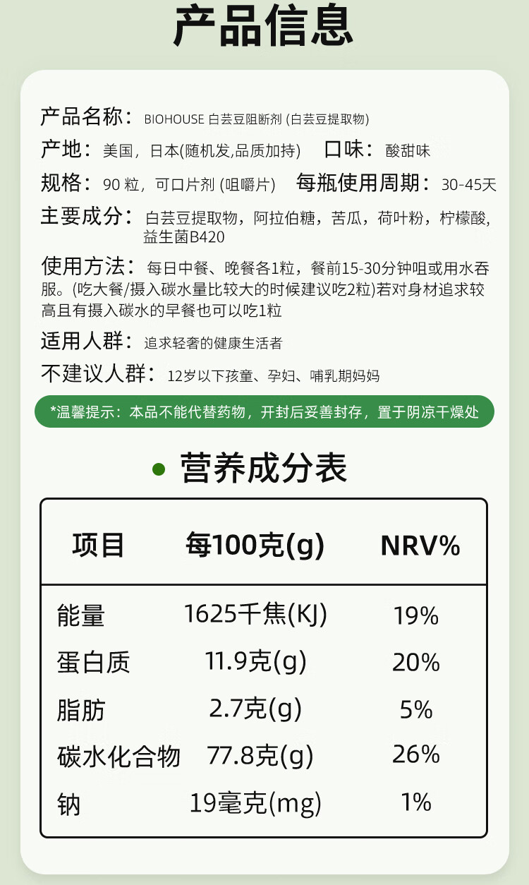 bioHouse バイオホウス日本原装进口白芸豆咀嚼片 餐前碳水化合物90粒/瓶