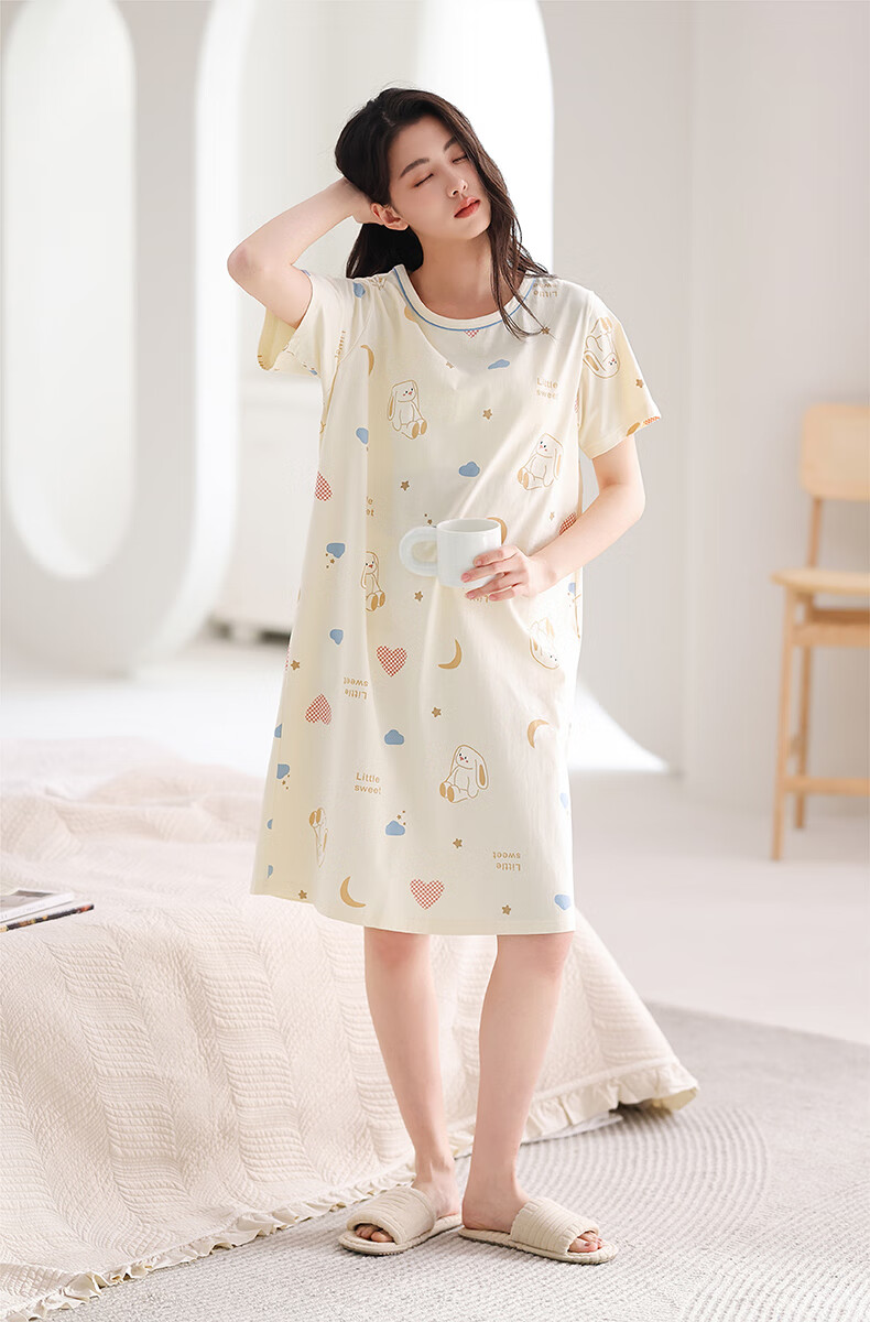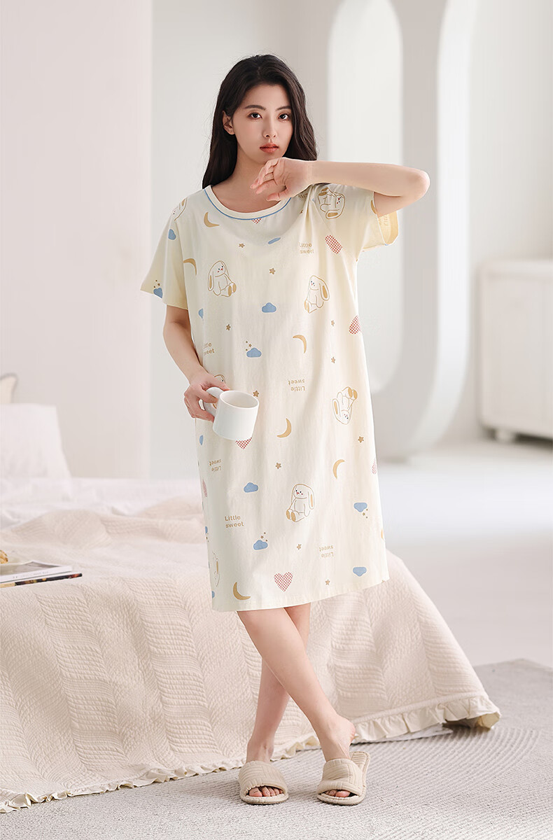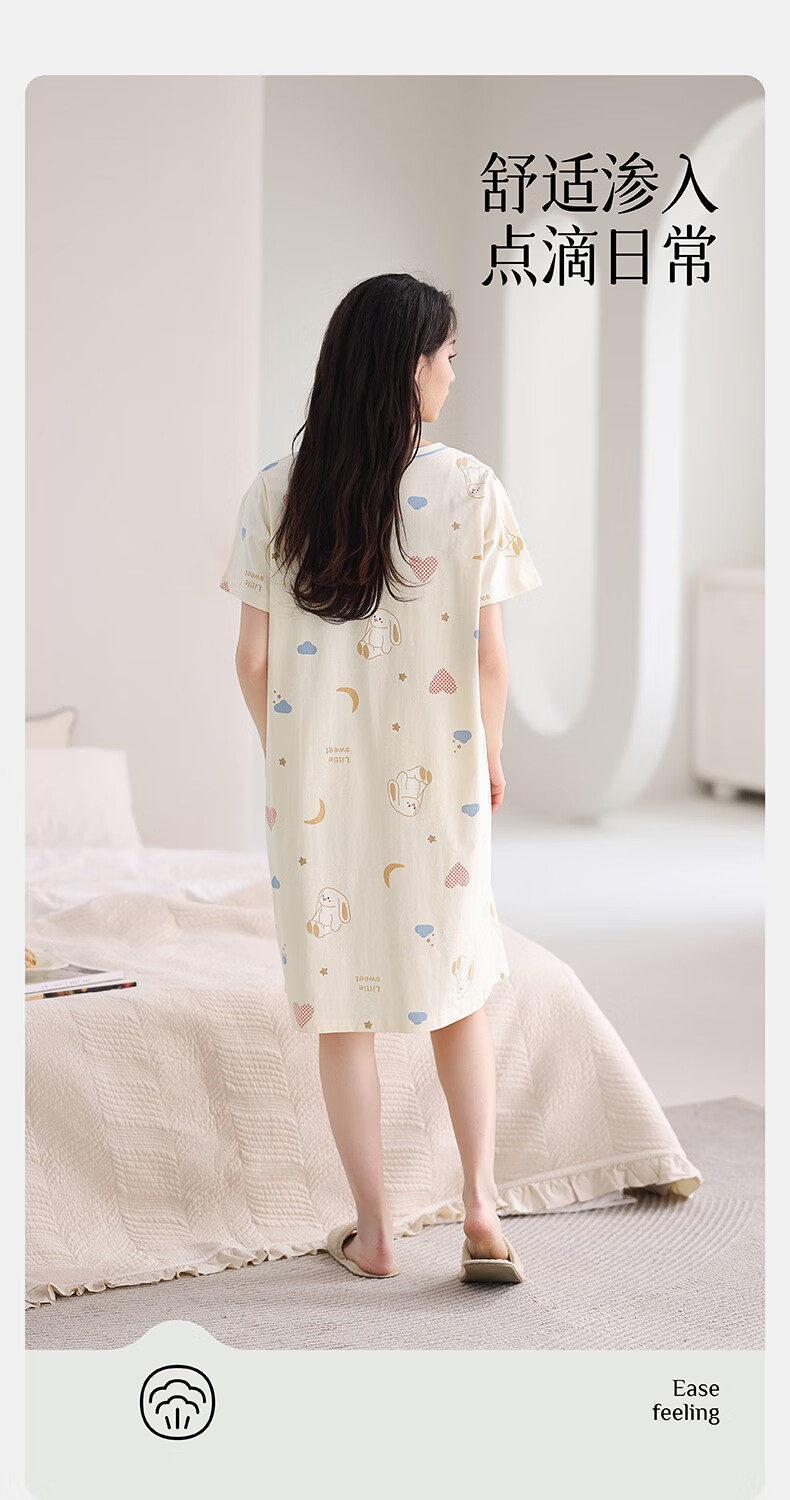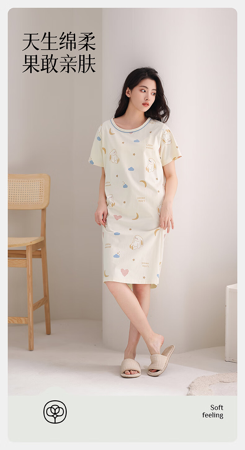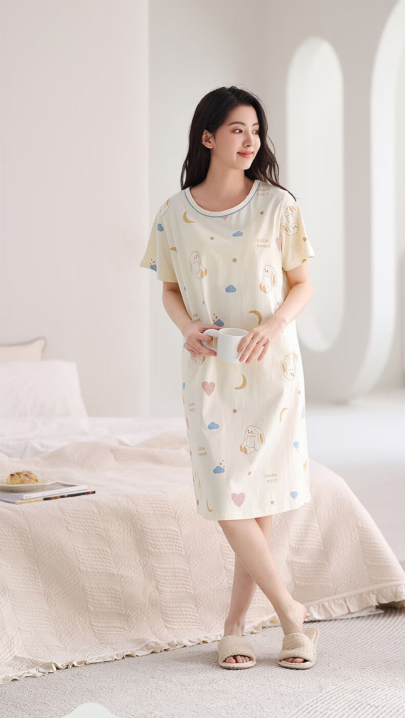 芬腾睡裙女夏季新款纯棉中长裙甜美可爱短袖薄款全棉大码睡衣裙 FX25290102浅杏 L 建议:110-125斤