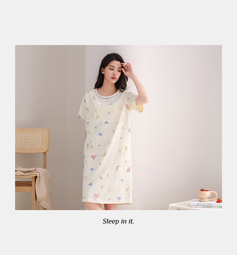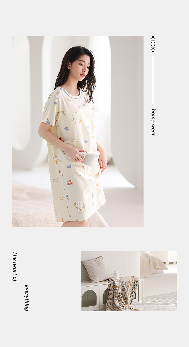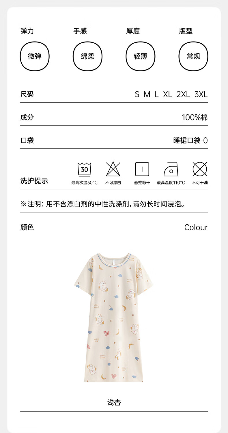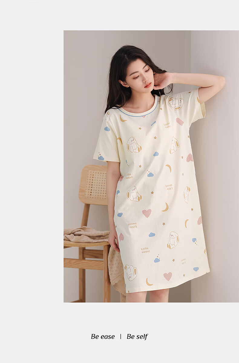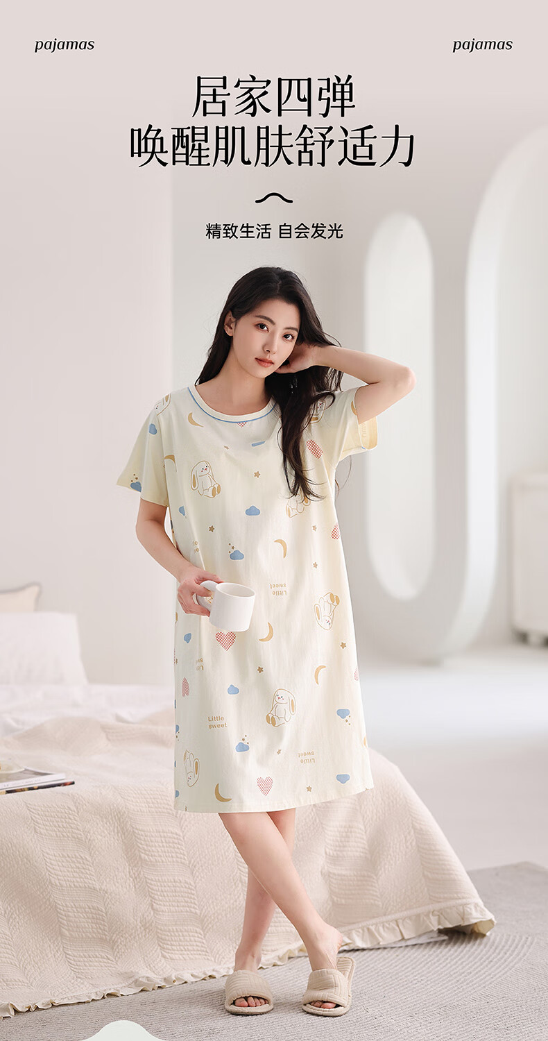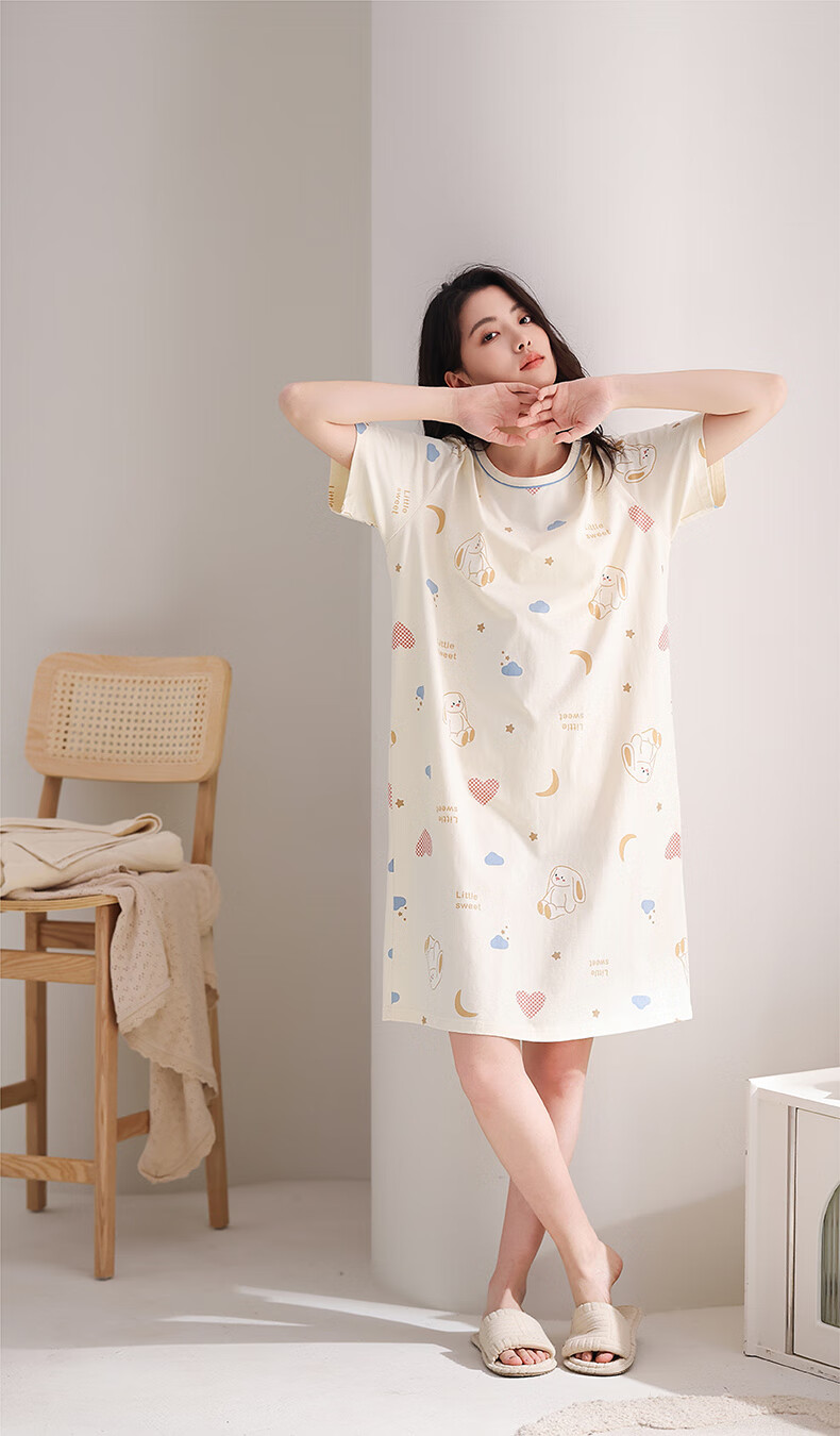芬腾睡裙女夏季新款纯棉中长裙甜美可爱短袖薄款全棉大码睡衣裙 FX25290102浅杏 L 建议:110-125斤
