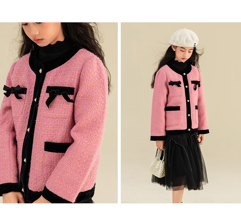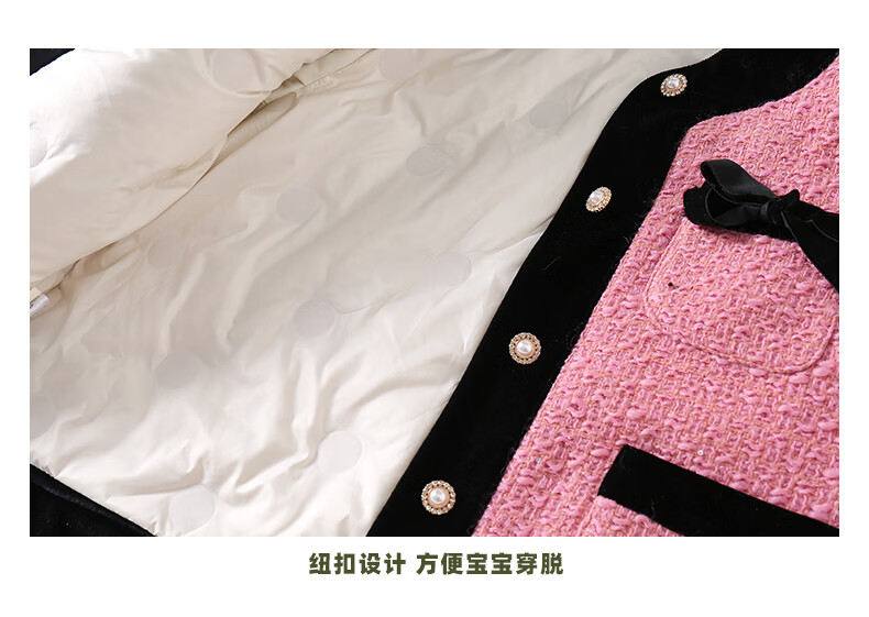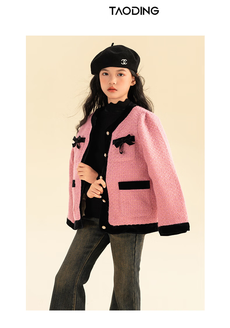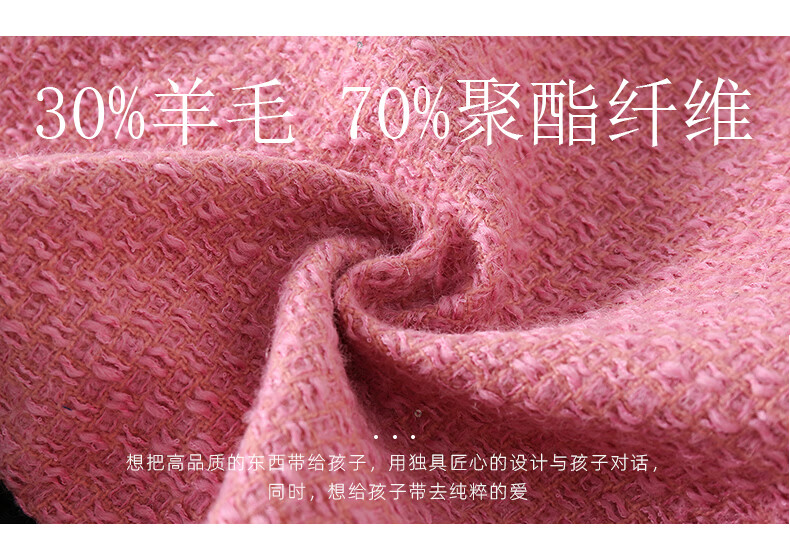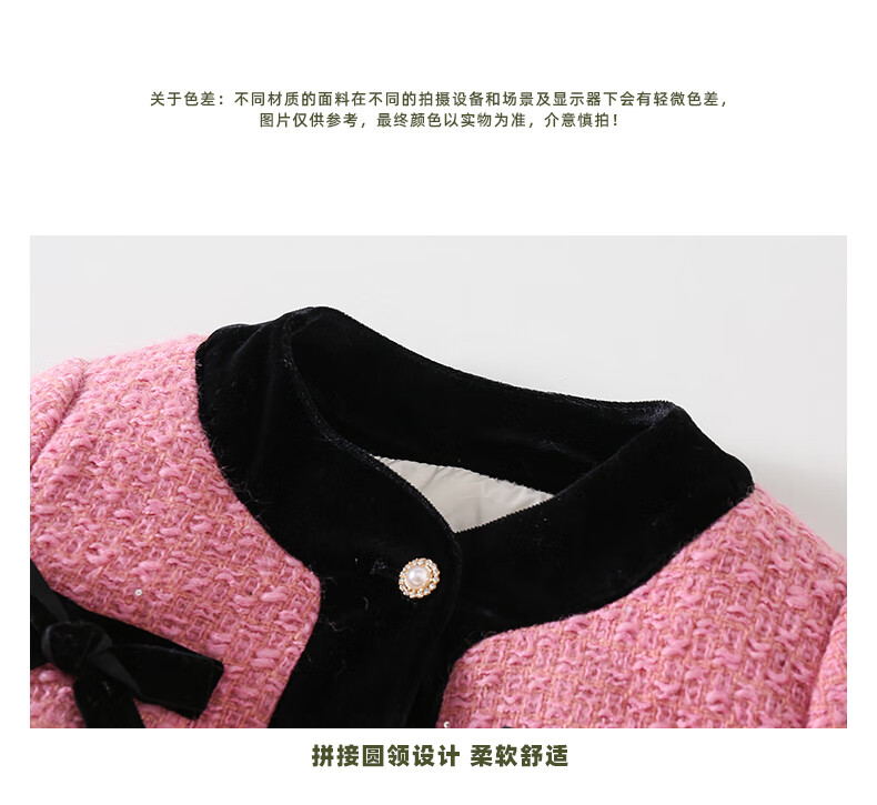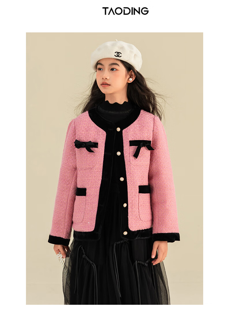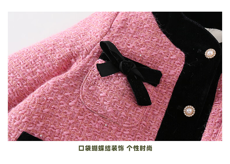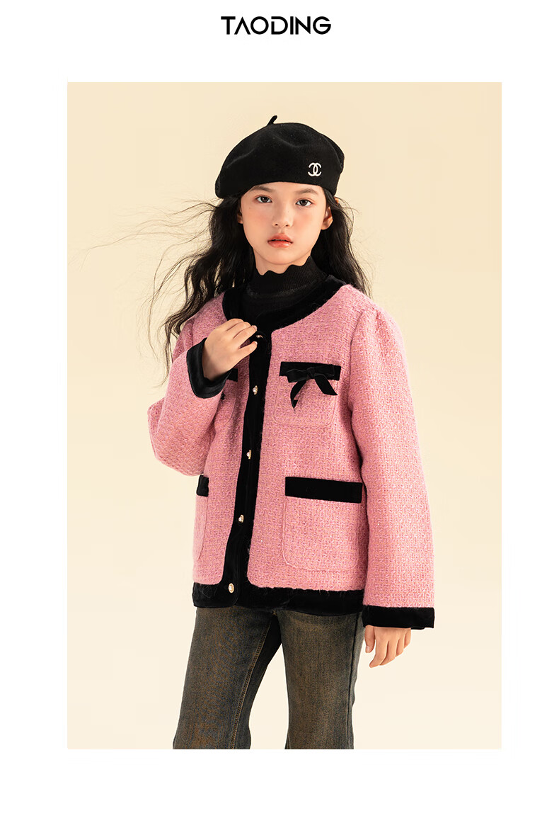 淘町女童香风外套秋冬中大童名媛羽绒内胆蝴蝶结粉色呢子外衣 粉色 羊毛呢+90绒内胆 110