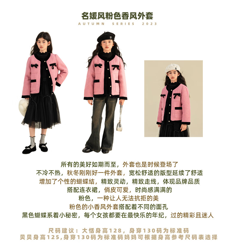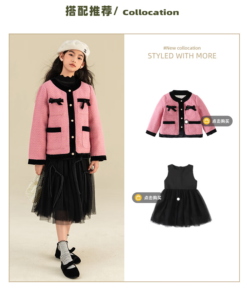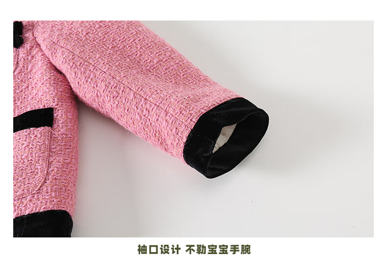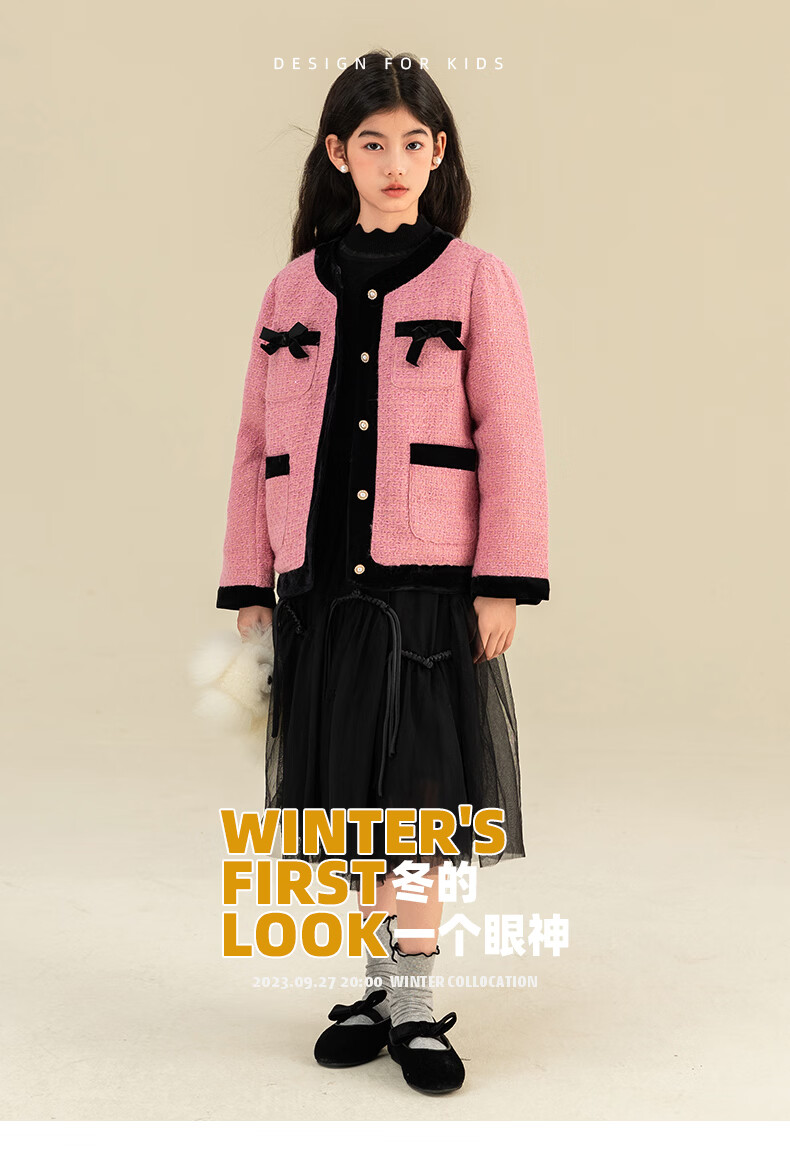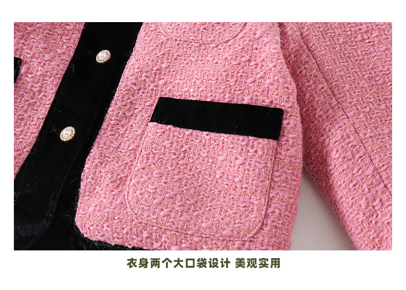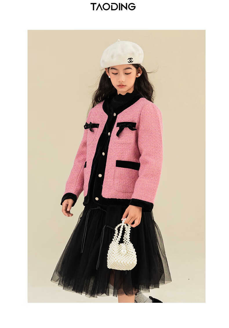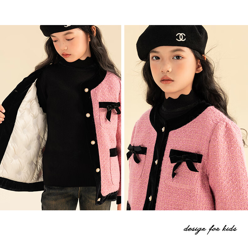 淘町女童香风外套秋冬中大童名媛羽绒内胆蝴蝶结粉色呢子外衣 粉色 羊毛呢+90绒内胆 110