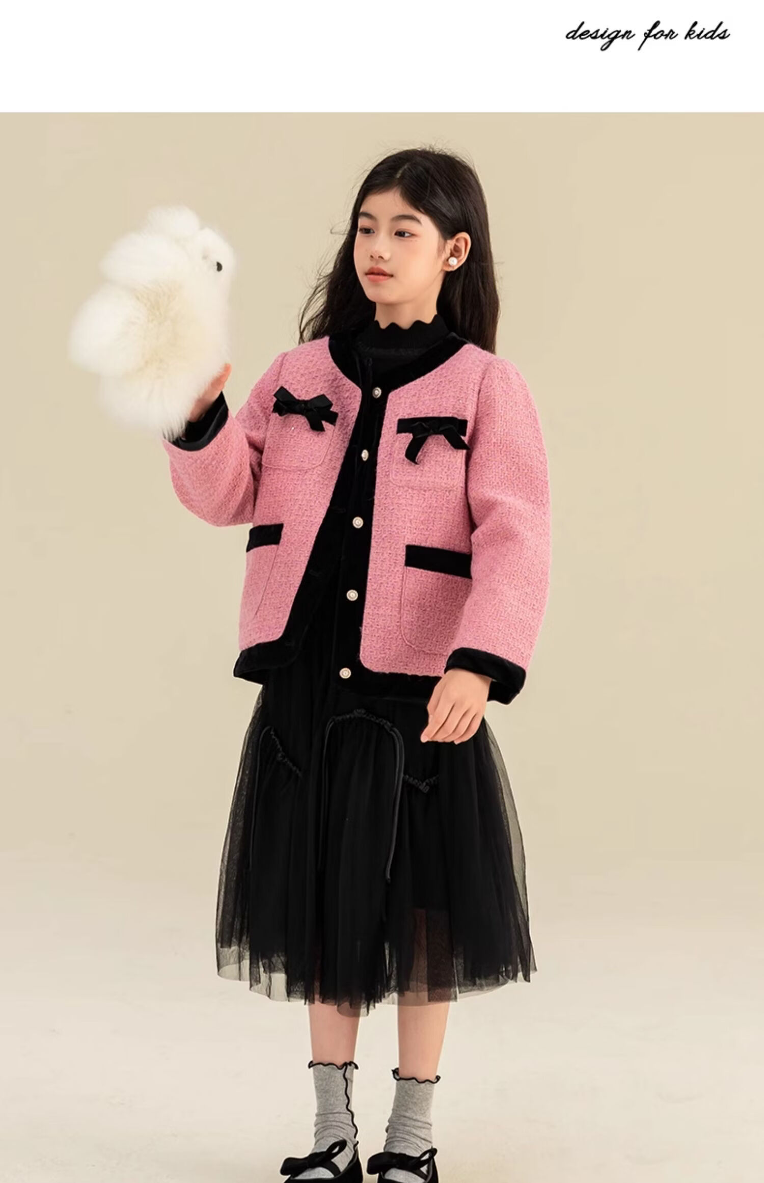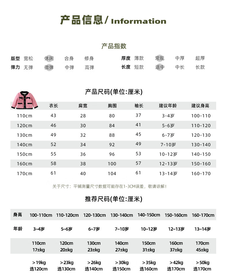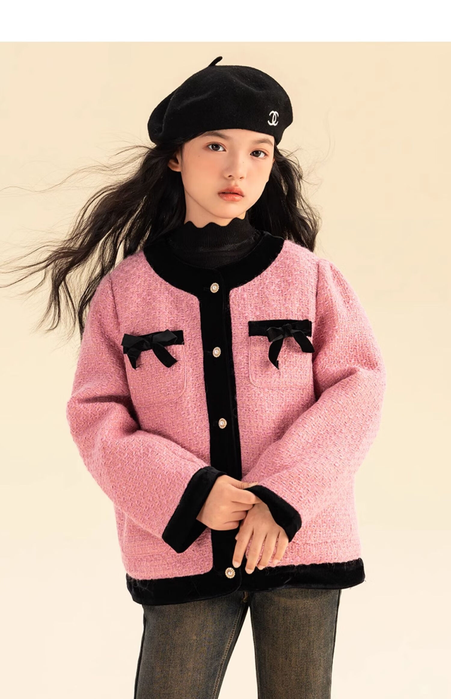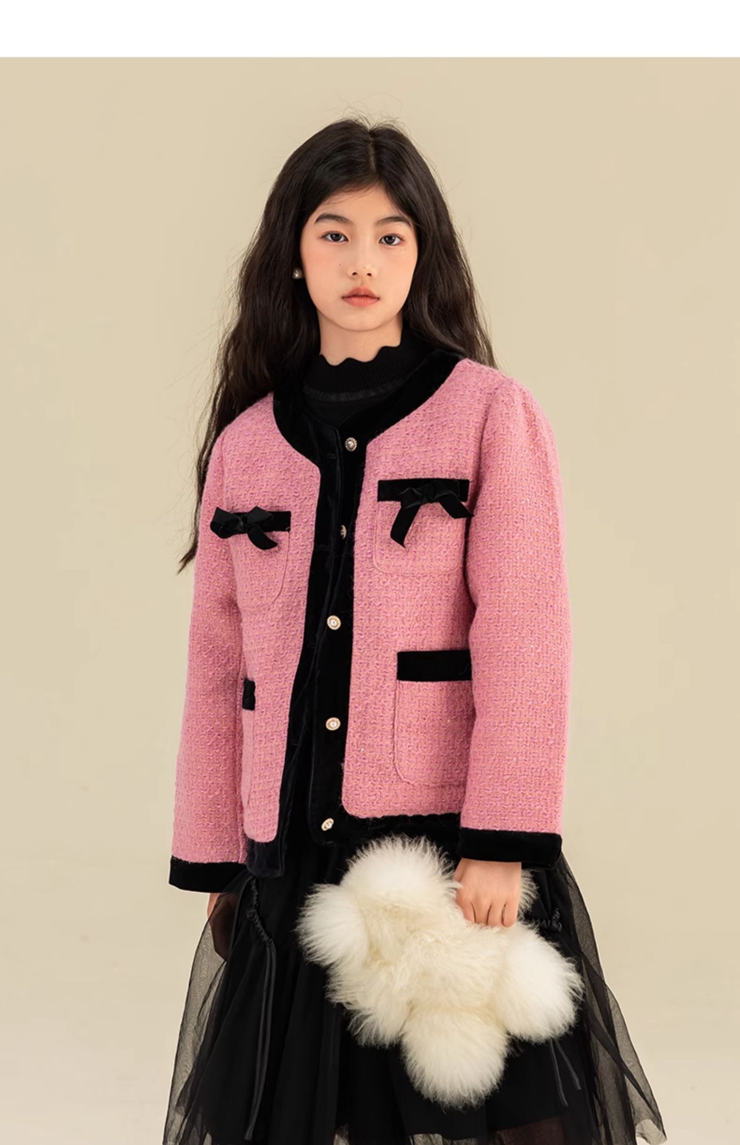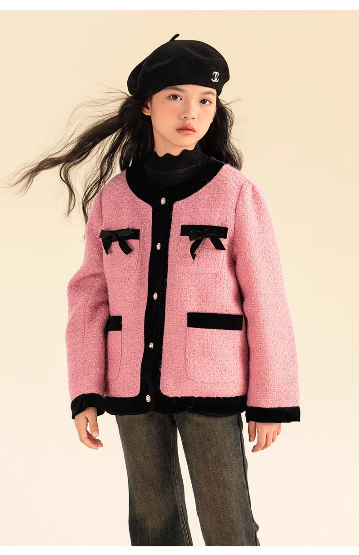 淘町女童香风外套秋冬中大童名媛羽绒内胆蝴蝶结粉色呢子外衣 粉色 羊毛呢+90绒内胆 110