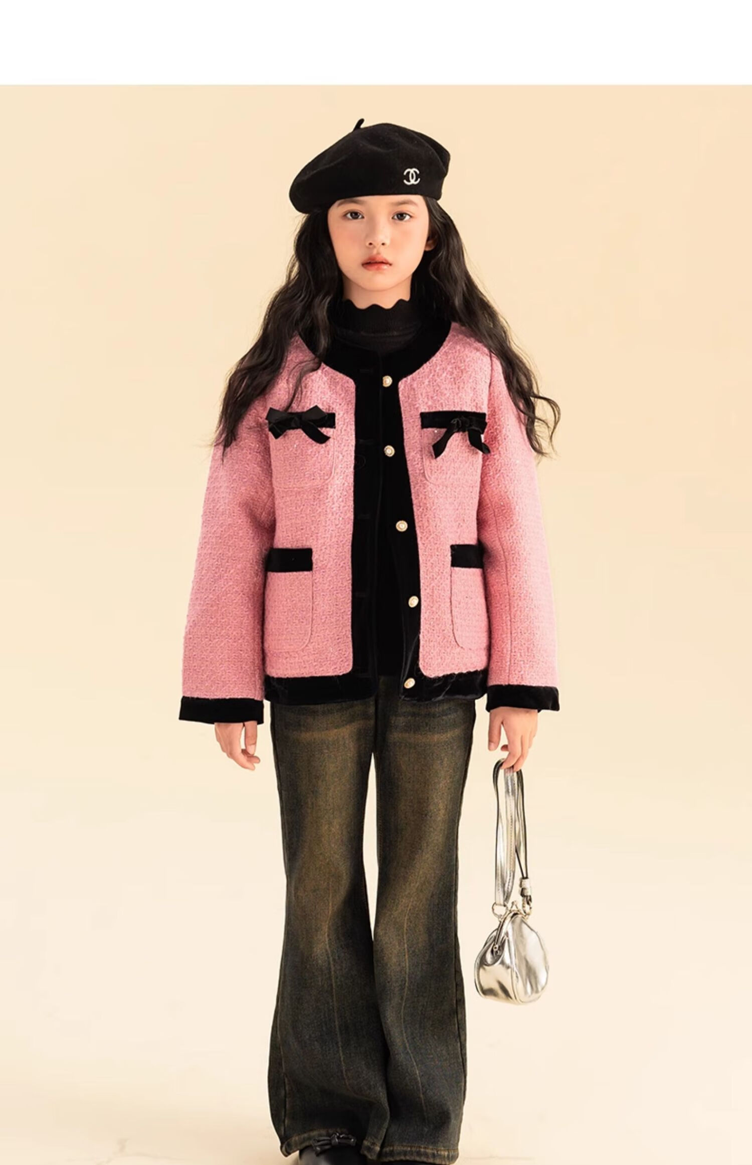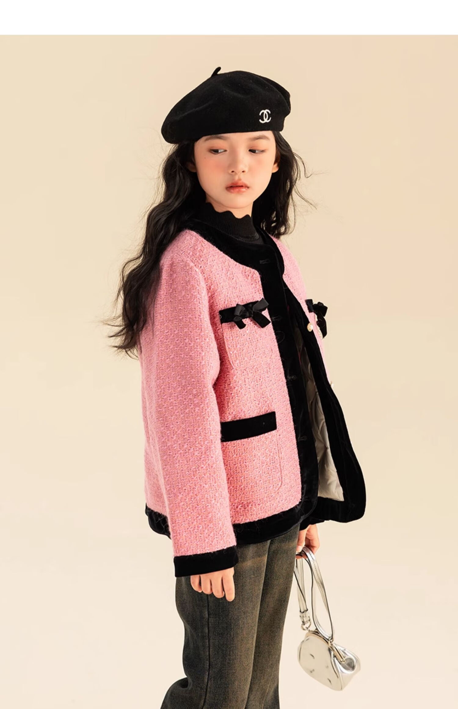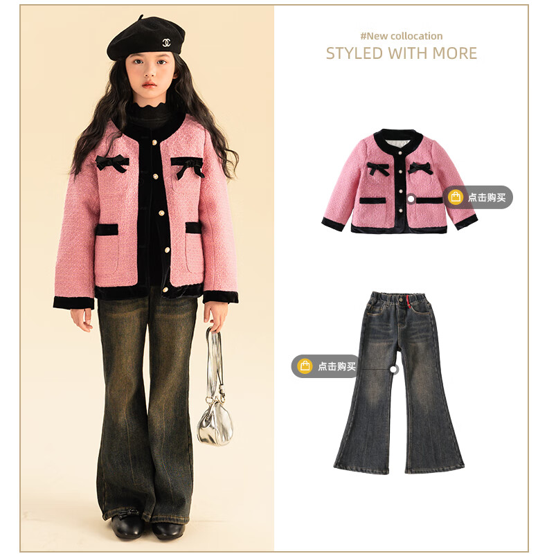 栀了成长记童装女童小香风套装2025冬季儿童蝴蝶结亮片夹棉两件套 粉色 套装 110 cm