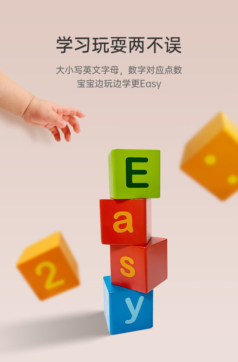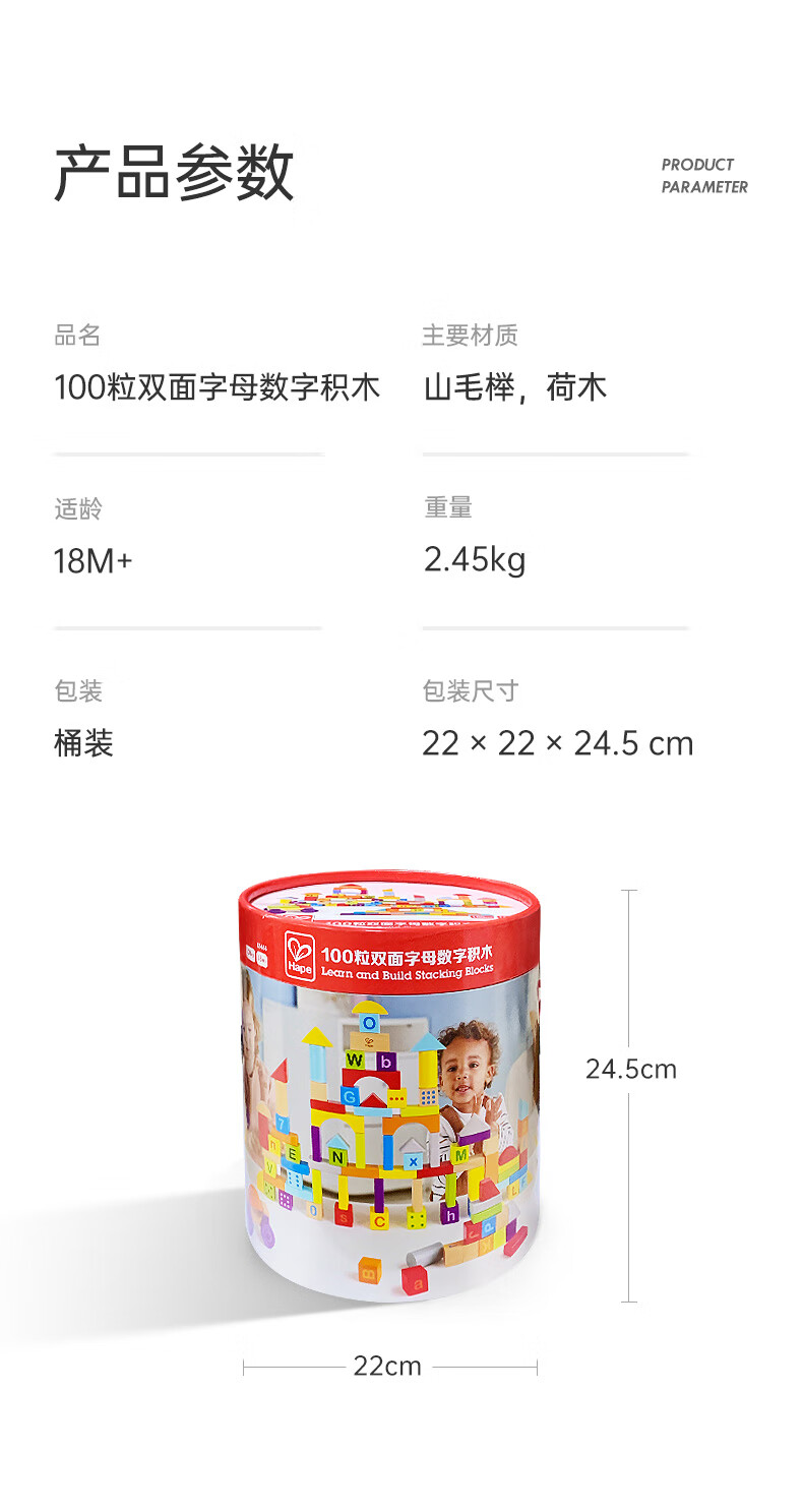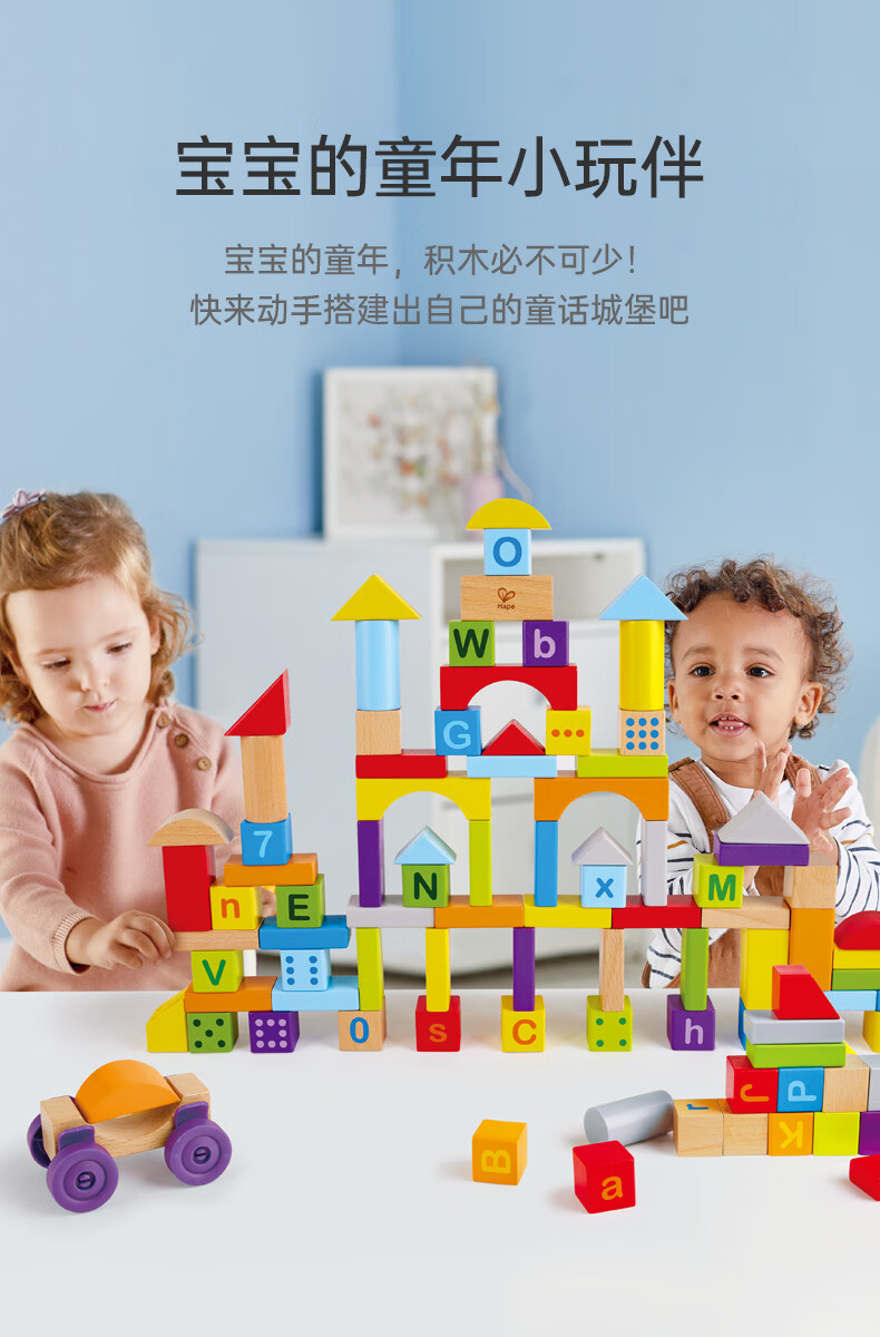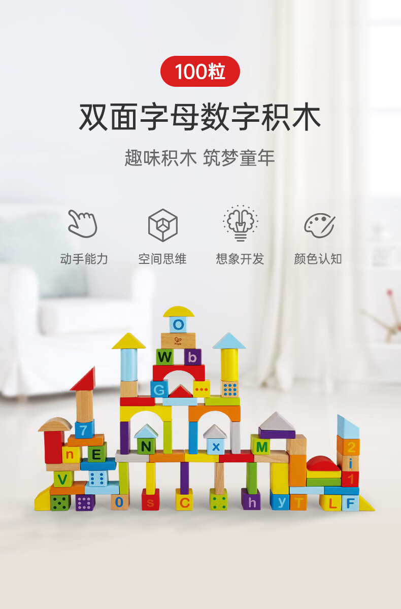 Hape(德国)儿童积木玩具木质100粒双面数字字母桶装宝宝生日礼物E8488