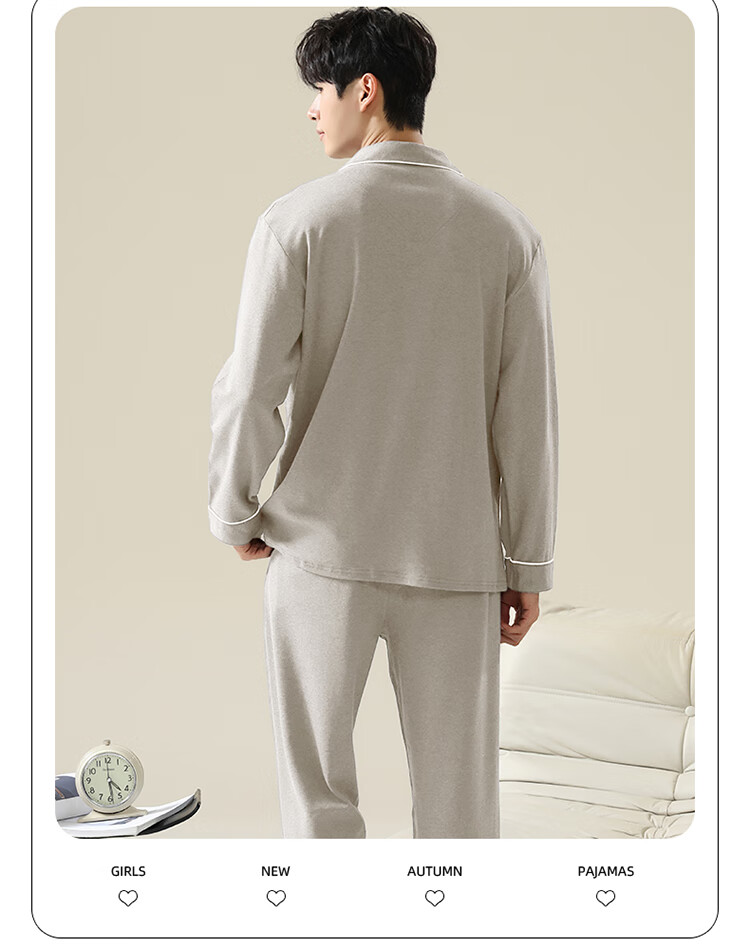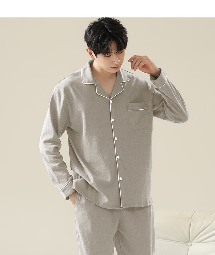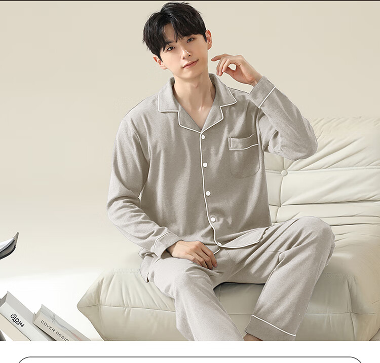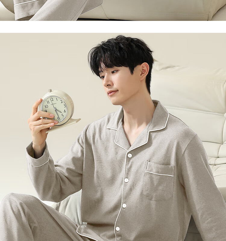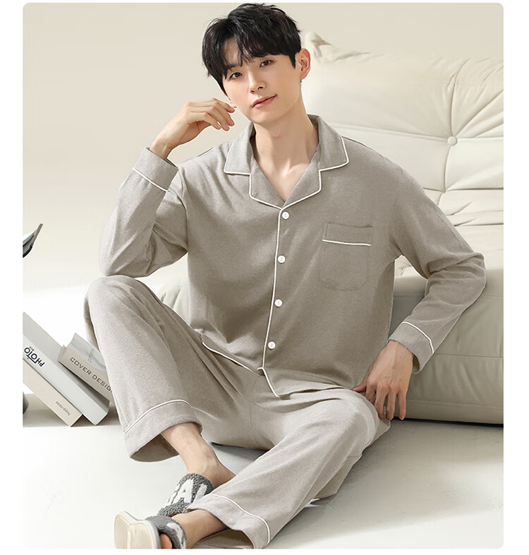 猫人纯棉睡衣男士夏季100全棉长袖长裤春秋开衫简约高级感家居服套装 浅灰色 【100%新疆棉,亲肤柔软】 XL 【推荐体重135-155斤】